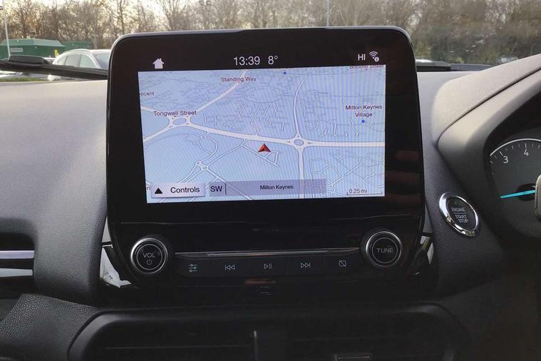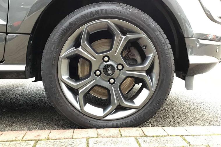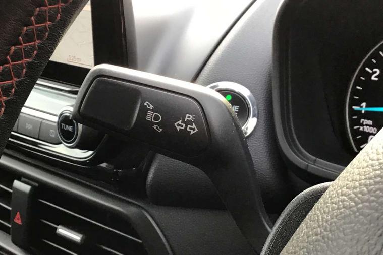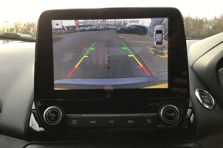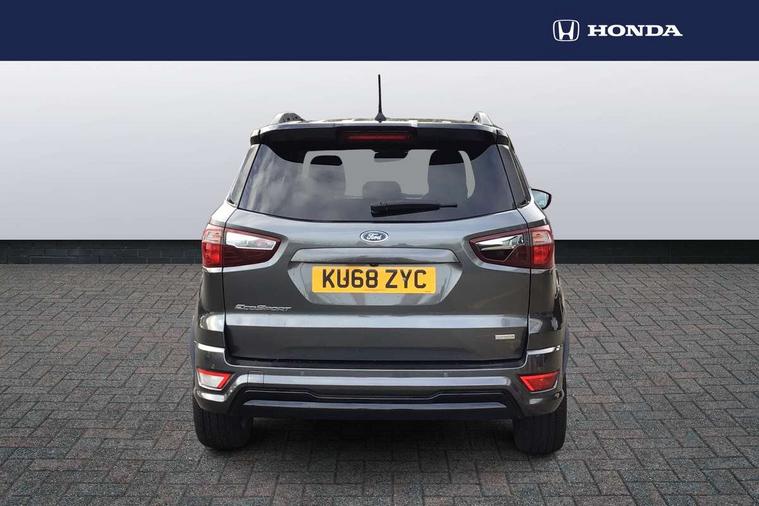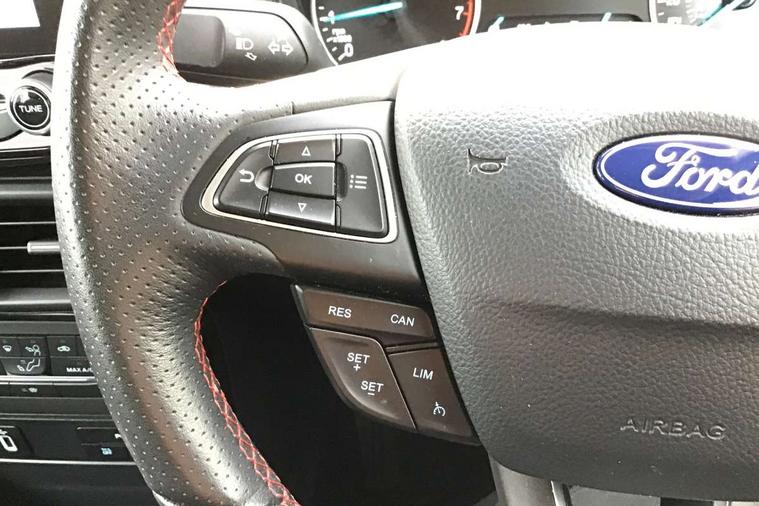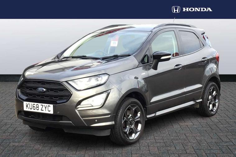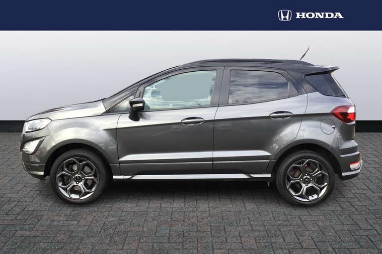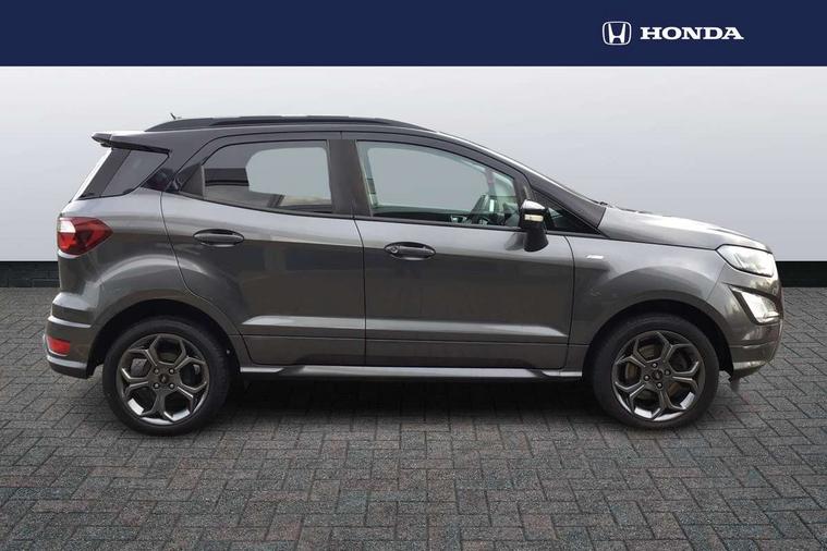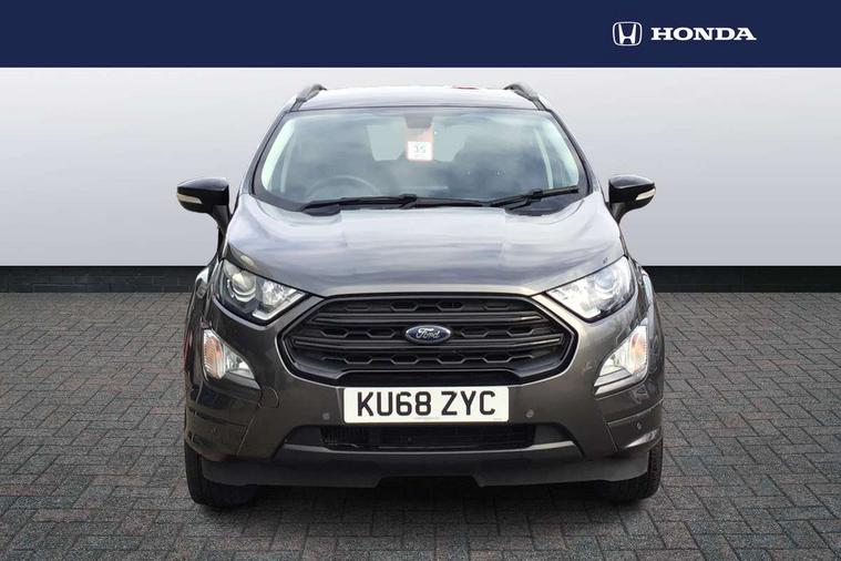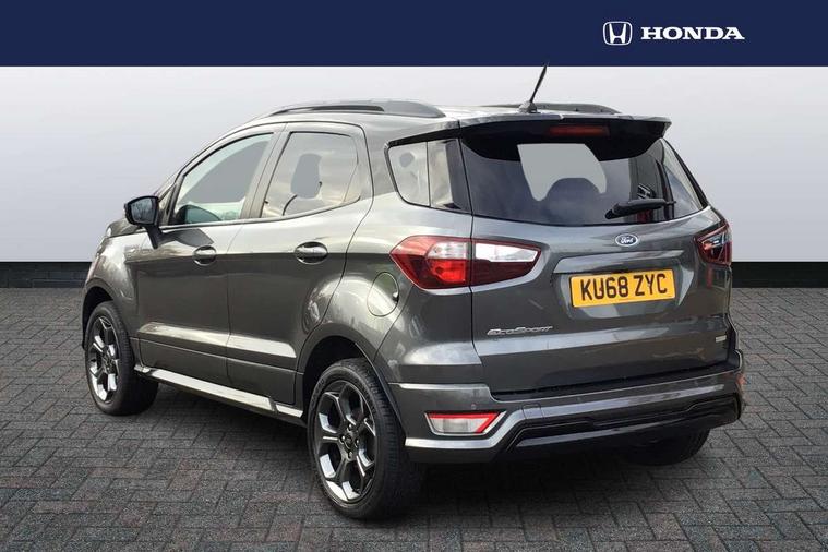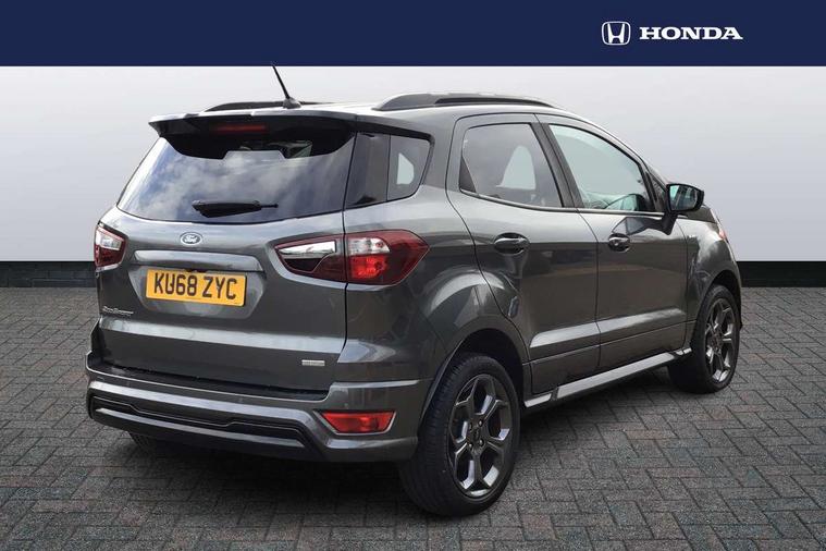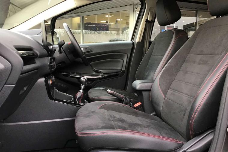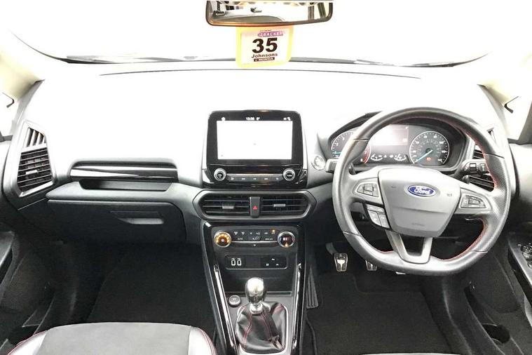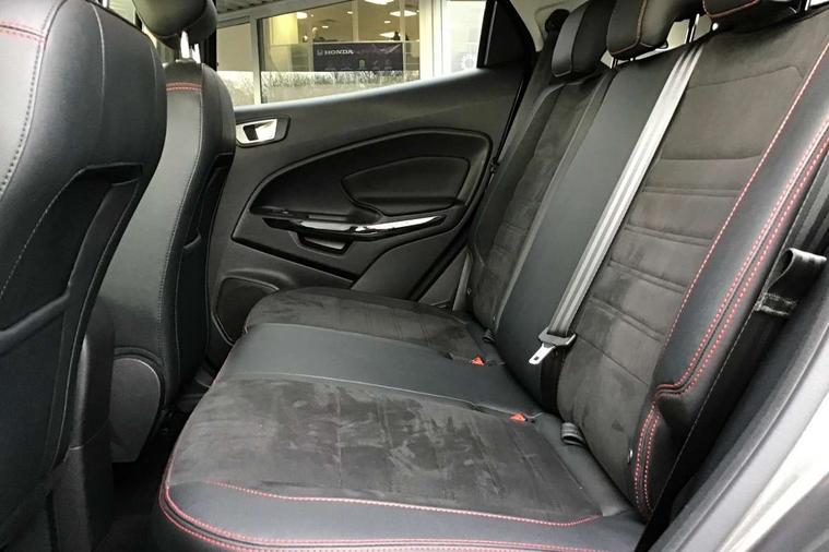 Cruise control, Easy fuel capless refuelling system, PAS, Trip computer, Sports suspension, Steering wheel mounted audio controls, 'Quickclear' heated windscreen/heated washer jets, Auto dimming rear view mirror, Automatic headlights, Black roof rails, Body colour door handles, Body coloured bumpers, Electrically adjustable and heated door mirrors, Front door threshold plates with ST-Line logo, Front fog lights, Headlamps with LED day running lights, Headlight levelling control, Large rear spoiler, Power foldable door mirrors with puddle lights, Power front and rear windows with global opening/closing, Rain sensing front wipers, Rear wiper, ST-Line body styling kit, ST-Line front grille, 12V socket in front and rear, 60/40 split rear seats, 7 shade adjustable ambient lighting, Ambient light, Centre console with sliding front armrest, Cooled glovebox, Courtesy lights with map reading light, Driver seat height/lumbar adjust, Driver's side glovebox, Driver/passenger sunvisors and lidded vanity mirrors, EATC - Electronic Auto Temperature control, Folding grab handles, Footwell ambient lighting, Front head restraints, Front seat back map pockets, Front/rear floor mats, Illuminated glovebox, Illuminated luggage compartment, Isofix system on outer rear seats, Leather steering wheel/gearshift/handbrake lever with red stitching, Luggage compartment carpet, Overhead console with sunglasses holder, Partial leather upholstery, Rake adjustable rear seats, Reach + rake adjustable steering column, Rear headrests, Stainless steel sports pedals, Steering wheel with chrome inserts, Storage drawers under front seats, Tie down hooks, Variable boot floor, Rear view camera pack - Ecosport, 3x3 point rear seatbelts, ABS, Child locks on rear doors, Curtain airbags, Driver airbag, Drivers knee airbag, Electronic Stability Programme with hill launch assist, Emergency brake assist, Front passenger airbag deactivation, Front side airbags, Passenger airbag, Seatbelt reminder for driver and front passenger, Traction control, Tyre pressure monitoring system, Immobiliser, MyKey system, Remote central locking, Thatcham 1 volume sensing alarm, Tyre inflation kit,
