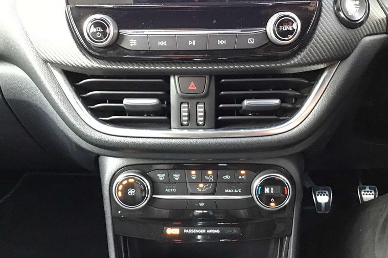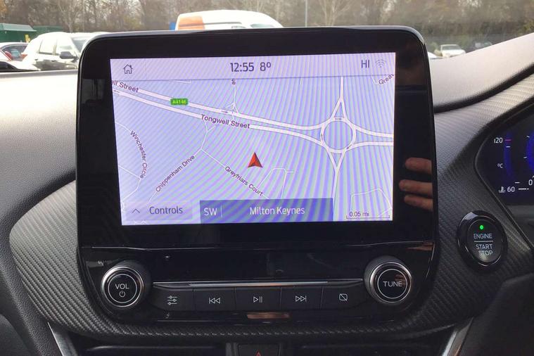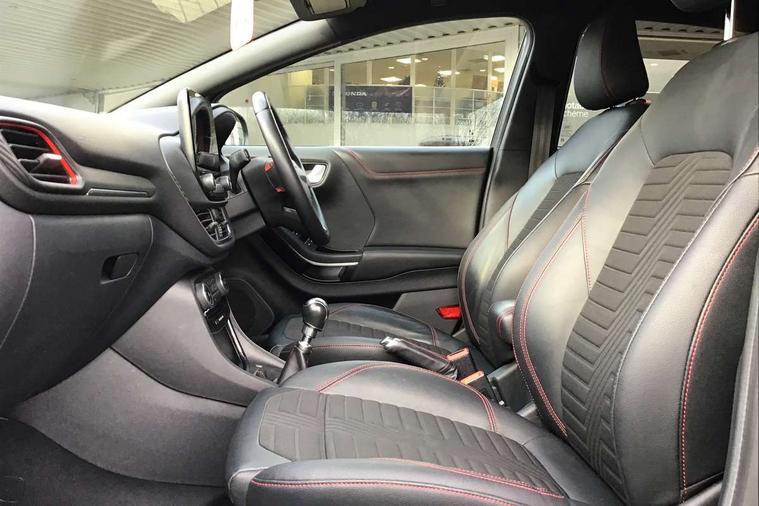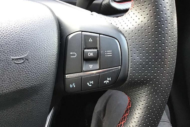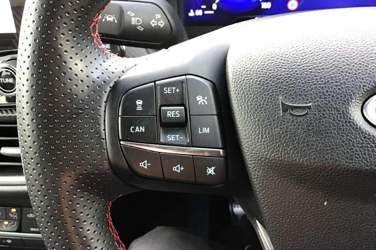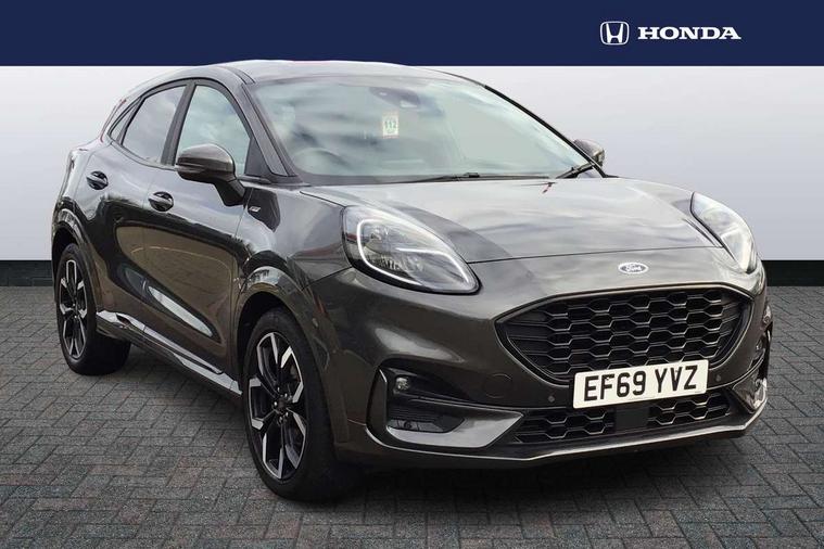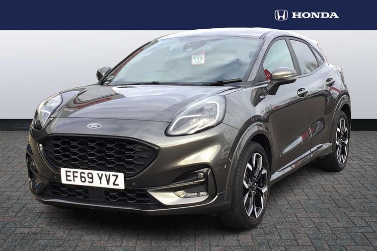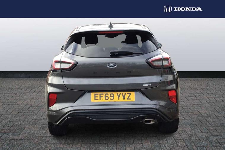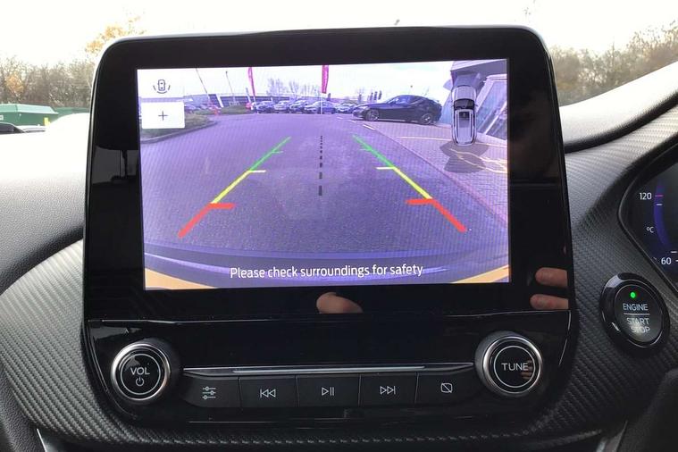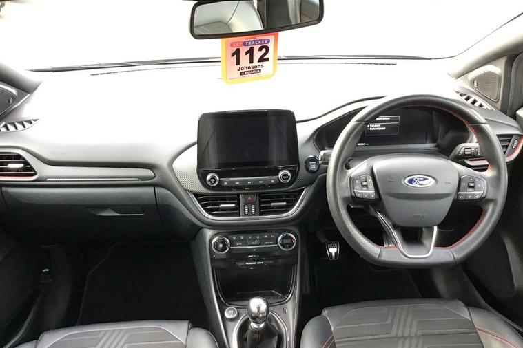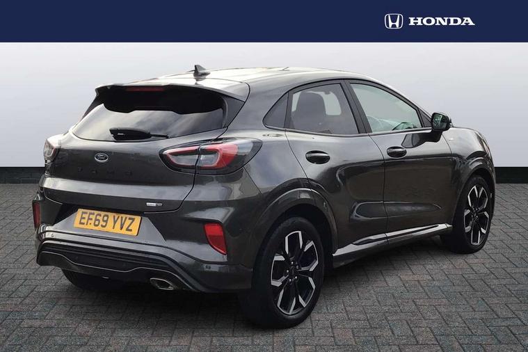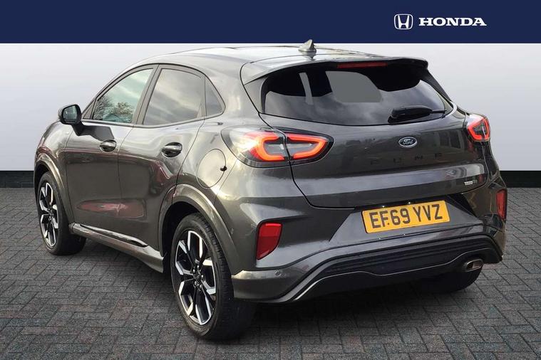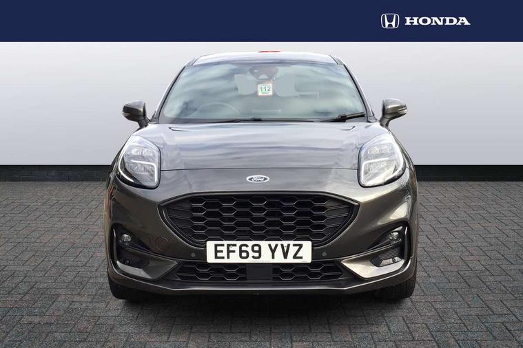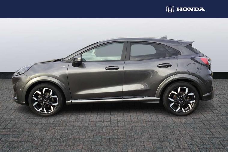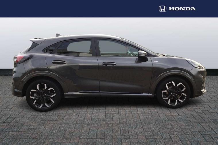 Ford easy fuel, Full digital 12.3" instrument cluster, Lane keeping aid with lane departure warning, Power liftgate hands free including keyless start + entry, motion sensing key fob, Rear parking sensor, Selectable drive modes(Normal, Eco, Sport, Slippery and Trail), Wireless charging pad, Automatic headlights with rain sensing wipers and auto high beam, Fixed LED headlamps, Front fog lights with cornering lights and LED rear lamps, Power foldable heated door mirrors with puddle lamps, Privacy glass to side rear windows and tailgate glass, Quickclear heated windscreen, ST-Line body kit with large rear spoiler wth sports suspension, Alloy sports pedals, Casual partial leather upholstery with salerno bolster, Centre console with armrest and stowage, Driver and passenger seat lumbar and height adjust, EATC - Electronic Auto Temperature control, Ford megabox extended bootspace, Front and rear floor mats, ST-Line flat bottomed leather steering wheel with leather handbrake and aluminium gear knob, B&O Premium Audio system + Ford SYNC 3 navigation pack - Puma, Driver assistance pack - Puma, 3 rear seatbelts, Electronic stability control (ESC) and hill start assist, Pre-collision assist with autonomous emergency braking, pedestrian/cyclist detection & post-collision braking, Tyre pressure monitoring system (TPMS), Thatcham alarm, Carbon look interior deco spears, 18" 5 spoke matt black machined finish alloy wheels, Tyre inflation kit,