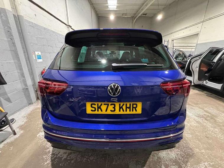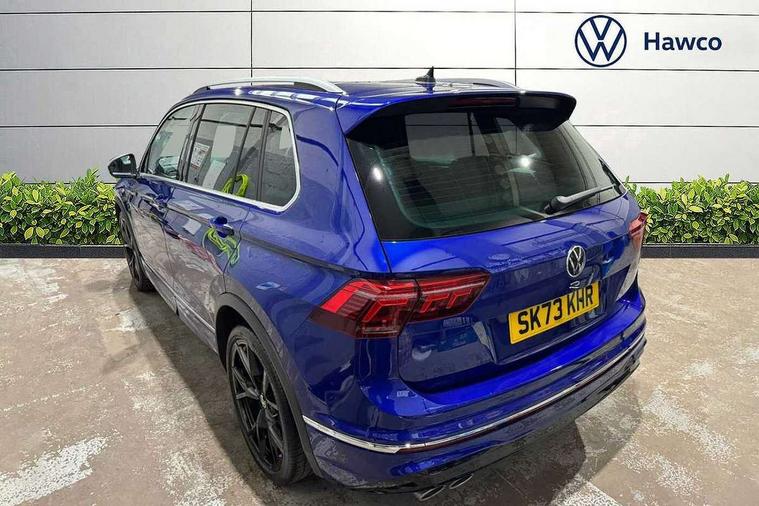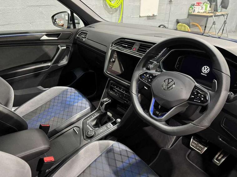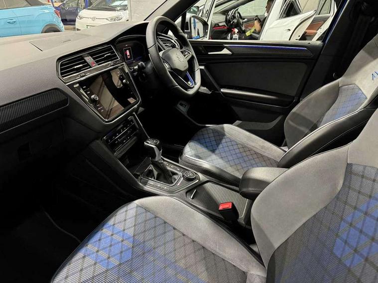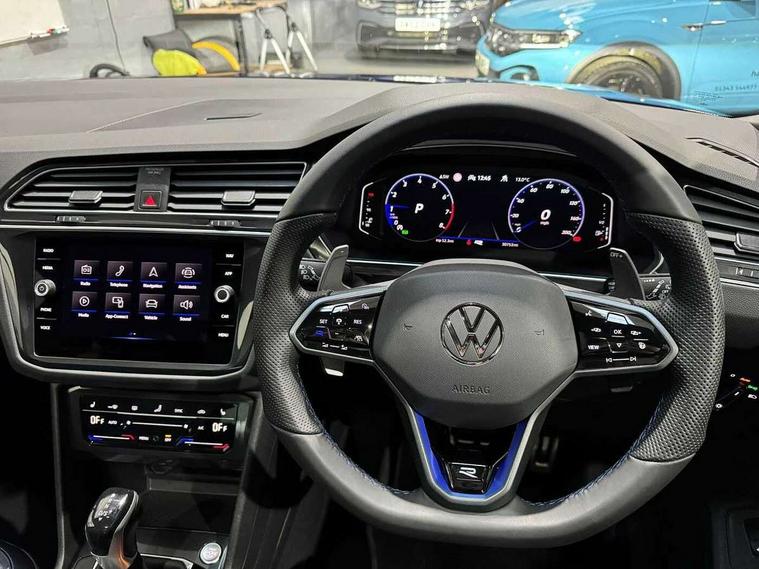 Adaptive cruise control ACC stop and go including speed limiter, App-Connect incl. App-Connect Wireless for Apple CarPlay and Android Auto, Bluetooth phone integration system, Distance control assist, Driver alert system, Driver profile selection, Dynamic road sign display, eCall emergency call system, Electromechanical speed sensitive power steering, Engine start/stop button, Instrument cluster mph speedometer Great Britain, Lane keeping system Lane Assist, Lights on warning, Motorised electric tailgate operated via key fob, drivers door and foot movement under tailgate, Multifunction front facing camera, Outside temperature display, Premium multifunction display with multi colour display, Rev counter, Revision / skills operating concept travel assistant, Service interval indicator, Speed limit display, Start/stop system with regenerative braking, Tailgate/trunk lid unlocking from outside, Trip computer, Warning sound and light for doors and tailgate open, ACC - Adaptive chassis contol with adaptive dampers, All wheel drive - 4Motion, Battery regeneration during braking, XDS electronic differential lock for improved traction and handling, Diversity antenna for FM reception, SD card slot, Simultaneous pairing of 2 compatible mobile devices, SMS functionality - read, compose and send SMS messages using touch-screen display, Title and cover art display, USB C ports, Auto dimming interior rear view mirror, Automatic headlight control system, Body colour door handles, Body coloured door mirrors with integrated indicators, Chrome matt mirror covers, Chrome moldings on the side windows, Coming/leaving home lighting function, Dynamic headlight range control, Front and rear electric windows, Front illuminated door sills with R logo, Heated rear window, High level 3rd brake light, IQ light-Adv high beam, Dynamic light assist for LED matrix headlamp+LED separate DRL+DCL, dark red rear LED tech, Poor weather light+ cornering light, Laminated safety glass windshield, heat and sound insulating, LED rear number plate lights, License plate carrier in front and rear, Poor weather light and cornering light, Privacy glass for rear side windows and rear window, R-Logo light projection, R-Logo on radiator grille with side panels and rear, R-specific diffuser, painted black with cut out for trailer hitch, R-Specific front and rear bumpers, Rain sensor windscreen wipers, Rear fog lamp, Rear side wing doors, Rear spoiler in R style, Rear windscreen washer and wiper with interval delay, Side and rear windows in heat insulating glass, Silver anodised roof rails, Trailer Stability Programme, Windscreen wipers/ intermittent wipe + 4 position delay, 12V outlet in center console rear and in luggage compartment, 12V outlet in front and tray, 2 cup holders in front, 2 LED front reading lights, 2 LED rear reading lights, 3 bench rear seats in 2nd row, 3 rear headrests, 4 load lashing points, 40:20:40 split folding rear seats, Air Care Climatronic 3 zone automatic climate control with enhanced air filter and controls in the rear, Backrest release for left front seat, Black headlining, Climate control unit rear with touch function, Door and side trim panel in foam film, insert in leatherette, Floor mats with R-Logo and stitching, Front centre armrest, Front footwell illumination, Front seats head restraints (x-adjustment), Height adjustable front seats, Height/reach adjust steering wheel, Instrument lighting white adjustable panel illumination, Interior light with delay, Isofix Preparation 2 Rear child seats, Leather gear knob, Lighting door sill trim at front with R Logo, Lockable cooled glovebox, Luggage compartment lighting, Luggage net, Pedals and footrest in stainless steel, R Specific key caps, R-specific sport skin with R Logo in active Info dsiplay, R-taster (direct selection of race mode/ flap control), Rear bench seat asymetrically split folding, longitudinally movable and folding with load-through hatch and center armrest, Remote unlocking for rear seat backrest, Removable luggage cover, Removable rear headrests, Safety optimised front head restraints, Single front passenger seat, Sliding/reclining rear seats, Standard rear seat release, Storage compartment in driver's door, Storage compartment in passenger's door, Storage compartment in rear doors, Storage compartments in luggage area left and right, Storage tray on dashboard, Sun visors with illuminated vanity mirrors, Top sports seats integrated headrest, blue R-Logo in front seats, seat centre panels and outer rear seats in fabric inner side bolster art Velors, Variable boot floor, height adjustable and removable, Easy open and close pack with safelock - Tiguan, 3 point seat belt for centre rear seats, 3 point seat belts with seat belt pretensioners for the outer rear seats, Active bonnet, Curtain airbags for front and rear passengers, Driver/Front Passenger airbags, Drivers knee airbag, Electronic parking brake with auto hold, Electronic Stability Control with driver steering recommendation, ABS, ASR, EDL, EDTC and trailer stabilization, Front assist with autonomous emergency braking (for Adaptive Cruise Control ACC up to 130 mph), Front disc brakes, Front passenger airbag deactivation, Front side airbags, Height adjustable front 3 point seatbelts + pretensioners, Hill hold control, Manual child proof rear door locks, Pedestrian monitoring system, Power assisted brakes, Proactive passenger protection system in combination with front assist, Rear disc brakes, Rigid safety cell with front and rear crumple zones, Two tone horn, Tyre pressure monitoring system, Warning sound and light for front seat belts if unfastened, Anti theft alarm system with interior monitoring, backup horn and towing protection, Anti theft wheel bolts, Central locking system with safelock radio remote control and 2 remote control folding keys, Electronic engine immobiliser, Tool kit, Tyre mobility kit Includes 12V compressor and tyre sealant,