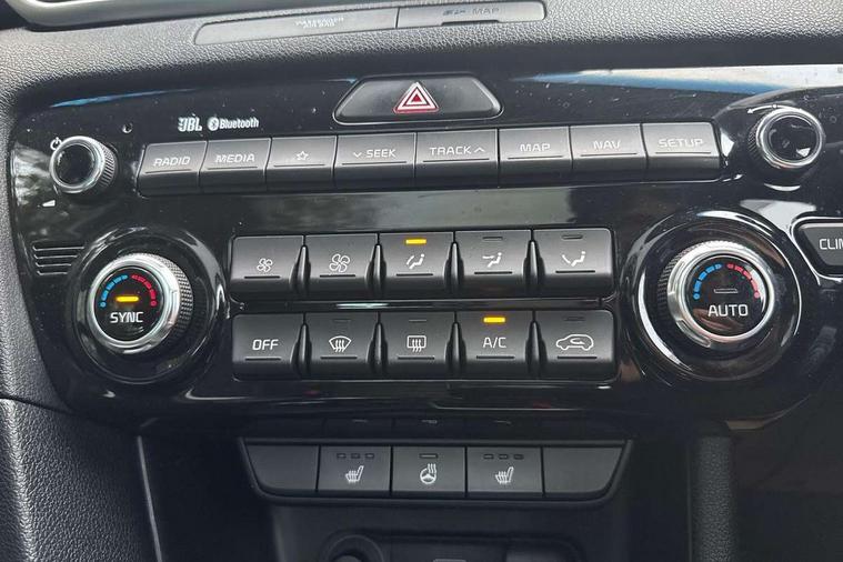 360 degree around view monitor, 4.2" supervision colour cluster display, 8" touchscreen satellite navigation with European mapping and traffic messaging channel, Android auto with voice control, Apple car play with voice control, Blind spot collision warning, Bluetooth connectivity with voice control, Cruise control + speed limiter, Drive mode selector, Driver attention warning, Emergency stop signalling system, Forward collision avoidance assist, Front parking sensor, Kia connected services featuring TomTom live, Lane keep assist, Rear parking sensor, Speed limit information, Speed sensitive power steering, Trip computer, Windscreen washer level indicator, Intelligent Stop and Go, Bluetooth audio streaming, DAB Radio with MP3, JBL Premium sound system with 8 speakers, external amp, subwoofer and front centre speaker, Rear USB port, Steering wheel mounted audio controls, USB/iPod/auxiliary input connections, All round electric windows with drivers auto up/down function, Auto dimming rear view mirror, Automatic defog system, Automatic headlights, Automatic lighting control, Black wheel arch body mouldings and side sills with chrome insert, Body colour door handles with chrome inserts, Body colour door mirrors, Chrome front bumper insert, Chrome grille surround, Chrome window surround, Electric panoramic glass sunroof (Electric one touch with safety function), Electrically adjustable/heated/folding door mirrors with LED indicators, Front wiper de-icer, High beam assist, High gloss black diamond mesh radiator grille, LED Bi-Function headlights, LED daytime running lights, LED rear lights, Privacy glass (rear side windows and rear screen), Projection front fog lights, Rain sensing front wipers, Rear spoiler, Rear wiper, Roof rails, Shark fin antenna, Silver painted front and rear skid plates, Speed sensitive front wipers, Tinted glass, Trailer stability assist, Welcome and follow-me home light functionality, Wide view drivers door mirror, Windscreen wiper de-icer, 10 way driver/8 way passenger electrically power adjustable seats, 12V power in front and rear centre console, 3 x passenger assist grips, 60/40 split folding rear seat, Air filter, All-round height adjustable headrests, Aluminium door scuff plates, Centre console storage box, Door armrest in leather, Driver and front passenger side sunvisors with illuminated vanity mirrors, Drivers seat power lumbar support, Dual zone automatic air conditioning, Front and rear door storage, Front cabin LED map light with sunglasses case, Front door courtesy reflectors, Front seat and rear pockets, Front/rear centre armrests, Gear shift indicator, Glovebox illumination, Heated front and outer rear seats, Heated steering wheel, Interior door lock/unlock function, ISOFIX Child seat top tethers and anchor fixings, Leather steering wheel, Leather trimmed gearshift, Leather upholstery, Light grey headlining, Luggage area LED light, Luggage area load cover, Luggage net hooks, Rear centre armrest with cupholder, Rear coat hooks, Satin chrome interior door handles, Side cabin LED lights, Tilt/telescopic adjustable steering wheel, Ventilation ducts to rear compartment, Active front headrests, All round 3-point seatbelts, Anti-lock braking system with electronic brakeforce distribution, Dual front side airbags, Electronic parking brake, Electronic stability control with downhill brake control, ESP + traction control, Front passenger airbag cut-off switch, Front seatbelt pretensioners + load limiters, Height adjustable front seatbelts, Hill start assist control (HAC), Impact sensing auto door unlocking, Rear door child safety locks, Twin curtain airbags with roll over sensor, Twin front airbags, Tyre pressure monitoring system, Advanced anti-theft system including immobiliser and alarm, Door deadlocks, Engine Start/Stop Button with Smart Entry System, Locking wheel nuts, Speed sensitive auto door locking, Visible vehicle identification number, High gloss black centre fascia, 19" Alloy wheels, Tyre mobility kit,