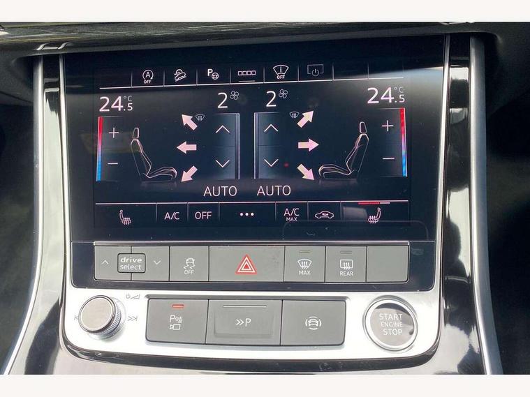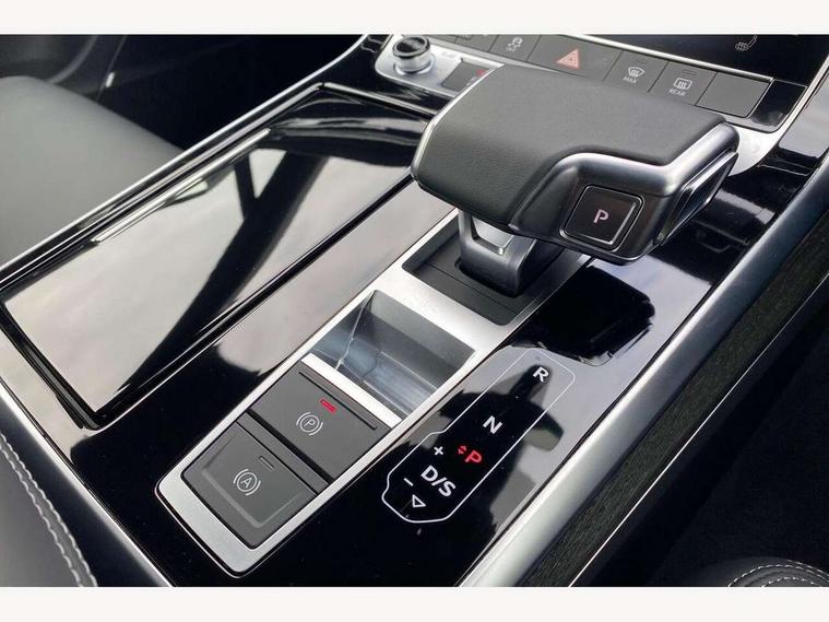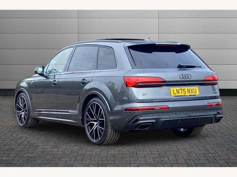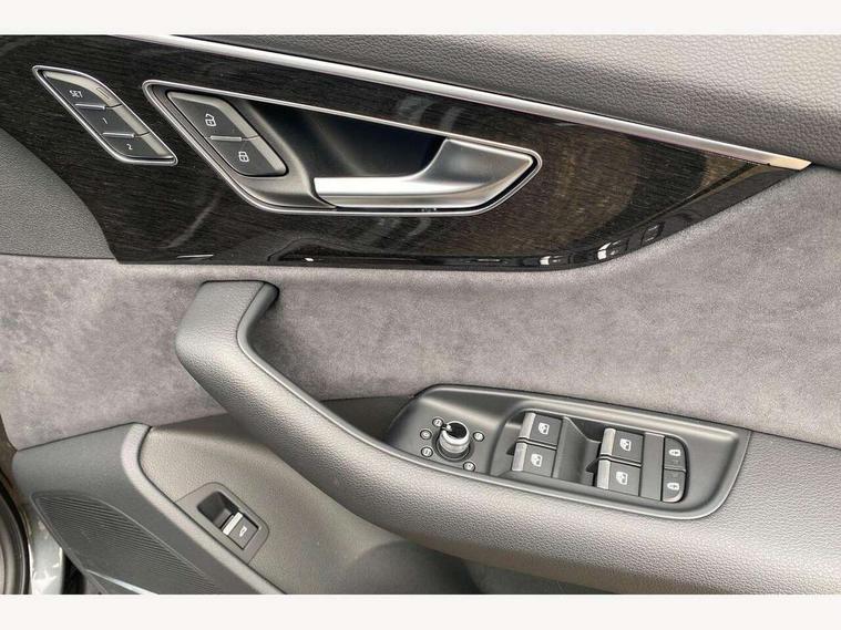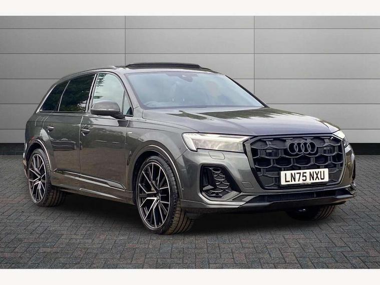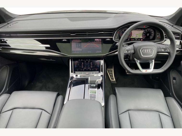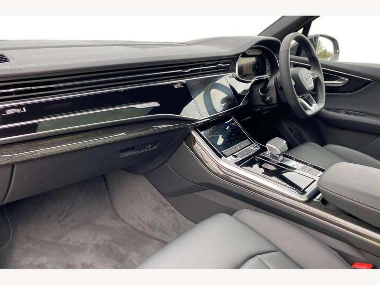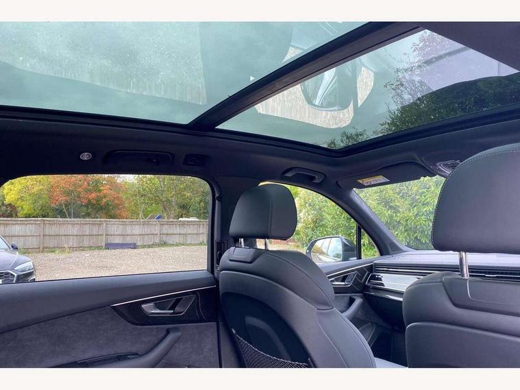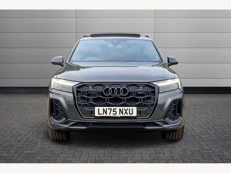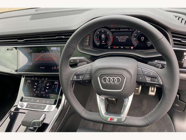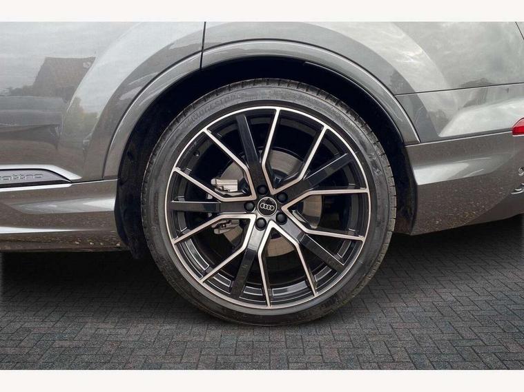 Audi connect safety and service (e-call), Audi connect with Amazon Alexa Integration, Audi drive select (Auto, Comfort, Dynamic, Efficiency, Individual, Off-road and All road), Audi phone box light with wireless charging, Audi virtual cockpit - 12.3" high-resolution LCD display with fully customisable instrument cluster, Bluetooth interface, Camera based traffic sign recognition, Electromechanical power steering, MMI navigation plus with MMI touch screens includes 10.1" and 8.6" screens with haptic feedback, Natural voice recognition, Operating buttons in Matte black, Parking system plus with 360 degree display (front, rear and side sensors) - acoustic and visual park assist system, Power operated tailgate, Rear view camera, Smartphone interface includes wireless Apple carplay/Android Auto, Start/stop system, 48V Mild hybrid technology, Adaptive air sports suspension, Quattro all wheel drive with self locking centre differential, Audi music interface - front 2 USB-C ports with charger and data functions, Audi sound system with 6 channel amplifier, 180 watt amplifying capacity and 10 loudspeakers including subwoofer, DAB digital radio module, Aluminium window trim, Audi Beam uses LEDs to project S emblem with red rhombus onto the ground when opening the side doors (front/rear), Auto dimming frameless rear view mirror, Black exhausts, Black roof rails, Electrically adj heated/folding + automatically dimming exterior mirrors with memory + automatic kerb side function for passenger side exterior mirror, Heat insulating glass in windshield, Integrated LED indications in door mirrors, LED 3rd brake light, LED daytime running lights, LED rear tail lights, Loading edge protection in stainless steel, Matrix LED headlights with dynamic front and rear indicators, Privacy glass - dark tinted rear and rear side windows from B-pillar backwards, Rear side wing doors, Rear wiper, 2 seat bench in 3rd row, 2 zone automatic climate control, 3 seat bench in 2nd row, 7 seat layout with ISOFIX points for the front passenger seat and rear passenger seat, Black carpets, Black cloth headlining, Comfort front centre armrest, Electric adjustable front seat with 4 way lumbar support, driver memory functionality, Folding rear seats, Front head restraints, Front/rear floor mats, Heated front seats, Illuminated door sill trims with S logo, ISOFIX child seat mounting for front passenger seat and 2 outer rear seats with top tether child seat mounting for all 3 rear seats, LED interior ambient lighting, Luggage compartment cover, Luggage compartment sill protection in stainless steel, Rear head restraints, Rear seat bench plus for the second row, with forwards/backwards sliding adjustment and backrest angle adjustment, Single front passenger seat, Stainless steel pedals, Sunvisors with illuminated vanity mirrors, Black styling pack plus - Q7, 3 point seatbelts on all rear seats, Audi pre sense basic, Audi pre sense front, Child locks on rear doors, Convenience key with safelock and gesture tailgate, Driver and front passenger, front side and curtain airbags, Electromechanical parking brake, Electronic Stabilisation Control (ESC) including ABS, ASR and EDL, Extended pedestrian protection measures, Hill hold assist, Seatbelt reminder, Tyre pressure loss indicator, Warning triangle and first aid kit, Anti theft alarm with tow away protection, Anti-theft wheel bolts and wheel loosening detection, Keyless Go, Remote central locking, Black dashboard, Polished oak trim with grey finish inlay, Tool kit, Tyre repair kit,