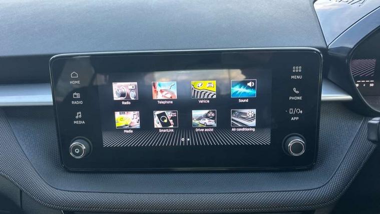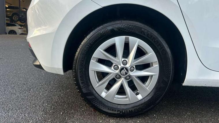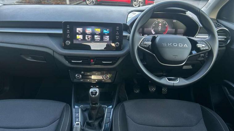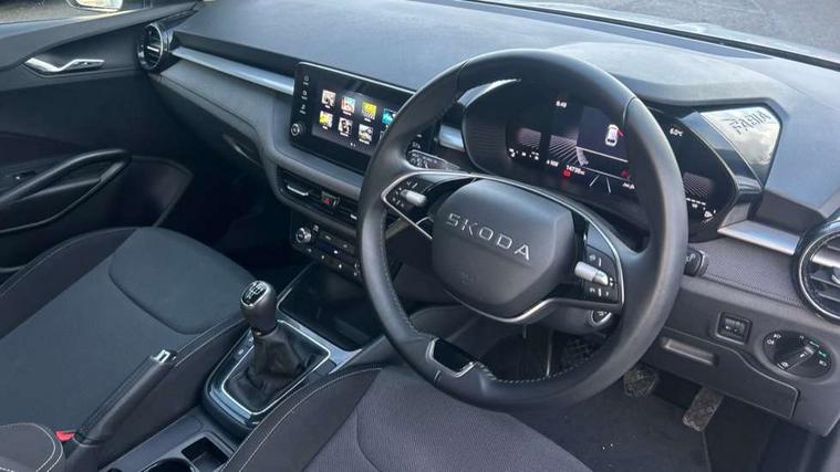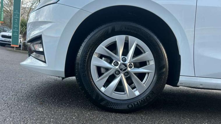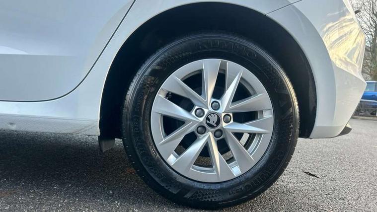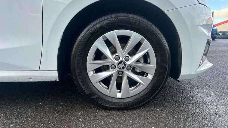 8" Digital instrument display, Advanced driver attention and drowsiness monitor, Bluetooth connection, Electromechanical power steering, Exterior temperature gauge, Service interval indicator, Traffic sign recognition, Wireless SmartLink for Apple CarPlay and Android Auto, 6 Speakers (4 in front and 2 in rear), 8.25" Skoda infotainment touchscreen display, Auxiliary socket for external MP3 player, DAB digital radio reception, Auto dimming rear view mirror, Body colour door mirrors, Body coloured bumpers, Door mirror integrated indicators, Front and rear electric windows, Front window wiper intermittent control, Headlight range control - Automatic, Ice scraper in fuel cap, LED 3rd brake light, LED daytime running lights with coming and leaving home feature, LED rear lights, Rear LED fog light, Rear side wing doors, Rear window wiper with washing nozzles, Roof mounted spoiler, SKODA tailgate lettering in chrome, Unique dark chrome design logo on alloy wheels, 2 reading lights in front and 2 reading lights in rear, 3 rear headrests, Backrest split and folding, Central console with removable cup holder and storage box, Chrome handbrake release button, Dual zone air conditioning with climatronic electronic control, Fabric upholstery, Front centre armrest, Gearshift knob/handle in leather, Grain satin black interior door handles, Hand brake lever handle in leather, Height adjustable front headrests, Height adjustable front seats, Height adjustable steering wheel, ISOFIX and TopTether anchorage points to the outer rear seats, ISOFIX and TopTether on the front passenger seat, Luggage compartment lighting, Manually adjustable lumbar support in front seats, Pollen filter, Rear seat bench unsplit, Single front passenger seat, Skoda lettering on steering wheel, Storm grey headlining, Sun visors with mirror and airbag label on passenger side, Textile floor mats, Ticket holder, Umbrella in drivers door, 3-point height adjustable front seats belts with pretensioner and force limiter, Automatic warning lights in case of crash, Driver and passengers airbag with switch off function, e-Call+, ESC including ABS, MSR, ASR, EDS, HBA and XDS, Front and rear seat belt warning, FRONT ASSIST (AEB City and AEB Inter Urban), Front side airbags, Head airbags, One tone horn, Pedestrian protection, Three rear 3-points safety seat belts with pretensioner and force limiter including stop function for outer rear seat belts, Tyre pressure monitoring system, Anti-theft alarm system including immobiliser, interior monitoring, backup horn, and towing protection, Central locking with radio remote control, interior controls, SAFE function and 2 foldable keys, Black painted air vents, Grain satin black central console cover, Metallic grey upper decorative trim, Satin black door and side trim panel in front, Textile Kota grey lower decorative inserts, Anti-theft wheel bolts protection, Super-low rolling resistance tyres,