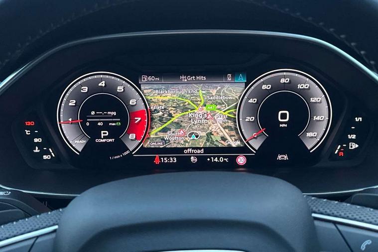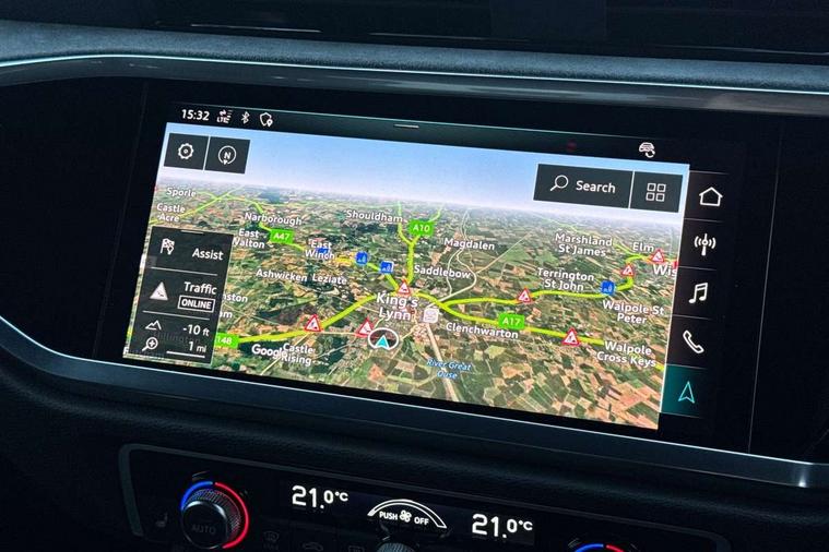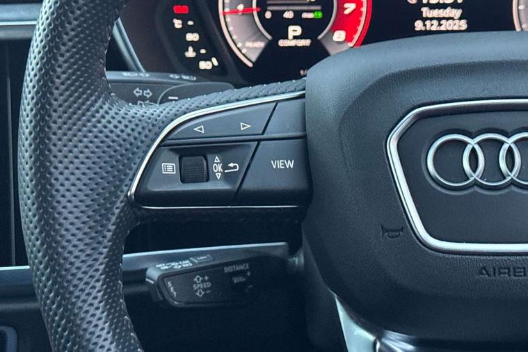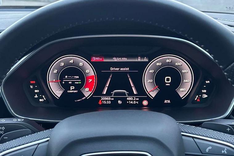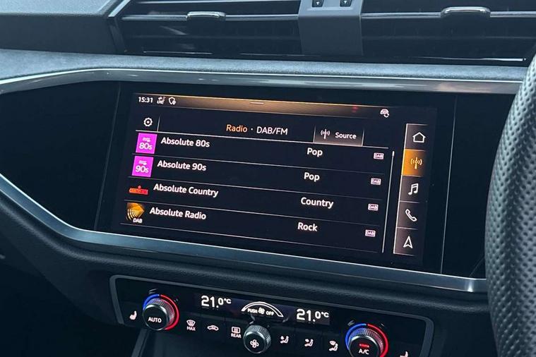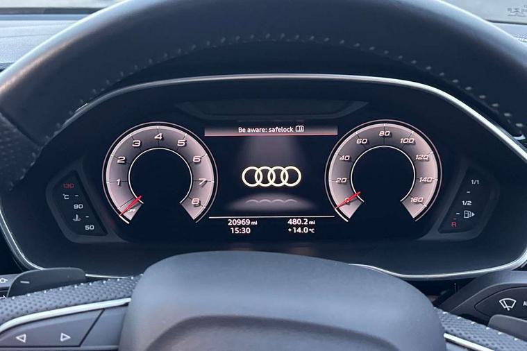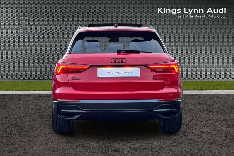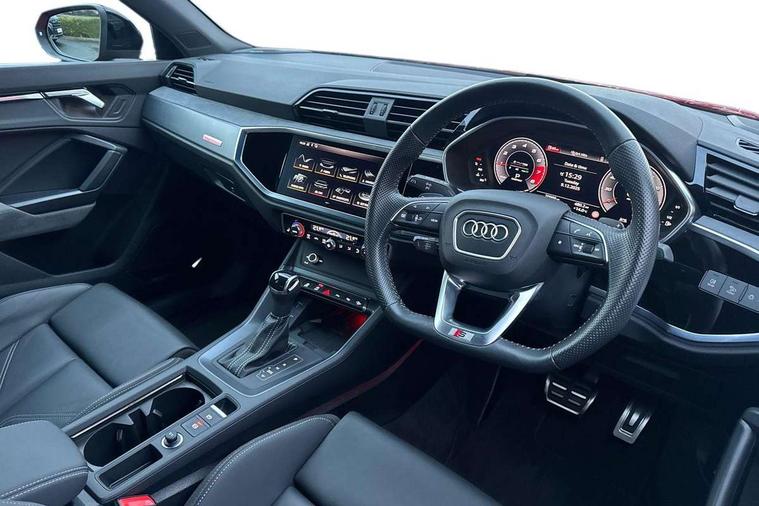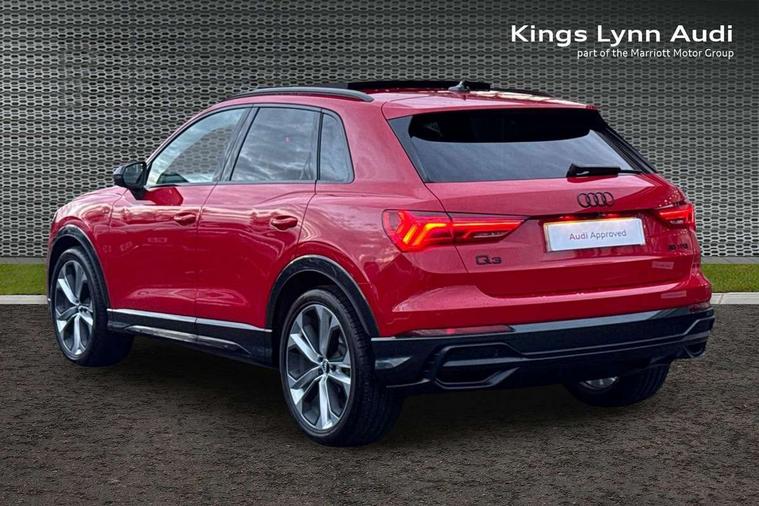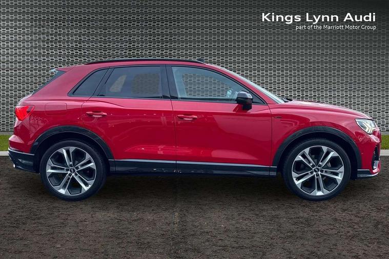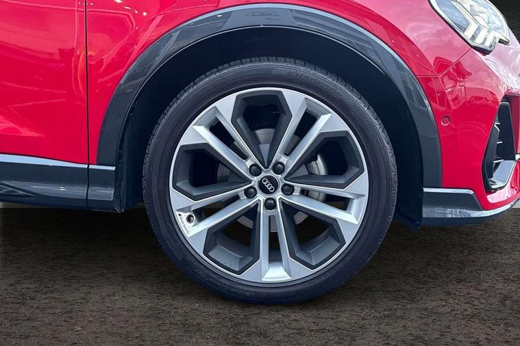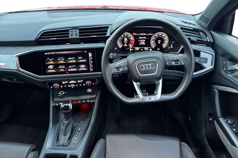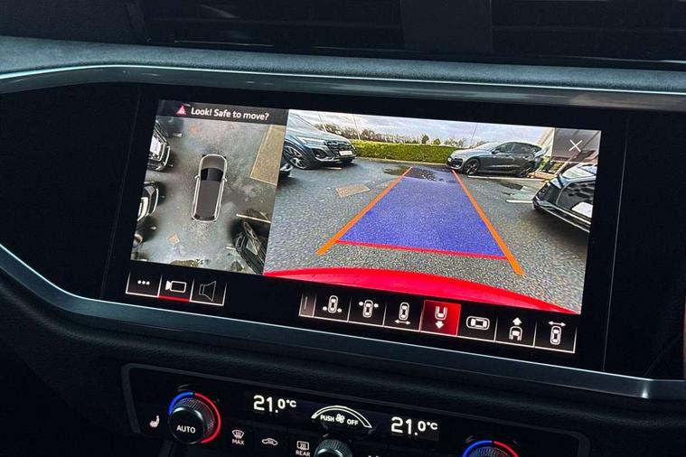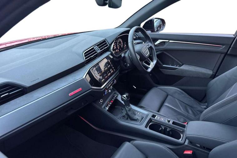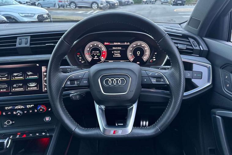 360 degree parking camera, Audi connect safety and service (e-call), Audi drive select, Audi lane departure warning, Audi phone box with wireless charging, Audi side assist, Audi virtual cockpit plus, Bluetooth interface, Camera based traffic sign recognition, MMI Navigation Plus with high resolution 10.1 inch touchscreen colour display, Power operated tailgate, Progressive steering, Rear cross traffic alert, Service interval indicator, Smartphone interface includes wireless Apple carplay/Android Auto, Start stop system with recuperation, Voice control system with natural language interaction, 48V Mild hybrid technology, Adaptive suspension with damping control, 1 x USB type C and 1 USB type A charging points, Bang + Olufsen 3D sound system, DAB digital radio module, Acoustic windscreen, Audi Beam uses LEDs to project the Audi Sport logo, Auto dimming door mirrors, Auto dimming frameless rear view mirror, Black roof rails, Electrically folding, adjustable and heated door mirrors with integrated LED side indicators and kerb view function for passenger side, Front and rear electric windows, Front fog lights, Front spoiler blade in matt platinum grey, Headlight washers, High gloss black finish B and C pillars, Matrix LED headlights with LED rear lights and dynamic front and rear indicator, Panoramic opening glass sunroof, Privacy glass dark tinted rear and rear-side windows (from B-pillar backwards), Rain and light sensors, Rear diffuser strip in matt titanium black, S line bumpers in contrasting Manhattan grey, 12V socket in rear centre console, 3 spoke flat bottomed high multi-function leather sport steering wheel with gearshift paddles, 4 way electric lumbar support for driver and front passenger, 40:20:40 folding with manual adjustment for 60:40 forwards/backwards position and backrest angle, Adjustable rear seat bench/backrest with centre armrest and cupholder, Black cloth headlining, Dual zone electronic climate control, Electrically adjustable front seats, Front and rear black floor mats with contrast stitching in rock grey, Front and rear headrests, Front and rear roof module including reading lights, Front centre armrest, Glove compartment lighting, Heated front seats, Height and reach adjustable steering wheel, Illuminated door sill trims with S logo, ISOFIX child seat mounting for front passenger with airbag deactivation and outer rear seat including top tether attachment point for outer rear seats, Luggage compartment light, Perforated leather gearknob, Stainless steel luggage compartment sill finisher, Stainless steel pedals, Black styling pack - Q3, Driver Assistance Pack - Q3, Multi coloured extended ambient interior lighting pack - Q3, Non smoking pack - Q3, 3x3 point rear seatbelts, 6 airbags - Driver, front passenger, curtain and side windows, Audi pre-sense front with pedestrain and cyclist recognition, Electrically operated child locks on rear doors, Electromechanical parking brake, Electronic stabilisation control including ABS, ASR and EDL, Hill descent control, Hill hold assist, Pre sense basic, Seatbelt monitoring, Tyre pressure warning, Warning triangle and first aid kit, Advanced key, Anti theft alarm, Anti theft wheel bolts, Remote central locking, Detail dashboard around MMI touch colour display in glass look, black with surround in aluminium look, Leatherette door armrest, Tool kit, Tyre repair kit,