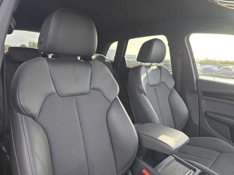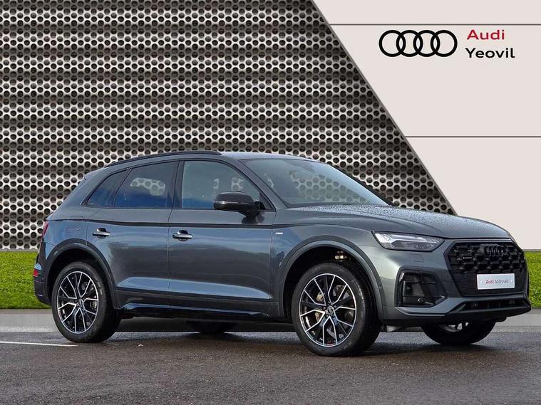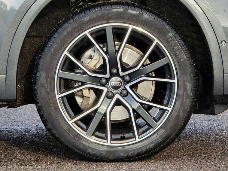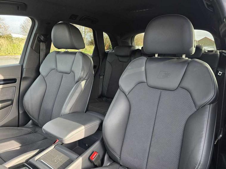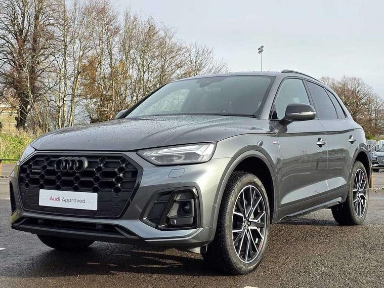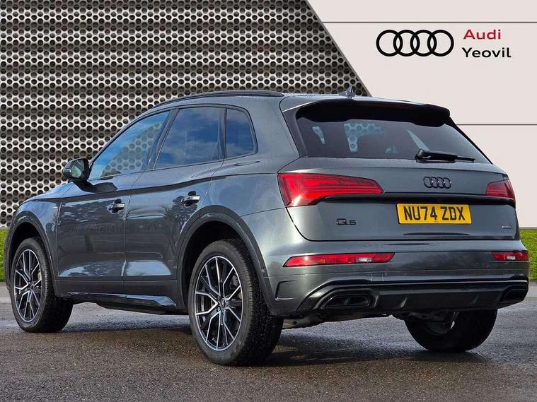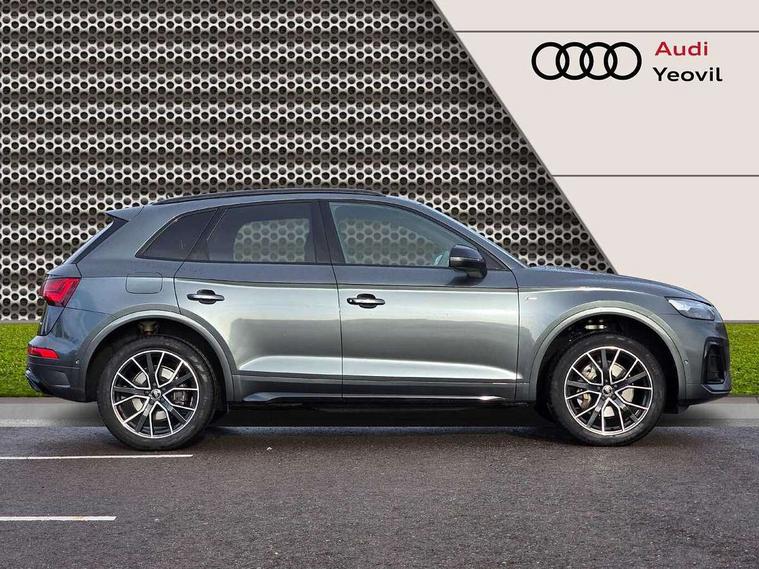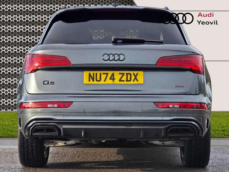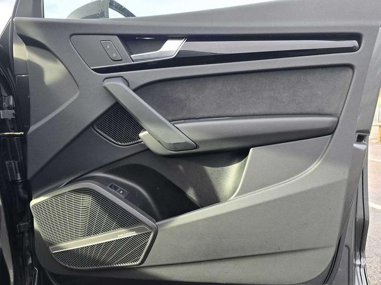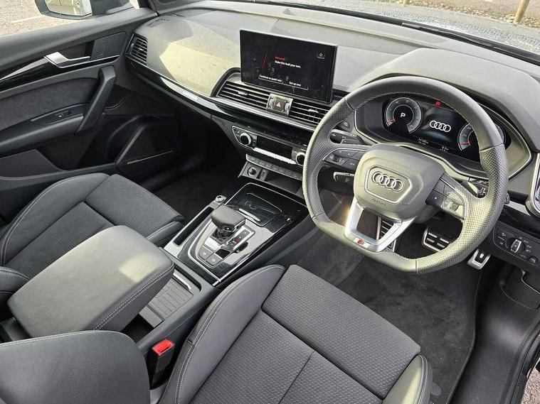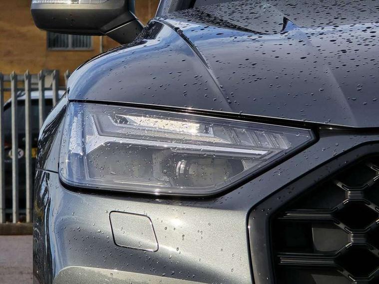 Acoustic front and rear parking sensor, Audi connect safety and service (e-call), Audi drive select, Audi virtual cockpit plus with 12.3" screen and three different layout designs, Audi wireless smartphone interface, Automatic start-stop system with coasting functionality and efficiency programme, Bluetooth interface, Camera based traffic sign recognition, Electro - mechanical power assisted steering, Lane departure warning, MMI navigation plus with 10.1" touch screen, Power tailgate, Reversing camera, Service interval indicator, Voice control system with Audi hotword activation "Hey Audi", Diesel particulate filter, Quattro on demand, S line sports suspension, 2 x USB charging port with aux input socket, 8 loudspeakers, DAB Digital radio, Acoustic windscreen, Auto dimming door mirrors, Auto dimming frameless rear view mirror, Automatic headlight adjustment, Automatic headlights and windscreen wipers, Black roof rails, Black styling with black rings, Body colour bumpers, Body colour rear diffuser with matt aluminium silver surrounds, Body colour underbody protection, Chrome plated exhaust trims, Daytime running lights, Door sills in Selenite silver, Electric adjustable/heated/folding door mirrors, Front air inlet surrounds in aluminium, Front and rear electric windows, Front radiator grille in honeycomb design, LED 3rd brake light, LED headlights and LED tail lights, Loading edge protection in stainless steel, Lower bumpers painted in contrast Manhattan grey, Rear chrome trim strip below lights, Rear privacy glass and rear side windows, Rear side wing doors, Rear wiper, Roof bars, S Line badges on the front wing panels, S Line front and rear bumpers, S Line rear spoiler, S Line side skirts, 3 rear headrests, Black cloth headlining, Comfort front centre armrest, Contrast stitching on seats, steering wheel and gear lever gaiter, Deluxe 3 zone electronic climate control, Front head restraints, Front sport seats with S embossed logo, Front/rear floor mats, Gear lever in black leather, Heated front seats, Height/reach adjustable steering column, Illuminated door sill trims with S logo, Luggage compartment cover, Manual seat adjustment with 4-way electric lumbar support, Single front passenger seat, Stainless steel pedals, Sunvisors with vanity mirrors, Top surface of the rear centre armrest in artificial leather, High gloss pack - Q5, LED interior light pack - Q5, 3 point seatbelts on all seats, 6 airbags - Driver, front passenger, curtain and side airbags, Attention and drowsiness assist, Electrically operated child locks on rear doors, Electromechanical parking brake, Electronic stabilisation control including ABS, ASR and EDL, First aid kit with warning triangle and vests, Front passenger airbag deactivation, Hill descent control, Hill hold assist, ISOFIX child seat mounting for front passenger seat and ISOFIX child seat mounting with Top Tether for outer rear seats, Multi collision brake assist, Pop-up bonnet for pedestrian protection, Pre sense city, Seatbelt monitoring, Tyre pressure warning, Anti theft alarm, Anti-theft wheel bolts, Remote central locking, Remote control key with SAFELOCK and keyless go, Air vents inserts and centre console in gloss black, Tool kit, Tyre repair kit,