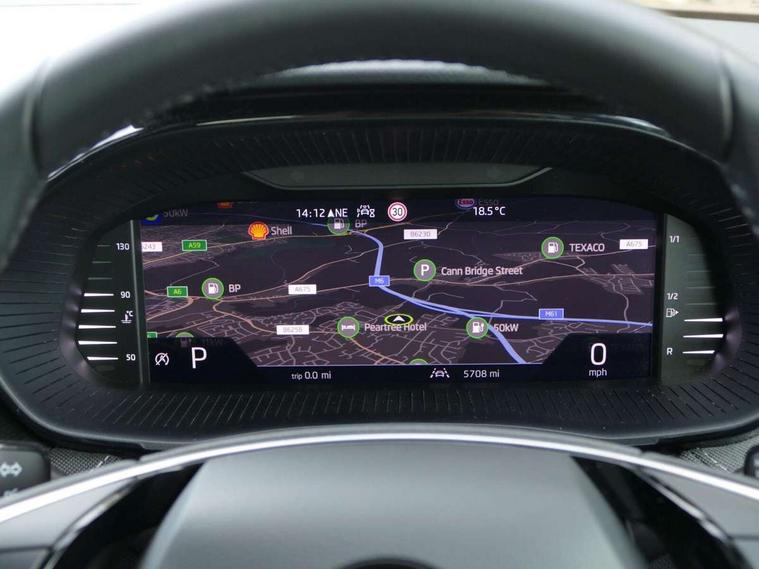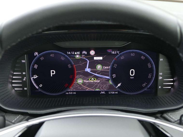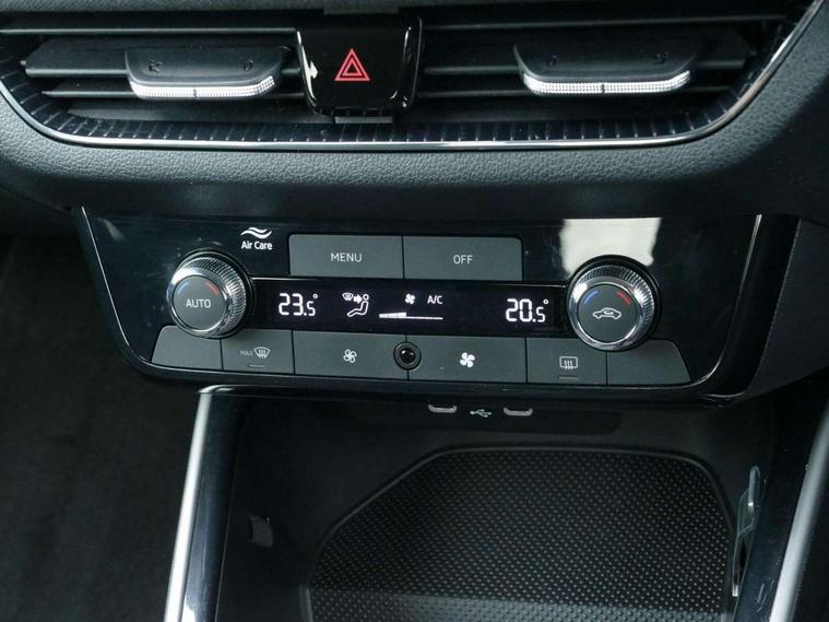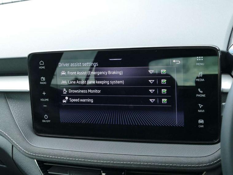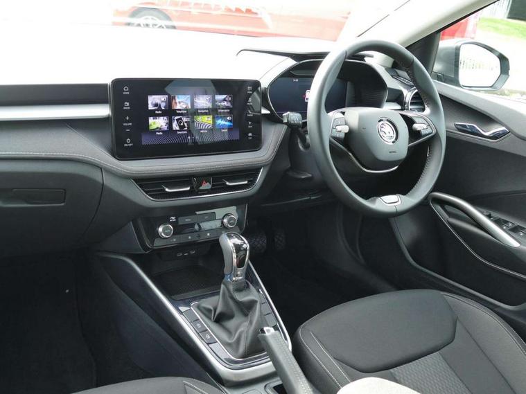 Advanced driver attention and drowsiness monitor, Bluetooth connection, Electromechanical power steering, Exterior temperature gauge, Service interval indicator, Traffic sign recognition, Virtual cockpit with 10.25" colour display, Wireless SmartLink for Apple CarPlay and Android Auto, 6 Speakers (4 in front and 2 in rear), 9.2" colour display skoda navigation system with voice control and web radio, Auxiliary socket for external MP3 player, DAB digital radio reception, Auto dimming rear view mirror, Body colour door mirrors, Body coloured bumpers, Chrome window surround, Door mirror integrated indicators, Front and rear electric windows, Front window wiper intermittent control, Headlight range control - Automatic, Ice scraper in fuel cap, LED daytime running lights with coming and leaving home feature, LED rear lights, Privacy glass, Rear LED fog light, Rear side wing doors, Rear window wiper with washing nozzles, Roof mounted spoiler, SKODA tailgate lettering in chrome, Third brake light, 2 reading lights in front and 2 reading lights in rear, 3 rear headrests, Backrest split and folding, Central console with removable cup holder and storage box, Chrome handbrake release button, Comfort seats, Door sills with fabia badging, Dual zone air conditioning with climatronic electronic control, Fabric upholstery, Front centre armrest, Gearshift knob/handle in leather, Hand brake lever handle in leather, Height adjustable front headrests, Height adjustable front seats, Height adjustable steering wheel, ISOFIX and TopTether anchorage points to the outer rear seats, ISOFIX and TopTether on the front passenger seat, Luggage compartment lighting, Manually adjustable lumbar support in front seats, Metallic grey interior door handles, Pollen filter, Rear seat bench unsplit, Single front passenger seat, Storm grey headlining, Sun visors with mirror and airbag label on passenger side, Textile floor mats, Ticket holder, Umbrella in drivers door, 3-point height adjustable front seats belts with pretensioner and force limiter, Automatic warning lights in case of crash, Driver and passengers airbag with switch off function, e-Call+, ESC including ABS, MSR, ASR, EDS, HBA and XDS, Front and rear seat belt warning, FRONT ASSIST (AEB City and AEB Inter Urban), Front side airbags, Head airbags, Hill hold control, One tone horn, Pedestrian protection, Three rear 3-points safety seat belts with pretensioner and force limiter including stop function for outer rear seat belts, Tyre pressure monitoring system, Anti-theft alarm system including immobiliser, interior monitoring, backup horn, and towing protection, Central locking with radio remote control, interior controls, SAFE function and 2 foldable keys, Chrome edged air vents, Metallic grey central console cover, Metallic grey upper decorative trim, Satin black door and side trim panel in front, Textile microsuede grey lower decorative trim with art grey stitching, Anti-theft wheel bolts protection, Super-low rolling resistance tyres,