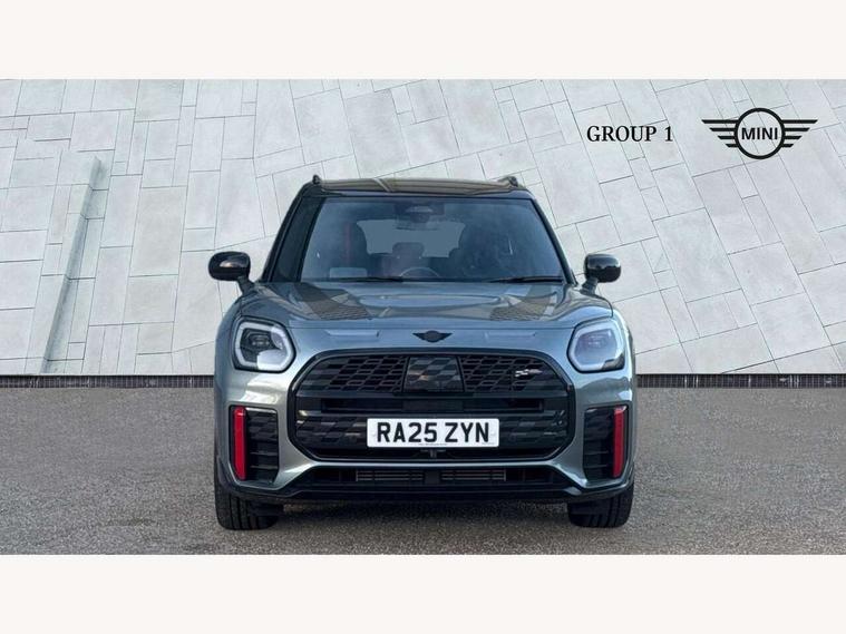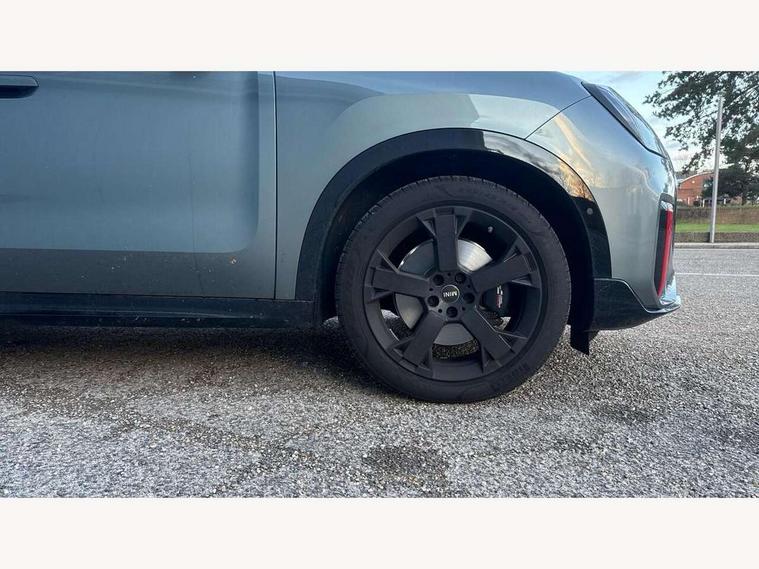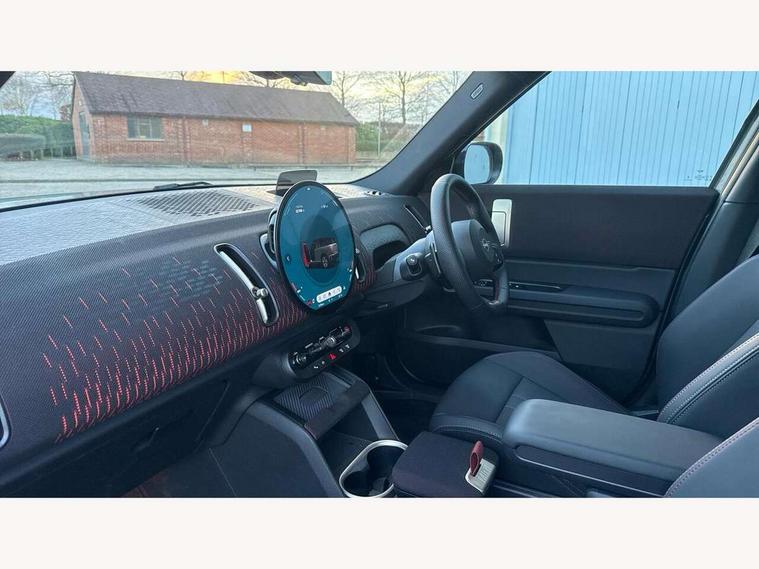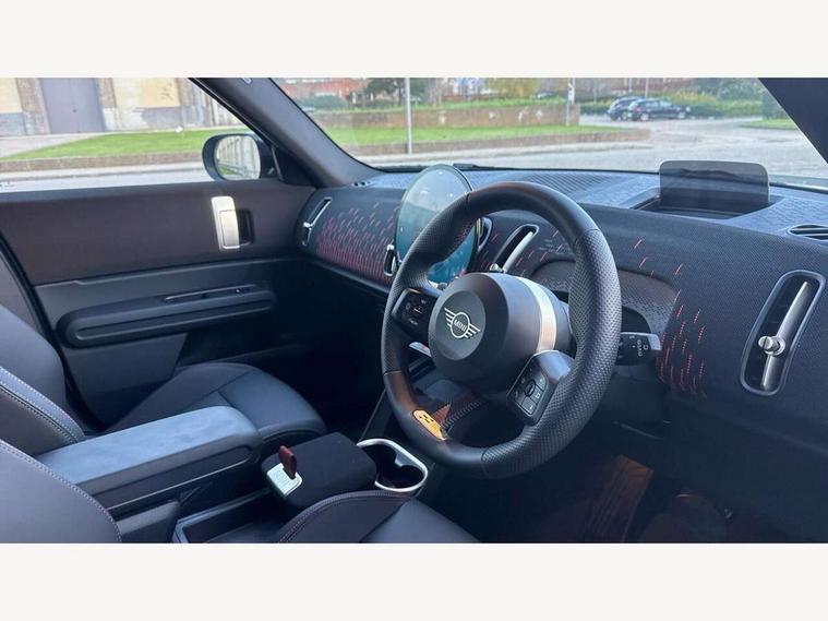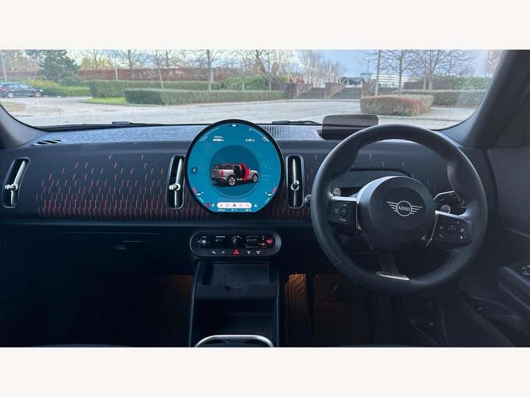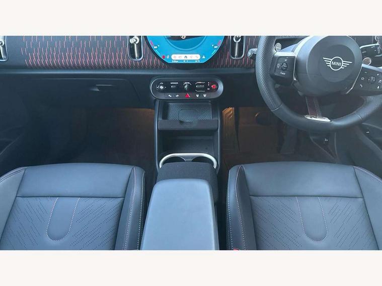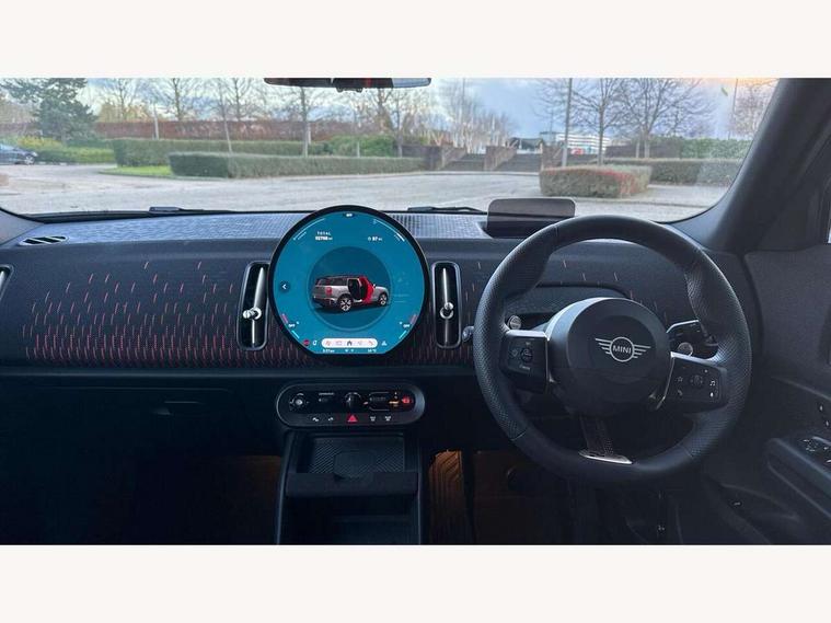 Bluetooth connection, Circular OLED Screen, Compatible mobile phone bluetooth with audio streaming, Cruise Control (DCC), Digital dashboard display, Driving assistant, Driving Assistant Plus Preparation, E-call, Electro-mechanical speed dependant steering assistance, MINI Experience Modes, MINI Head up display, Mini navigation system, MINI TeleServices, Parking assistant in camera and ultrasound based assistance system, rear view camera, parking aid and distance control, Adaptive suspension, Double clutch sports transmission, Larger capacity fuel tank, 6 speakers, DAB Digital radio, Personal eSim, Auto tailgate, Electric adjustable heated door mirrors, Front and rear apron, Front and rear electric windows, Heated rear window, High beam assistant, High gloss hexagonal patterned grille surround, Interior rear-view mirror with automatic anti-dazzle function, LED daytime running lights, LED headlights with extended contents including Adaptable light signatures, LED rear lights, LED third brake light, Rain sensor with auto headlights, Rear roof spoiler with airblades, Rear side wing doors, Rear window wiper, Roof rails, 3 Seat sliding rear bench in 2nd row, Anthracite headliner, Auto air conditioning, Driver and front passenger seat heating, Floor mats, Front armrest, Front headrests, Heated steering wheel, Height and length steering column adjustment, JCW Front sports seats, Lidded storage box in Black/Red knit, Luggage compartment separating net, Perforated Vescin steering wheel, Rear headrests, Seat adjustment for rear seats, Single front passenger seat, Sunvisors with vanity mirrors, Vescin/Cloth upholstery, Wireless charging tray, Interior and exterior mirror package - Mini Countryman, 3x3 point rear seat belts, 6 Airbags - front, side, head and seat belt tensioners, ABS, Brake calipers in Black with JCW badge, DSC - Dynamic Stability Control, Electronic handbrake, Electronic Stability Programme (ESP), Front ISOFIX (iSize), Hill descent control, Hill hold assist, Hill start assist, JCW Sport Brakes, Manual rear child locks, Traction control, Tyre pressure monitoring system, Warning triangle, Alarm system with tilt sensor, monitoring doors, bonnet interior and tailgate, Auto drive away locking, Comfort access system, Deadlocking function, Electronic vehicle immobiliser, Locking wheel bolts, Remote control locking, Start/stop toggle with keyless go, JCW Black/Red dashboard knit, MINI Mobility Kit,