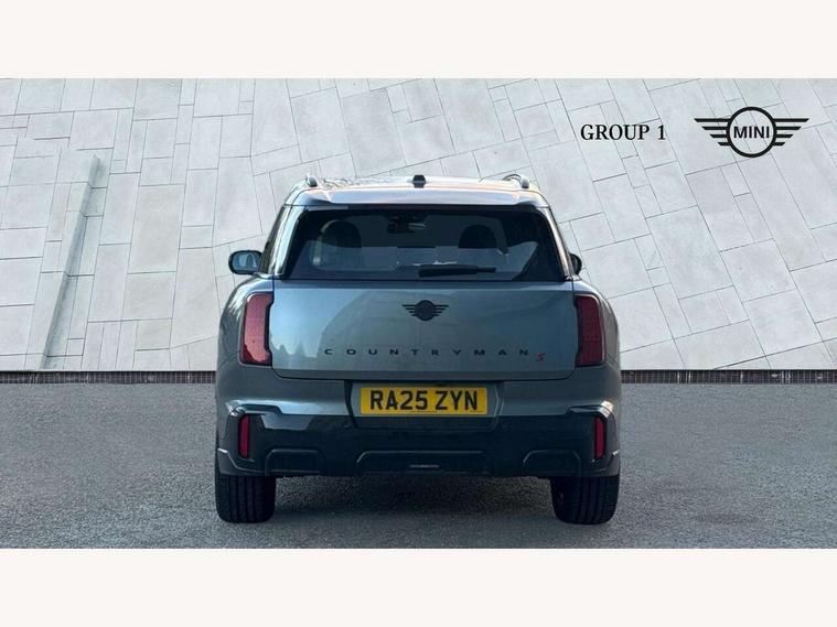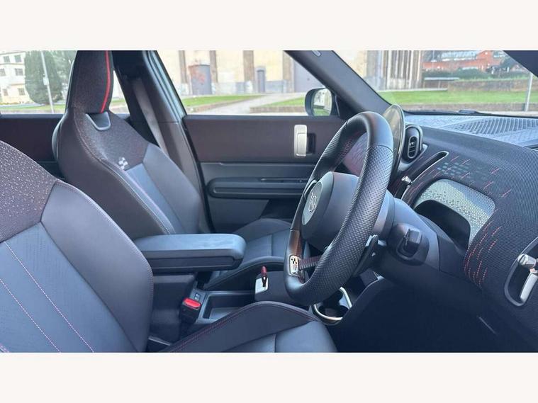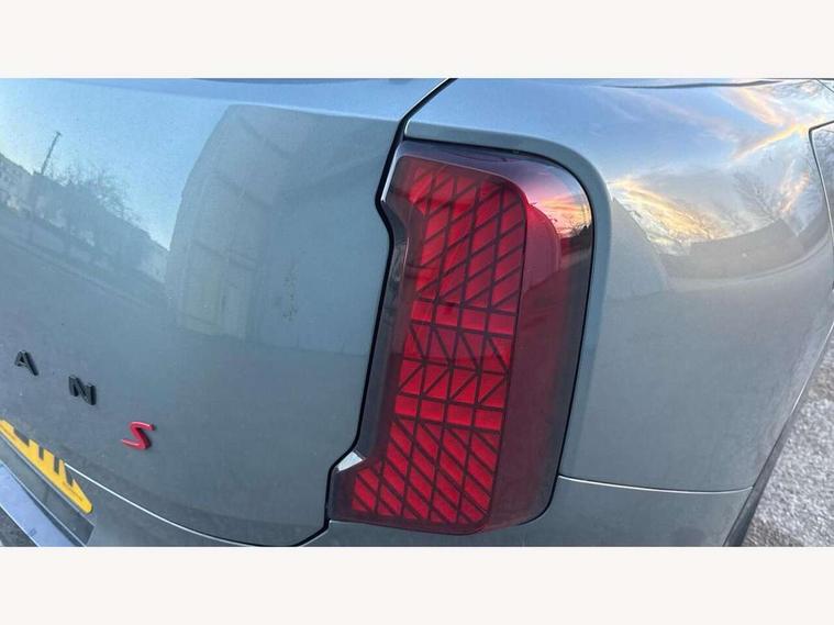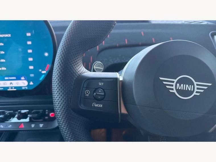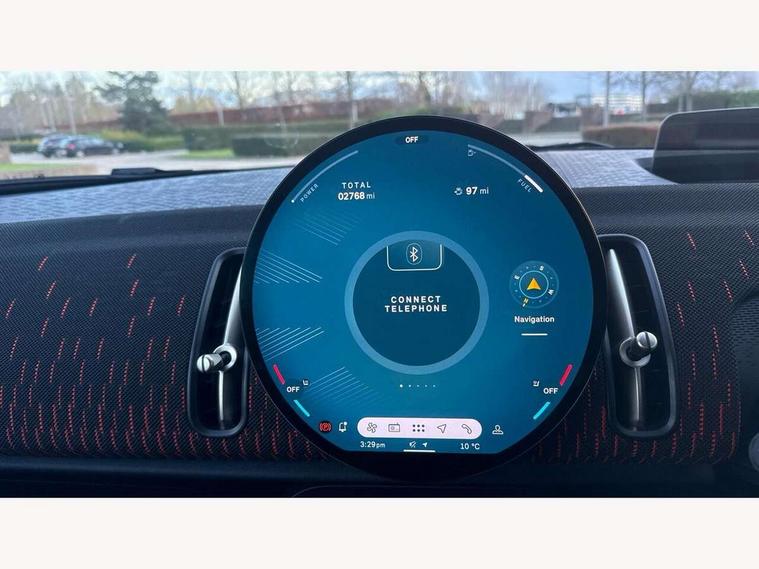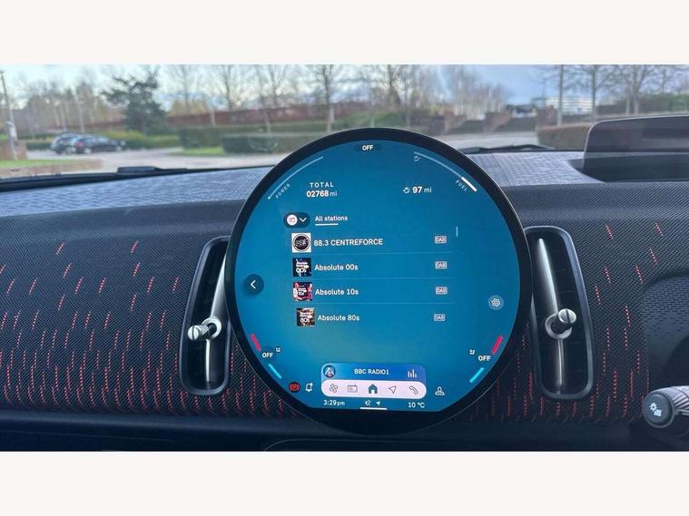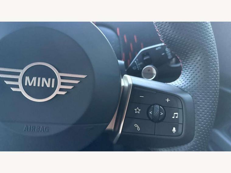 Bluetooth connection, Circular OLED Screen, Compatible mobile phone bluetooth with audio streaming, Cruise Control (DCC), Digital dashboard display, Driving assistant, Driving Assistant Plus Preparation, E-call, Electro-mechanical speed dependant steering assistance, MINI Experience Modes, MINI Head up display, Mini navigation system, MINI TeleServices, Parking assistant in camera and ultrasound based assistance system, rear view camera, parking aid and distance control, Adaptive suspension, Double clutch sports transmission, Larger capacity fuel tank, 6 speakers, DAB Digital radio, Personal eSim, Auto tailgate, Electric adjustable heated door mirrors, Front and rear apron, Front and rear electric windows, Heated rear window, High beam assistant, High gloss hexagonal patterned grille surround, Interior rear-view mirror with automatic anti-dazzle function, LED daytime running lights, LED headlights with extended contents including Adaptable light signatures, LED rear lights, LED third brake light, Rain sensor with auto headlights, Rear roof spoiler with airblades, Rear side wing doors, Rear window wiper, Roof rails, 3 Seat sliding rear bench in 2nd row, Anthracite headliner, Auto air conditioning, Driver and front passenger seat heating, Floor mats, Front armrest, Front headrests, Heated steering wheel, Height and length steering column adjustment, JCW Front sports seats, Lidded storage box in Black/Red knit, Luggage compartment separating net, Perforated Vescin steering wheel, Rear headrests, Seat adjustment for rear seats, Single front passenger seat, Sunvisors with vanity mirrors, Vescin/Cloth upholstery, Wireless charging tray, Interior and exterior mirror package - Mini Countryman, 3x3 point rear seat belts, 6 Airbags - front, side, head and seat belt tensioners, ABS, Brake calipers in Black with JCW badge, DSC - Dynamic Stability Control, Electronic handbrake, Electronic Stability Programme (ESP), Front ISOFIX (iSize), Hill descent control, Hill hold assist, Hill start assist, JCW Sport Brakes, Manual rear child locks, Traction control, Tyre pressure monitoring system, Warning triangle, Alarm system with tilt sensor, monitoring doors, bonnet interior and tailgate, Auto drive away locking, Comfort access system, Deadlocking function, Electronic vehicle immobiliser, Locking wheel bolts, Remote control locking, Start/stop toggle with keyless go, JCW Black/Red dashboard knit, MINI Mobility Kit,