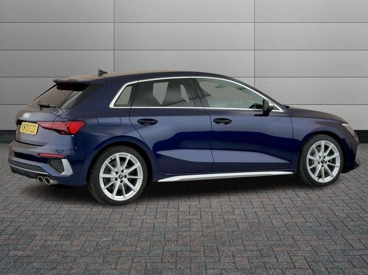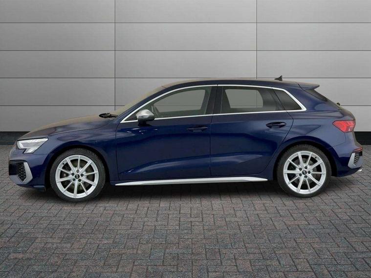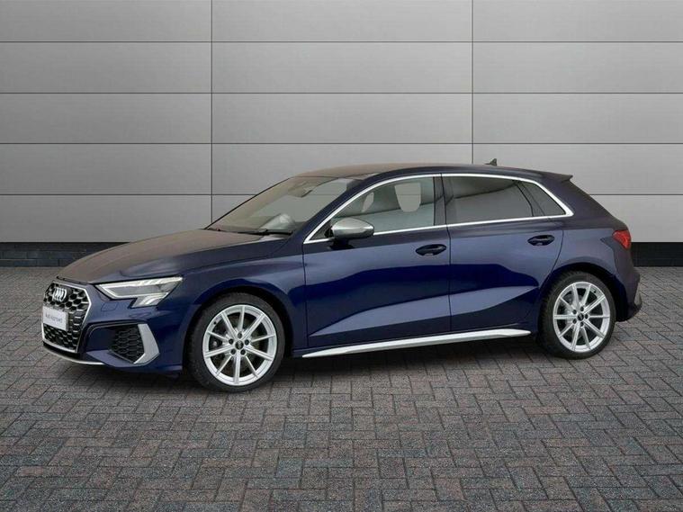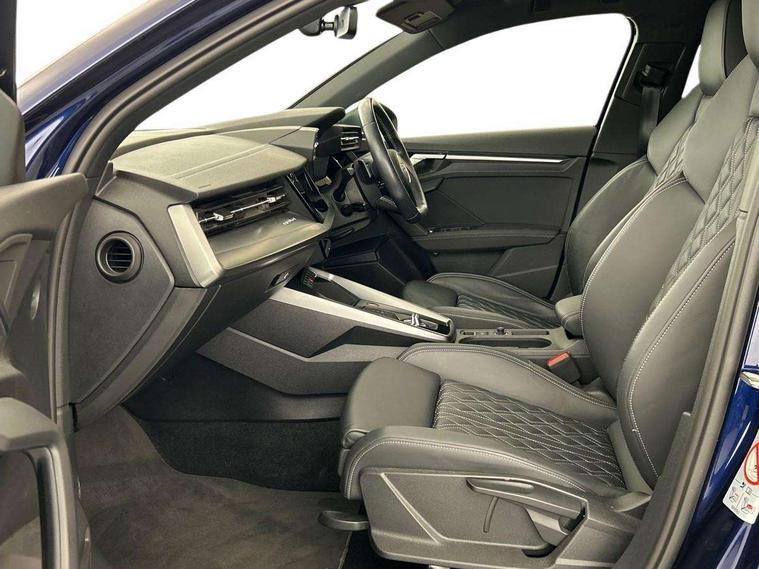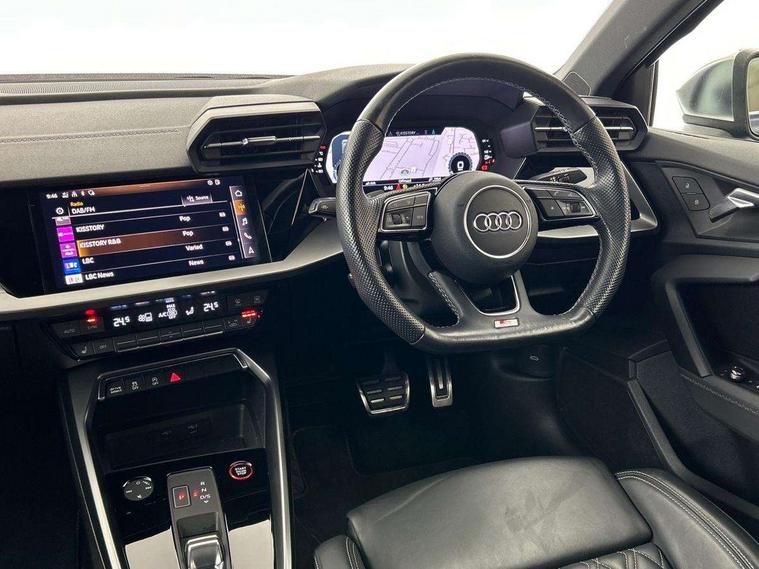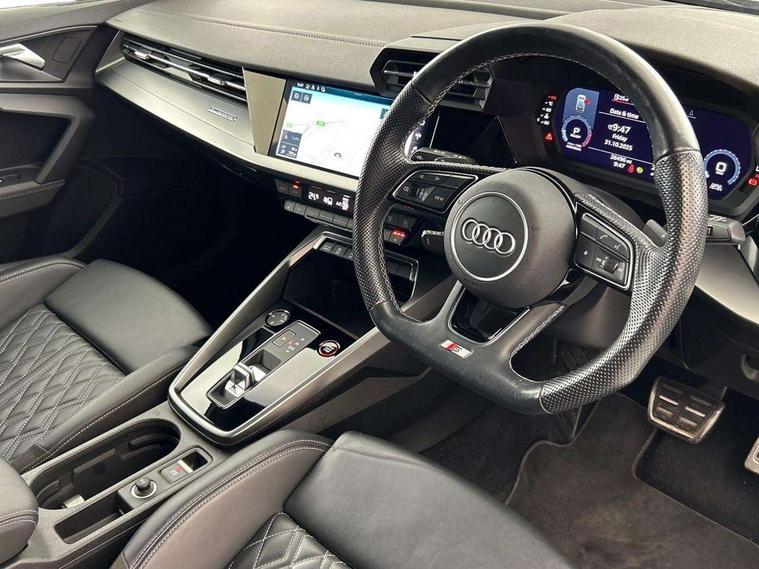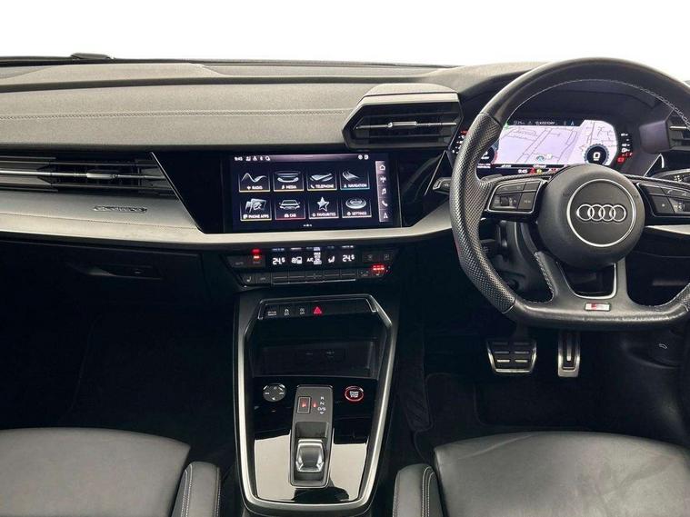 Audi connect emergency call and service, Audi drive select (Auto, Comfort, Dynamic, Efficiency and Individual), Audi smartphone interface, Audi Virtual Cockpit - 10.25" digital and colour instrument cluster, Automatic start/stop system with recuperation, Bluetooth interface, Collision avoidance assistant, Lane departure warning system, MMI Navigation Plus with high resolution 10.1" colour touch screen display, Progressive steering, Service indicator, Trip computer, Voice control system with natural language interaction, Quattro permanent all wheel drive, S sports suspension, 2xUSB-C connection with data and charging functions, 6 passive loudspeakers, DAB Digital radio, Acoustic glass windscreen, Aluminium window trim, Audi Beam uses LEDs to project the Audi S3 logo, Auto dimming frameless rear view mirror, Dual branch oval twin tailpipes in chrome plated finish, Exterior mirror with aluminium look housing, Front electric windows, Illuminated aluminium inserts front door sills with S logo, LED daytime running lights, Light and rain sensors, Privacy glass - dark tinted rear window, rear door and side windows, Rear electric windows, Rear side air outlets in grained matt black, Rear wiper, 12V socket and storage compartment in front centre console, 3 spoke flat bottomed multifunction plus sports contour leather wrapped steering wheel with shift paddles, 40/20/40 split folding rear seat bench with cupholder, Black cloth headlining, Dual zone electronic climate control, Front and rear centre armrest in leather, Front and rear headrests, Front/rear floor mats, Heated front seats, Height and reach adjustable steering wheel, Interior lighting - glove compartment light and right hand side, Luggage compartment floor covering, Seat side bolsters, Stainless steel pedals and front footrest, Aluminium interior elements pack - A3 Sportback, Design body styling - A3 Sportback, Storage pack - A3 Sportback, 3x3 point rear seat belts, Driver and front passenger airbag with passenger airbag deactivation, Electronic Stabilisation Control (ESC) including ABS, ASR and EDL, First aid kit with warning triangle and 2 safety vests, Front side airbags with head airbags and interaction airbag, Hill hold assist, Pre-sense front with pedestrian and cyclist detection, Seatbelt monitoring, Tyre pressure loss indicator, Anti theft alarm, Anti-theft wheel bolts, Electronically operated child lock, Immobiliser, Remote control central locking, Accent surfaces in the dashboard and centre console in platinum grey silk effect paint finish, Dark spectrum aluminium inlays,