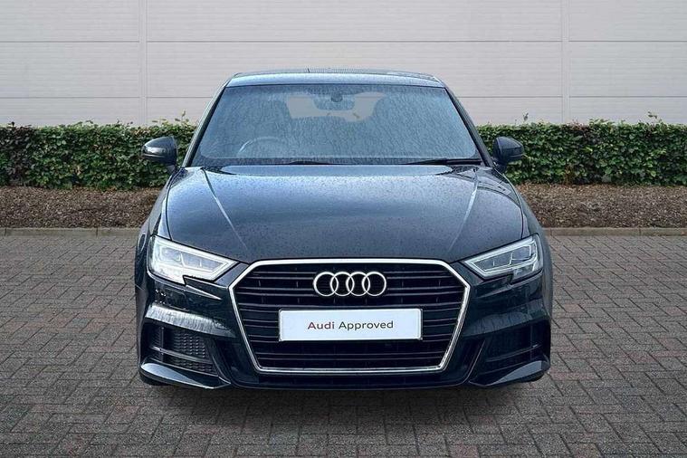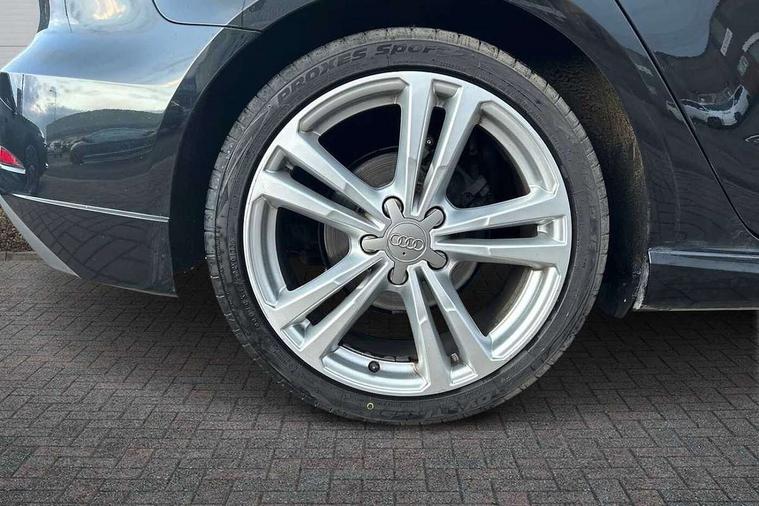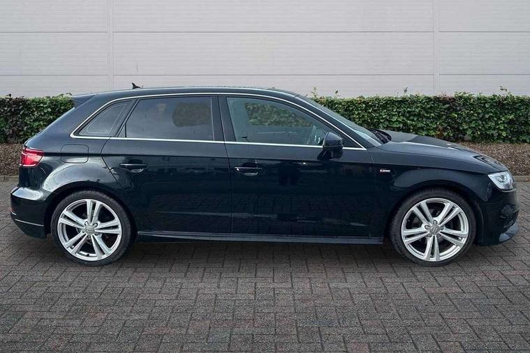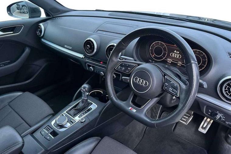 Audi connect, Audi drive select, Audi smartphone interface, Automatic start/stop system, Colour driver's information system display, Electro - mechanical power assisted steering, Mobile telephone preparation - bluetooth interface, SD card based MMI navigation, Service interval indicator, Speed limit display, Voice control system, Voice recognition for navigation system, Diesel particulate filter, 2 USB interfaces and Aux-In jack, Audi music interface, CD player, DAB Digital radio, MMI radio plus with 7" colour MMI screen and MMI controller, Aluminium window trim, Auto dimming rear view mirror with light and rain sensors, Body colour door mirrors, Chrome exhaust tailpipes, Electric front windows, Electric rear windows, Electrically adjustable and heated door mirrors with integrated LED side indicators, Heated windscreen washer jets, LED daytime running lights, Matt black radiator grille, Rear wiper, S line badges on front wings, S Line body styling with front & rear bumpers and side skirts, radiator grille and rear diffuser insert, roof spoiler, Sport specific side air inlet grille and diffuser insert, 3 adjustable rear headrests, 3 spoke flat bottomed high multi-function leather sport steering wheel with gearshift paddles, 4 lashing points to secure luggage, Adjustable front centre armrest, Black cloth headlining, Dual zone electronic climate control, Front and rear interior lights with delay, Front/rear floor mats, Glovebox light, Height and reach adjustable steering wheel, Illuminated door sill trims with S logo, Isofix child seat preparation for front passenger/outer rear seats inc passenger airbag deactivation, Stainless steel pedals, Storage compartments in doors side trims, centre console and under front drivers seat, LED interior light pack - A3/RS3, Non smoking pack - A3, Storage and luggage pack - A3/RS3, 3 point seatbelts on all seats, ABS/EBD, Active bonnet, Active front headrests, Airbags - front driver/passenger, front & rear side, curtain, drivers knee, ASR, EDL, Electromechanical parking brake, ESC - Electronic Stability Control + traction control, Front passenger airbag deactivation, Hill hold assist, Manual rear child locks, Multi-Collision braking, Seatbelt warning, Tyre pressure warning, Warning triangle and first aid kit, Anti theft alarm, Anti-theft wheel bolts, Remote control central locking, Thatcham category 1 alarm + immobiliser, Aluminium air vent surrounds, Aluminium trim elements, Matt brushed aluminium inlays, Tool kit, Tyre repair kit,
