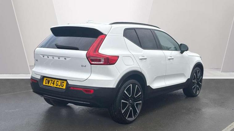 12.3" Progressive Driver Display, 360 degree surround view parking camera with side proximity sensors, 9" centre console portrait touch screen, Adjustable steering wheel force, Apple carplay (wired), Bluetooth handsfree system, Driver alert control, Driver assistance (pilot assist and adaptive cruise control), Driver awareness - Blind spot information system with steer assist, cross traffic alert with autobrake and rear collision warning and mitigation, E-call, Google automotive services - Enabled entertainment apps, navigation with google maps, voice recognition with google assistant, Hands free power tailgate, Intelligent speed assistance, Lane keeping aid, Oncoming Lane Mitigation, Speed sensitive steering, Volvo cars services with app - Driving journal, emergency and breakdown call, engine remote start, remote door locking/unlocking and vehicle dashboard, Wireless/Inductive Mobile Phone Charging, Automatic transmission with start/stop and manual change functions, Dynamic chassis, DAB Digital radio, Premium Sound by Harman Kardon, Dolby Pro Logic II Surround Sound, Dirac Unison, 12 speakers/600W and subwoofer, Steering wheel mounted remote controls, Active bending pixel LED headlights with adaptive shadow technology, Active high beam incorporating daytime running lights, Adaptive brake lights with high level LED brake lights, Auto dimming feature for exterior door mirrors, Auto dimming interior mirror, Automatic headlamp levelling, Dark tinted windows - rear side windows and rear screen, Front aluminium tread plates, Front and rear electric windows, Headlight cleaning system, High gloss black front and rear skid plate, High gloss black front bumper deco, High gloss black mesh front grille with high gloss black surround, High gloss black window trim, Home safe and approach lighting, Integrated roof rails in high gloss black, LED front fog lights with cornering function, Power glass tilt and slide panoramic sunroof with sun curtain, Puddle lights, Rain sensor with automatic windscreen wiper activation, Rear side wing doors, Rear wiper, Roof antenna, Roof spoiler, Visible VIN plate, 12V socket in front tunnel console and luggage compartment, 2-Zone electronic climate control with CleanZone air quality system and pollen filter, 3 seat bench in 2nd row, 3 Spoke tailored steering wheel with chrome trim, 60/40 versatile split folding rear seat, Centre console cupholders and storage, Flexible load floor and grocery bag holder, Floor mats, Front cabin courtesy lights, Front door pocket, front cupholder, ambient front door, rear reading, rear courtesy, instrument panel and tailgate lighting, Front footwell illumination, Front headrests, Front reading lights, Front seat cushion extensions, Front side step illumination (under door), Glovebox bag hook, Heated front seats, Height/reach adjustable steering column, High gloss centre tunnel deco, Illuminated glovebox, Illuminated luggage compartment, Illuminated vanity mirrors + ticket holder, Integrated waste bin, Isofix attachments on outer rear seats, Load cover, Load protection net, Multi directional lumbar support for driver and passenger seat, Power driver seat with memory + exterior mirrors memory, Power folding rear headrests, Power passenger seat, Rear armrest with cupholders, Single front passenger seat, Underfloor cargo storage, Climate pack without heated front seats - XC40, 3x3 point rear seatbelts, City safety with steering support with Pedestrian + cyclist + front collision warning with full auto brake and rear auto brake, Driver and passenger airbags, Drivers knee airbag, Electronic parking brake with auto hold, First aid kit, Front and outer rear seatbelt reminder and pretensioners, Front seats SIPS airbags, Hill descent control, Hill start assist, Inflatable curtain, Passenger airbag cut-off device, Power child locks on rear doors, Road sign information display, Run off Road Protection, SIPS (Side Impact Protection System), Slippery road and hazard light alert, Stability and Traction Control with Spin control, Engine Drag Control and Corner Traction Control, Tyre pressure monitoring system, Vehicle deceleration control with Anti-lock Brake System, Electronic Brake Distribution and Emergency Brake Assist, Warning triangle, WHIPS whiplash protection system - front, 2 x Key integrated remote control central locking including with deadlocking system and auto open/close windows and sunroof, Anti-theft alarm including immobiliser/volume sensor + level sensor, Keyless drive includes keyless entry and keyless start, Locking wheel nuts,