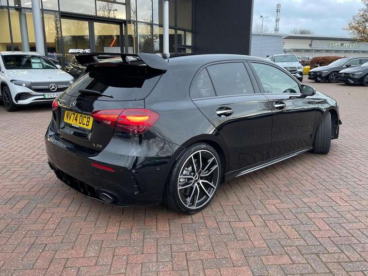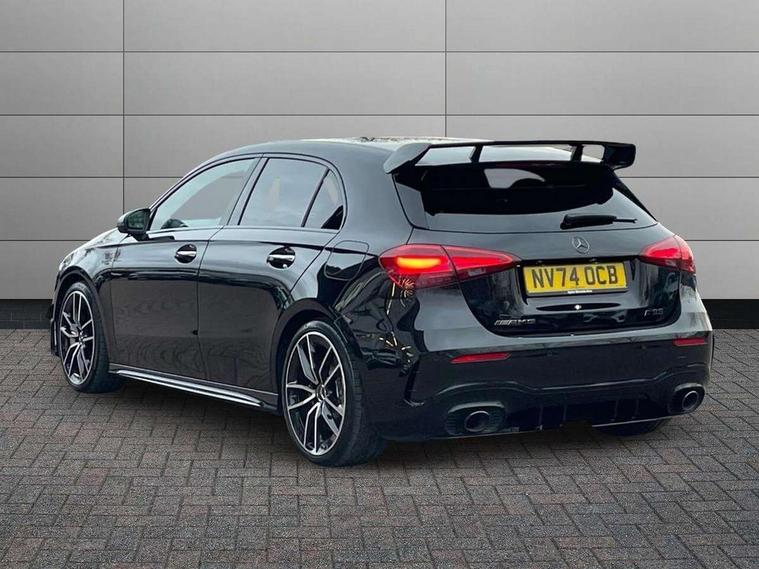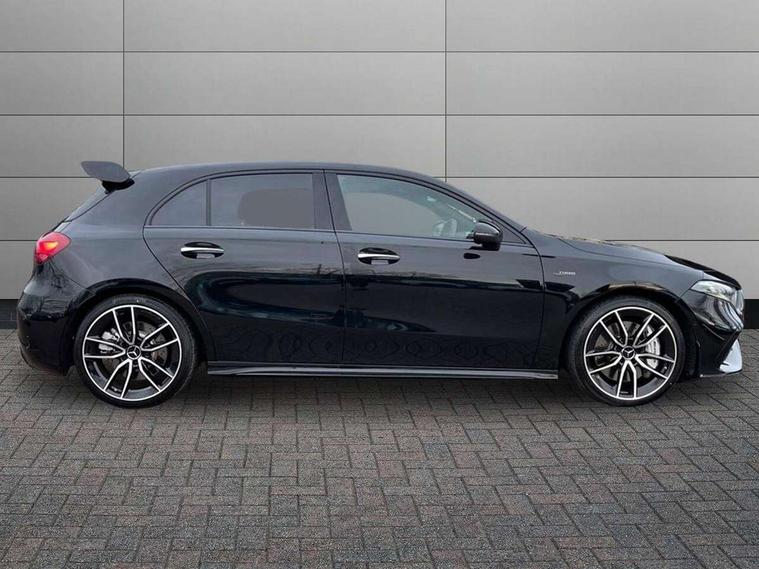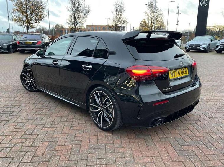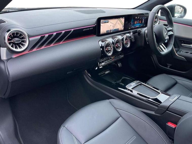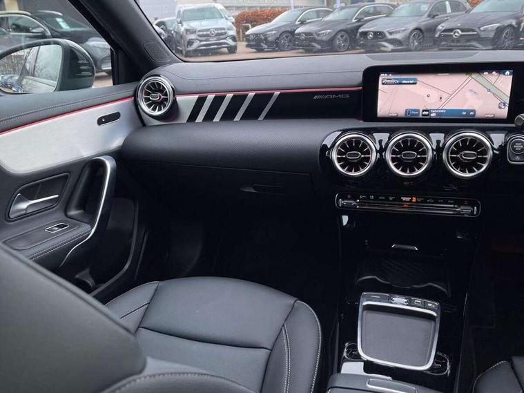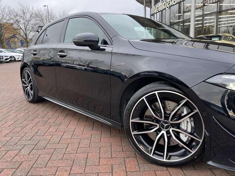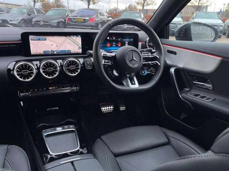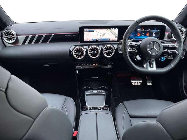 10.25 inch touchscreen central media display, 10.25" Digital instrument cluster display screen, Attention assist, Blind spot assist, Brake pad wear indicator warning light, Car wash mode, Cruise control + speed limiter, Direct steering, Direction indicators with lane change function, Dual bluetooth interfaces, DYNAMIC SELECT with driving programs (Slippery, Comfort, Sport, Sport+ and Individual), Easy pack tailgate hands-free access, ECO start/stop function, Engine start/stop button, Fingerprint scanner, Fluid level warning indicator for fuel, oil, coolant and washer fluid, Fluorescent jacket for driver, Hard-disk navigation, Hey Mercedes Voice activation, Lamp failure indicator, Lane keeping system, MBUX augmented reality for navigation, Mercedes me connect including emergency call system, accident recovery, breakdown and maintenance management, Mercedes me remote services, Outside temperature gauge, Owners manual in English, Pre-installation of private car share, Preinstallation for Mercedes Benz link, Remote boot closing, Service indicator (ASSYST), Smartphone integration with Apple CarPlay and Android auto, Speed limit assist, Speed sensitive power steering, Tailgate, Trip computer in multifunction display with current consumption indicator, Wireless charging, AMG suspension, DAB Digital radio, MBUX multimedia system, Mercedes Benz sound system (100 W) with 6 speakers, 4 Electric Front and Rear windows, Adaptive brake lights, AMG body styling - AMG front apron with front splitter and AMG rear apron and visible exhaust tailpipe trim elements, AMG Front apron with flics as air deflector elements on the outer air intakes, AMG Rear apron with specific diffuser look with four vertical fins and two round chrome plated tailpipe trim elements with a diameter of 90 mm, AMG spoiler lip on roof, Beltline strips in High gloss Black, Body colour bumpers, Body colour door handles with chrome inserts, Body colour side skirt, Darkened AMG specific radiator grille, Electric adjustable and heated door mirrors with integrated LED side indicators, Front splitter and trim elements on the louvres in the outer air inlets, Front wings wheel arches with TURBO 4MATIC lettering, Headlamp assist automatic headlamp activation, Heat insulating dark tinted rear and rear side windows, Heated glass rear windscreen + timer control, LED High level third brake light, LED High Performance headlamps including integral LED daytime running lamps and adaptive highbeam assist, LED tail lamp, Privacy glass, Radio aerial, Rain sensing windscreen wipers with two sensitivity settings, Rear fog lights, Rear side wing doors, Rear windscreen wiper, Wider wheel arches for AMG wheels, Window line trim strip in black, 3 seat bench in 2nd row, 4 way lumbar support, 40:20:40 split folding rear seats, Air conditioning - Two zone thermotronic luxury automatic climate control with display, AMG floor mats, AMG Performance steering wheel in nappa leather, Automatic child seat recognition sensor, Black air vents with surround in silver chrome, Black roof lining, Brushed stainless steel sports pedals with rubber studs, Front centre armrest with stowage, Front door sills with AMG lettering, Front seat backs luggage nets, Heated front seats, Height/reach adjustable steering column, Interior lighting - 64 colour Ambient lighting, Interior mirror with reading lamps in black and frameless, Rear armrest with 2 cupholders, Seat occupancy sensor for front passenger seat, Silver coloured aluminium gear shift paddles on steering wheel, Single front passenger seat, Sports seats with integrated headrests, Stowage compartment in centre console with retractable cover, Sunvisors with illuminated vanity mirrors, Twin front cupholders, Aerodynamic pack - A Class, AMG night pack - A Class, AMG night pack II - A Class, Light and sight package - A Class, Mirror package - A Class, Parking pack with 180 degree view - A Class, Seat comfort pack - A Class, USB pack plus - A Class, 3 rear 3 point seatbelts, ABS with Brake Assist, Active bonnet, Active brake assist includes forward collision warning system with autonomous braking, Adaptive brake assist with hold function and hill start assist, Black seatbelts, Bonnet with power domes, Childproof locks manually operated for rear doors and electrically operated for rear power windows, Crash responsive emergency lighting, Driver and passenger head and side airbags, Drivers knee airbag, Dual stage driver/passenger airbags, Electronic parking brake, ESP curve dynamic assist, ESP with ASR, Front and rear seatbelt reminder, Front brake calipers with AMG lettering, ISOFIX and top tether child seat fixing points in two outer rear seats, Tyre pressure monitoring system, Warning triangle and first aid kit, Window airbags, Alarm system/interior protection/immobiliser, Guard 360 degree vehicle protection, Keyless entry lock/unlock, Keyless Go, Remote central locking and crash sensor with emergency opening function, Aluminium AMG design black/silver interior trim, 19" AMG 5 twin spoke light alloy wheels painted in high gloss black with high sheen finish, Summer tyres, Tirefit sealant kit,