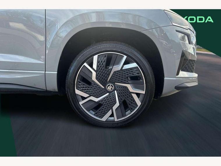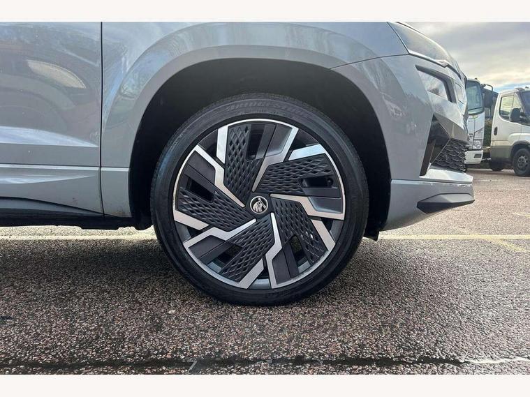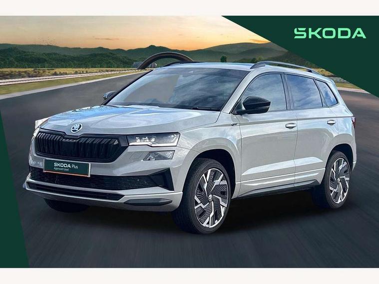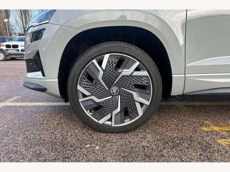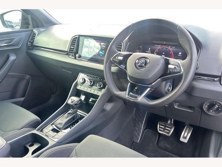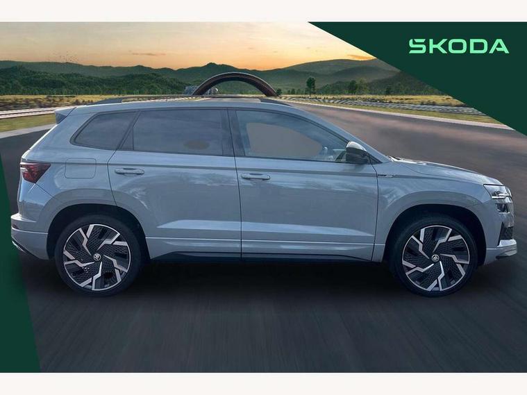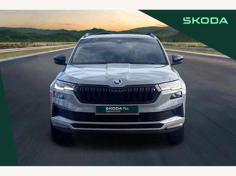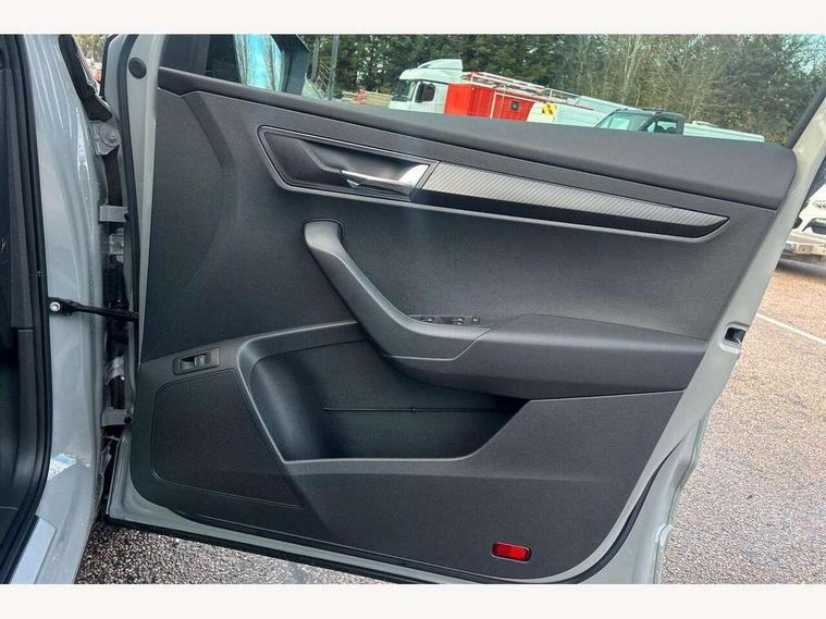8" Digital display, Care connect, Driver fatigue sensor, Emergency services call system, Outside temperature gauge, Service interval indicator, SmartLink wireless for Apple and wired for Android, Start/stop system with regenerative braking, USB C Port x 2 in front centre console, Virtual cockpit, Virtual pedal with electrically operated boot door, 8 Speakers, DAB radio with Bluetooth, USB connection, Acoustic glass, Aero front windscreen wipers with intermittent function, Auto dimming rear view mirror with light and rain sensors, Black door mirrors, Black electric window control buttons, Black radiator grille, Black roof rails, Body colour door handles, Dynamic headlight range control with cornering light function, Electric front and rear windows with child proof lock, Front door steps with SportLine logo, Heated rear windscreen, LED daytime running lights, LED rear lights with high functionality welcome effect and dynamic indicators, Light assistant (coming/leaving home/tunnel light), Panoramic sliding sunroof, Plastic scuff plates, Privacy glass, Protective door side sills in body colour, Rear diffuser, Rear side wing doors, Rear spoiler, Rear window wiper with washer system and intermittent control, Safety reflectors on front doors, Skoda lettering on tailgate in black, Sportline badge on front fender, Sportline decorative inserts with badging, Sports front and rear bumpers, 1.5 litre bottle holders in driver and front passenger door panels, 12V socket in boot, 12v socket in front centre armrest with storage compartment and rear air vents, 2 Folding hooks and nets in boot, 3 rear height adjustable headrests, 3 seat bench in 2nd row, 3 spoke leather sports multifunction steering wheel and silver stitching with gear shift paddles, 4 foldable roof handles with rear coat hooks, Black floor carpet, Black roof headlining, Chrome inner door handles, Double sided boot floor, Foldable hooks in the boot, Front head restraints, Height adjustable front three point seats belts with tensioners, Height/reach adjust steering wheel, Ice scraper, Illuminated glovebox, Illuminated luggage compartment, Interior noise suppression, Isofix child seat preparation outer rear, Manual lumbar support for front seats, Pen holder, Pollen filter, Rear boot cover, Rear reading lights, Rear seats fixed folding and divided 60:40, Rubbish bin door, Safety vest holder, Single front passenger seat, Storage box in upper central dashboard closed, Sunvisors with illuminated vanity mirrors, Textile floor mats, Ticket holder, Titan black interior ceiling, Welcome animation with sportline logo, Light Pack - Karoq, Parking pack - Karoq, Automatic door unlocking in case of crash, Automatic fuel cut off in case of crash, Child locks on rear doors, Driver airbag, Electronic parking brake with auto hold function, Emergency rear braking signal, ESC including ABS, MSR, ASR, EDS, HBA, DSR, RBS, MKB and traction control, Front side airbags, Hill hold control, Knee airbags, Passenger airbag with switch-off function, Pedestrian monitor, Seatbelt reminder signalisation and pretensioner for all seats, Three point seatbelts rear, Two tone horn, Tyre pressure display, Tyre pressure monitor, Alarm with interior monitoring, back up horn and tilt sensor with safe function, Electronic engine immobiliser, Keyless entry and start/stop, Remote central locking with 2 remote folding keys, Black air vent surround, Black centre console, Satin black dashboard, Satin black door trim, 19" Vega black polished alloy wheels, Anti-theft wheel bolts protection, Matt black aero hub caps, Storage on wheel cover, Tool kit,