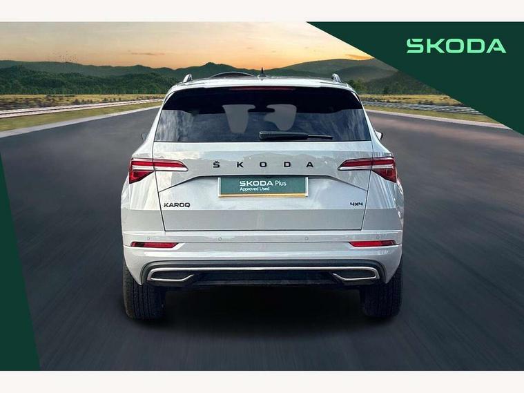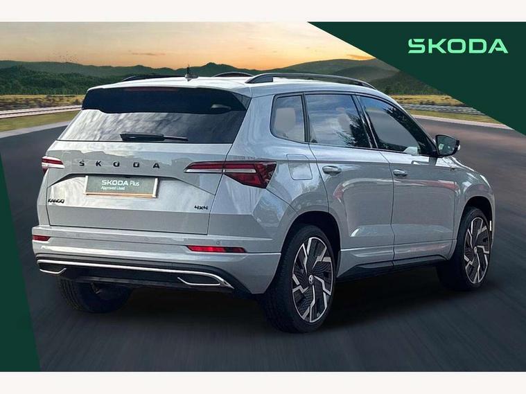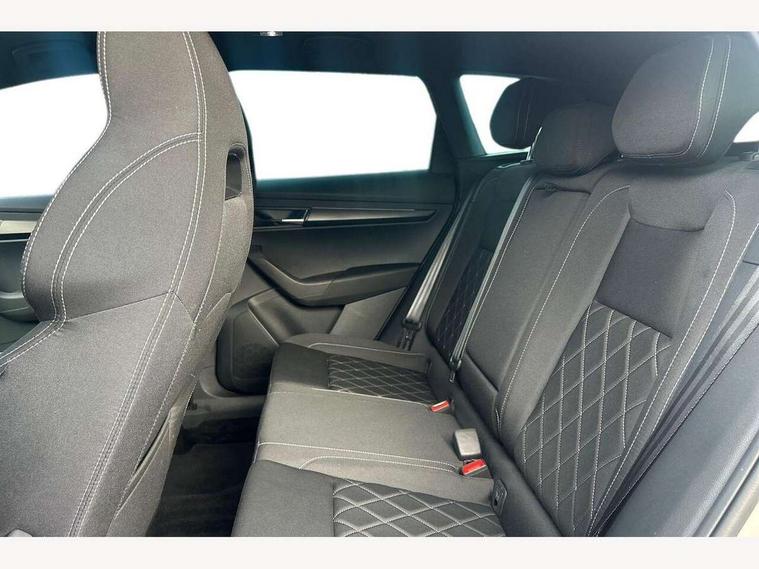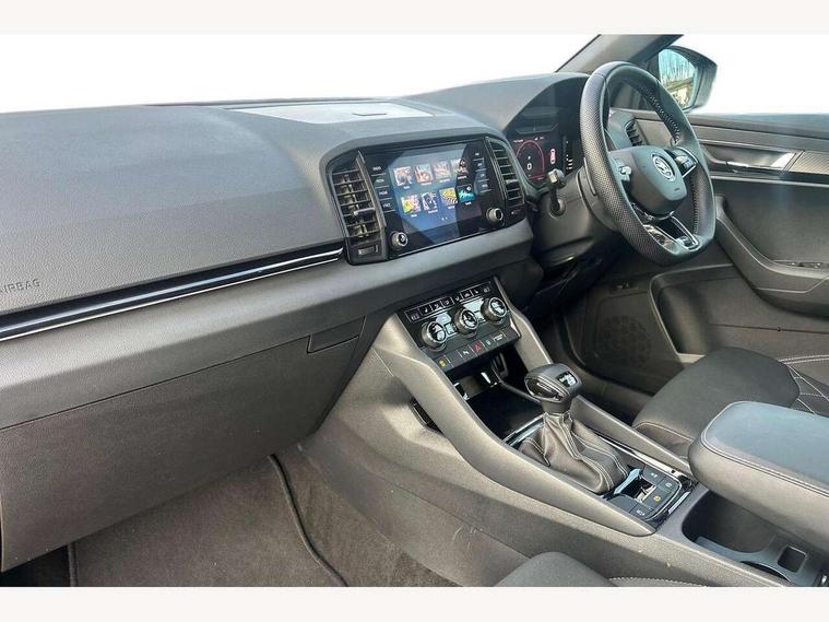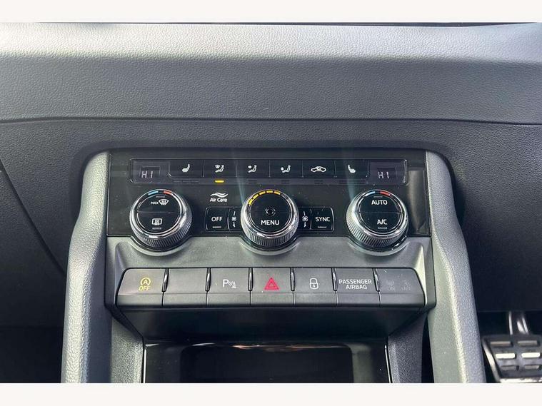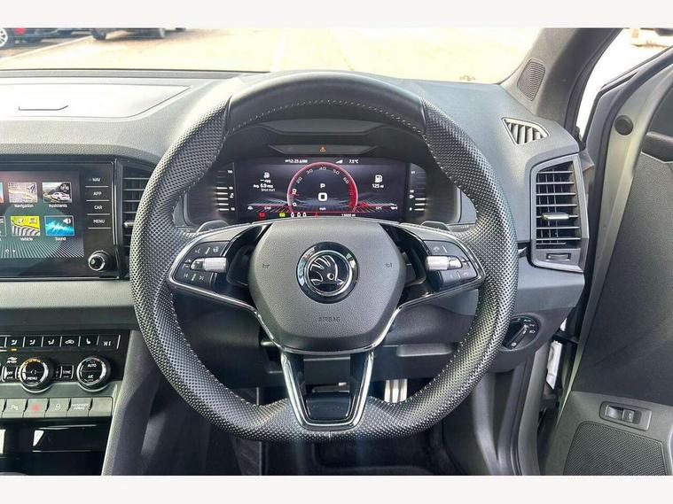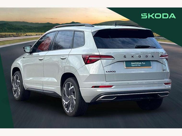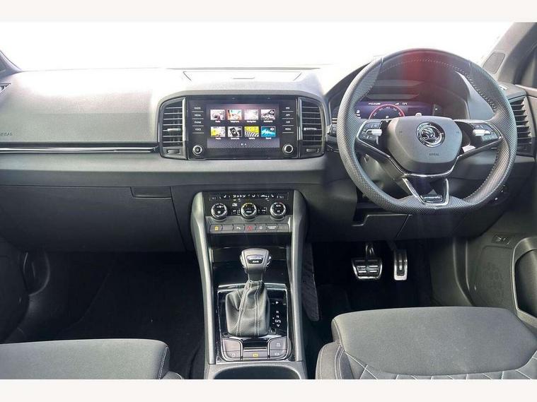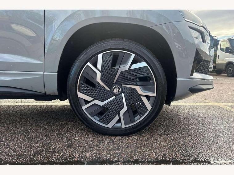 8" Digital display, Care connect, Driver fatigue sensor, Emergency services call system, Outside temperature gauge, Service interval indicator, SmartLink wireless for Apple and wired for Android, Start/stop system with regenerative braking, USB C Port x 2 in front centre console, Virtual cockpit, Virtual pedal with electrically operated boot door, 8 Speakers, DAB radio with Bluetooth, USB connection, Acoustic glass, Aero front windscreen wipers with intermittent function, Auto dimming rear view mirror with light and rain sensors, Black door mirrors, Black electric window control buttons, Black radiator grille, Black roof rails, Body colour door handles, Dynamic headlight range control with cornering light function, Electric front and rear windows with child proof lock, Front door steps with SportLine logo, Heated rear windscreen, LED daytime running lights, LED rear lights with high functionality welcome effect and dynamic indicators, Light assistant (coming/leaving home/tunnel light), Panoramic sliding sunroof, Plastic scuff plates, Privacy glass, Protective door side sills in body colour, Rear diffuser, Rear side wing doors, Rear spoiler, Rear window wiper with washer system and intermittent control, Safety reflectors on front doors, Skoda lettering on tailgate in black, Sportline badge on front fender, Sportline decorative inserts with badging, Sports front and rear bumpers, 1.5 litre bottle holders in driver and front passenger door panels, 12V socket in boot, 12v socket in front centre armrest with storage compartment and rear air vents, 2 Folding hooks and nets in boot, 3 rear height adjustable headrests, 3 seat bench in 2nd row, 3 spoke leather sports multifunction steering wheel and silver stitching with gear shift paddles, 4 foldable roof handles with rear coat hooks, Black floor carpet, Black roof headlining, Chrome inner door handles, Double sided boot floor, Foldable hooks in the boot, Front head restraints, Height adjustable front three point seats belts with tensioners, Height/reach adjust steering wheel, Ice scraper, Illuminated glovebox, Illuminated luggage compartment, Interior noise suppression, Isofix child seat preparation outer rear, Manual lumbar support for front seats, Pen holder, Pollen filter, Rear boot cover, Rear reading lights, Rear seats fixed folding and divided 60:40, Rubbish bin door, Safety vest holder, Single front passenger seat, Storage box in upper central dashboard closed, Sunvisors with illuminated vanity mirrors, Textile floor mats, Ticket holder, Titan black interior ceiling, Welcome animation with sportline logo, Light Pack - Karoq, Parking pack - Karoq, Automatic door unlocking in case of crash, Automatic fuel cut off in case of crash, Child locks on rear doors, Driver airbag, Electronic parking brake with auto hold function, Emergency rear braking signal, ESC including ABS, MSR, ASR, EDS, HBA, DSR, RBS, MKB and traction control, Front side airbags, Hill hold control, Knee airbags, Passenger airbag with switch-off function, Pedestrian monitor, Seatbelt reminder signalisation and pretensioner for all seats, Three point seatbelts rear, Two tone horn, Tyre pressure display, Tyre pressure monitor, Alarm with interior monitoring, back up horn and tilt sensor with safe function, Electronic engine immobiliser, Keyless entry and start/stop, Remote central locking with 2 remote folding keys, Black air vent surround, Black centre console, Satin black dashboard, Satin black door trim, 19" Vega black polished alloy wheels, Anti-theft wheel bolts protection, Matt black aero hub caps, Storage on wheel cover, Tool kit,