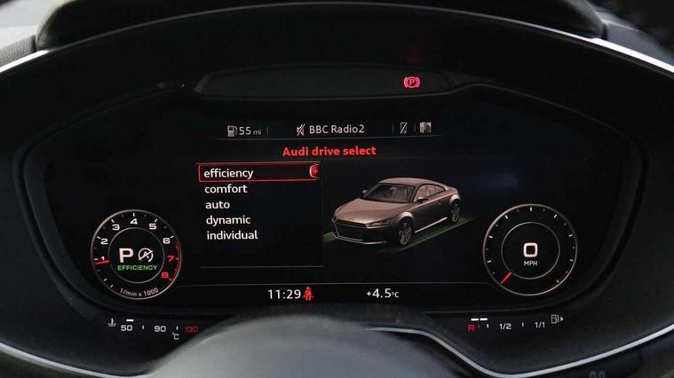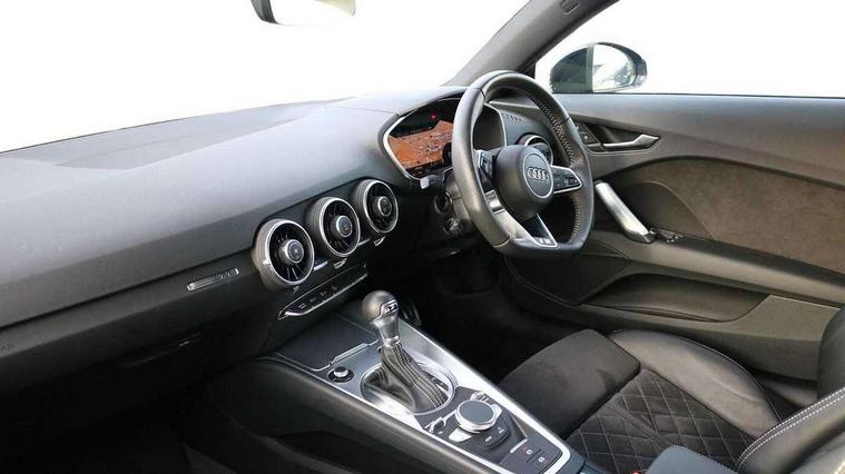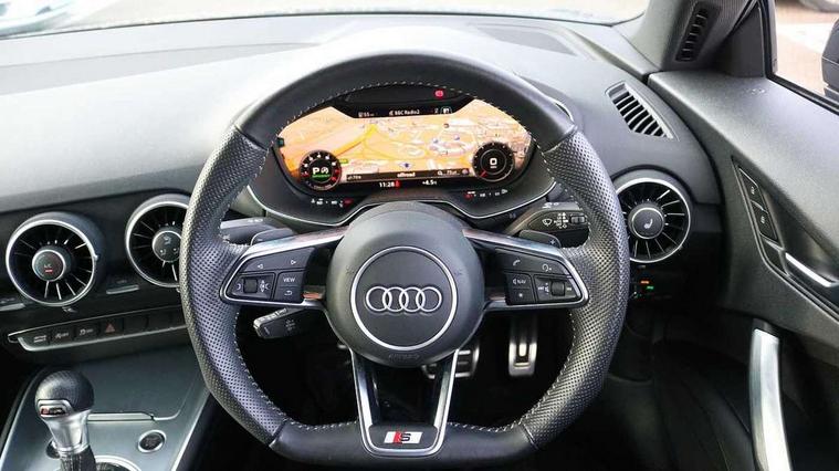Audi drive select with 4 Pre configured modes, Audi smartphone interface, Audi virtual cockpit - 12.3" high-resolution LCD display with fully customisable instrument cluster, Cruise control + speed limiter, Emergency call service, MMI touch panel, Mobile phone preparation with bluetooth interface, Progressive power assisted steering, Service interval indicator, Start/Stop system with energy recuperation, TP memo, Sports suspension, AM/FM radio, Bluetooth audio streaming, DAB Digital radio, MMI Radio with CD player and SD/XC card slot, Auto dimming rear view mirror, Auto headlight range control, Black chrome tailpipe, Dark privacy glass from B-pillar backwards, Electric folding door mirrors, Electric front windows, Electrically adjustable and heated door mirrors with integrated LED side indicators, Front fog lights, Green tinted heat insulating glass, LED 3rd brake light, LED daytime running lights, LED headlights with LED rear lights + dynamic rear indicators, Light and rain sensors, Rear boot, Sunband for windscreen, 12V socket, 2 rear seats, 3 spoke flat bottomed high multi-function leather sport steering wheel with gearshift paddles, 4 way electric lumbar support for driver and front passenger, Black headlining, Contrasting silver stitching in steering wheel, Door sill trims, Extended aluminium look with stainless steel pedals, Front centre armrest, Front passenger seat, Front super sports seats, Heated front seats, Height adjustable driver's seat, Height adjustable front head restraints, Height/reach adjust steering wheel, ISOFIX child seat mounting for front passenger seat with airbag deactivation, Manual adjustment of seat height, fore/aft position, seat angle, seat depth and backrest angle, Perforated leather gearknob in black, Rear head restraints, Rear top tether child seat ISOFIX attachment, Split folding rear seat, Tool kit, Black styling pack - TT, Non smoking pack - TT/TT RS, 3 point front seat belts, ABS, ASR traction control, Curtain airbags, Driver and front passenger airbag with front passenger airbag deactivation, EDL traction control, Electromechanical parking brake, ESP, First aid kit, Front side airbags, Head airbags, Hill hold assist, Seatbelt warning, Tyre pressure loss indicator, Warning triangle, Anti theft alarm, Anti theft wheel bolts, Immobiliser, Keyless Go, Remote central locking, Matt brushed aluminium inlays, Tyre repair kit,