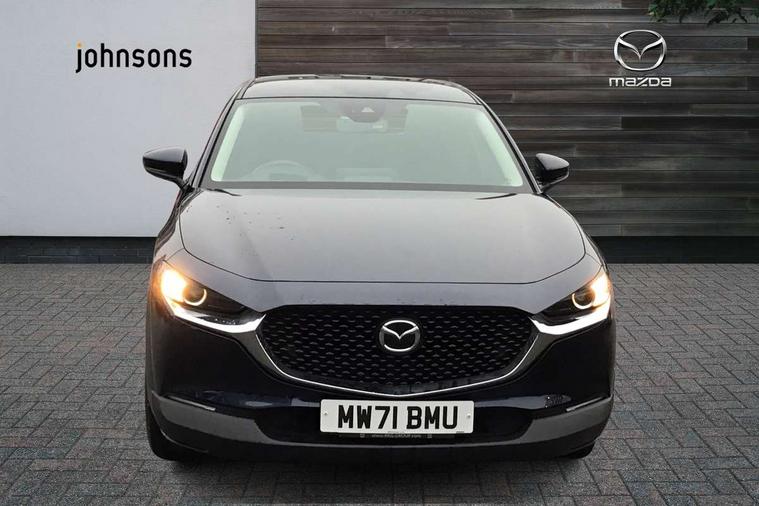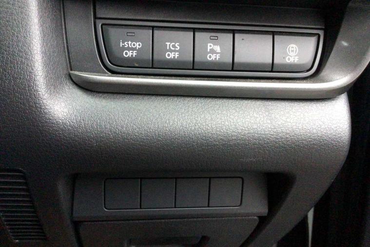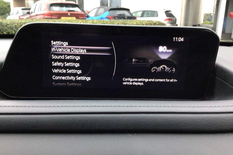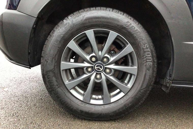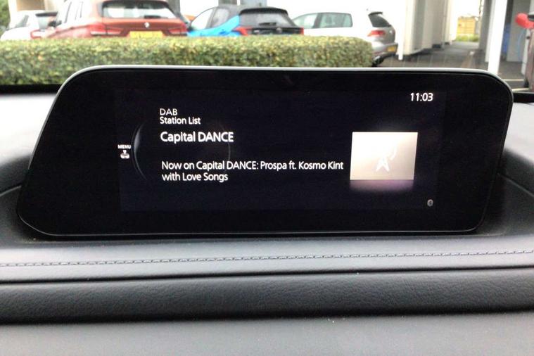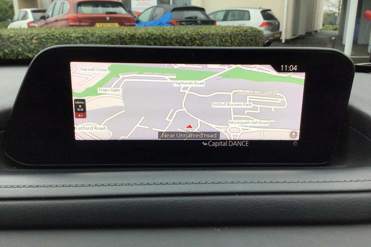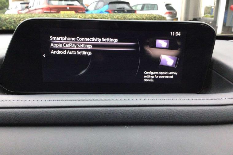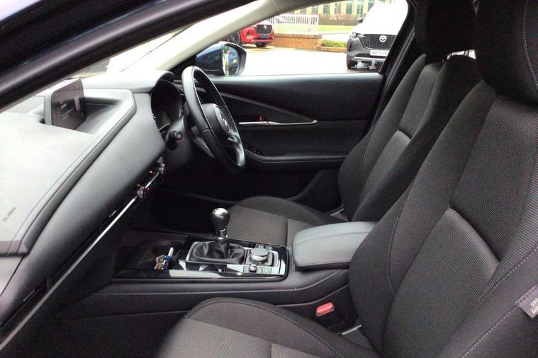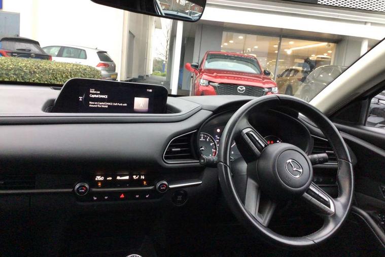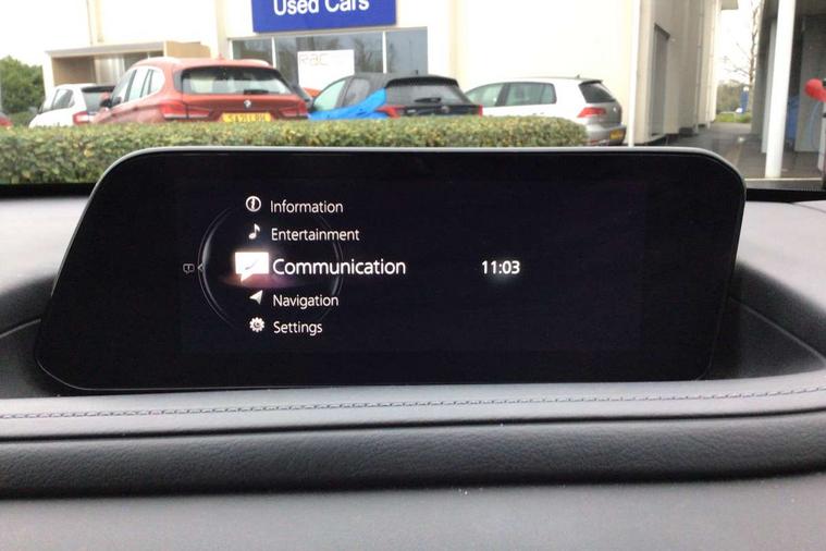 7" TFT Colour driver instrument panel display, 8.8" Colour centre touch screen display with Mazda Connect infotainment, Adaptive cruise control (Mazda radar cruise control), Apple car play/Android Auto, Blind spot monitoring with rear cross traffic alert, Driver attention alert system, E-call with GPS, Emergency stop signalling system, Engine start/stop button, Front and rear parking sensors, Integrated bluetooth, Integrated Mazda navigation system, Intelligent speed assist, Lane keep assist system (LAS) with Lane departure warning system (LDWS), Mazda connected services, PAS, Reversing camera, Service indicator, Traffic sign recognition, Trip computer, Cylinder Deactivation, i-stop, 2 USB charging ports in front inner central armrest, AM / FM / DAB radio with 8 speakers, Multimedia Commander including separate volume dial, Steering wheel mounted audio/bluetooth controls, B-pillar and C-pillar garnishes in satin black finish, Auto dimming driver's door mirror, Auto dimming rear view mirror, Auto headlight levelling, Body coloured, electrically adjustable, heated auto power folding door mirrors with integrated indicators, Chrome finish signature wing in front grille, Coming/leaving home lighting function, Dual chrome exhaust, Dusk sensing headlights, Electric front/rear windows with one touch auto up/down, Front kodo turn signal, Gloss black rear roof spoiler, LED headlights with halogen daytime running lights and high beam control, LED rear combination lights, Rain sensing front wipers with adjustable speed and intermittent wipe, Rear fog lights, Rear wiper, Satin black front grille, 12V power outlet in centre console, 60/40 split fold down rear seats, Cloth upholstery with interior accents, Dark cloth door panel inserts, Dashboard, door cards and front centre armrest in black cloth, Driver and front passenger visors with covered vanity mirror and driver ticket holder, Driver seat manual slide, recline, height and seat tilt adjust, Driver, front passenger and two rear door storage, Driver, Front passenger and two rear grab handles with coathooks, Dual zone climate control air conditioning with rear air vents, Folding rear centre armrest with two cup holders, Front and rear (x3) head restraints, Front and rear LED lighting, Front armrest, Front centre storage with two cupholders, Front passenger seatback pockets, Front passengers seat manual slide, recline and height adjustment, Gear shift indicator, Glovebox illumination, Heated front seats with 3 stage setting, ISOFIX child seat anchorage points attached on outer rear seats, Leather wrapped gear shift knob, Leather wrapped steering wheel with telescopic and tilt adjustment, LED luggage compartment lighting, Light roof headlining and pillars, Roof mounted sunglasses holder, 3 point ELR front seat belts x2 with pretensioners, 3 point ELR rear seat belts, Anti-lock braking system (ABS), Drivers knee airbag, DSC - Dynamic Stability Control, Electronic parking brake with auto disengage function and auto hold function, Front and rear curtain airbags, Front dual stage driver and single stage front passenger airbags, Front passenger airbag cut-off switch, Front side airbags, Front smart city brake support, G-Vectoring control plus, Hill launch assist, Mild Hybrid system with regenerative braking, Seatbelt reminder for driver/front passenger and rear seats, Traction control system (TCS), Tyre pressure monitoring system (TPMS), Remote central locking with deadlocking and automatic door lock when driving, Smart keyless entry, Thatcham accredited alarm and immobiliser, 16" Grey alloy wheels, Emergency tyre repair kit,