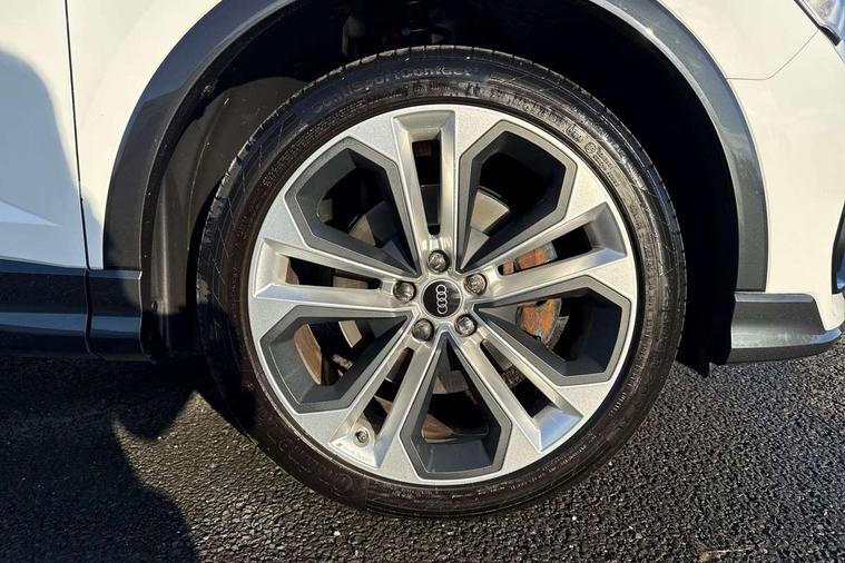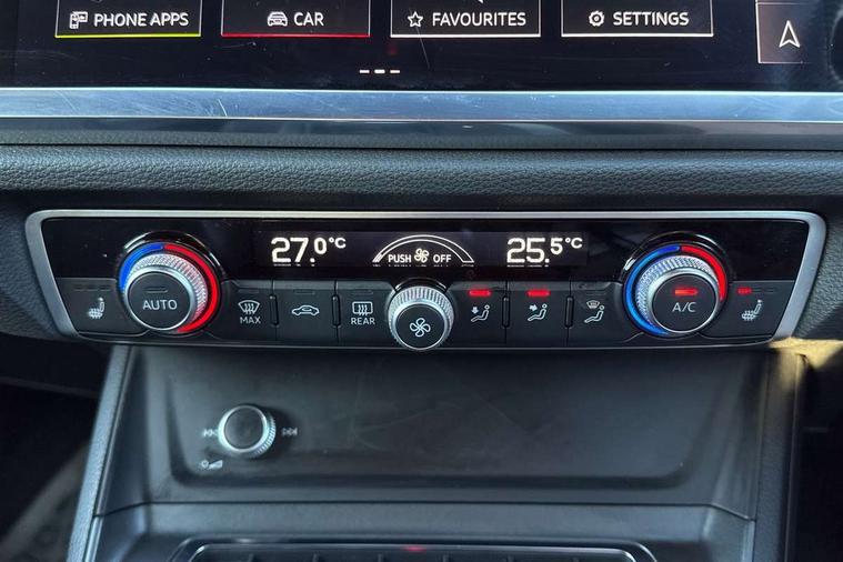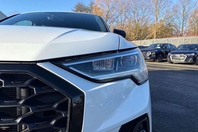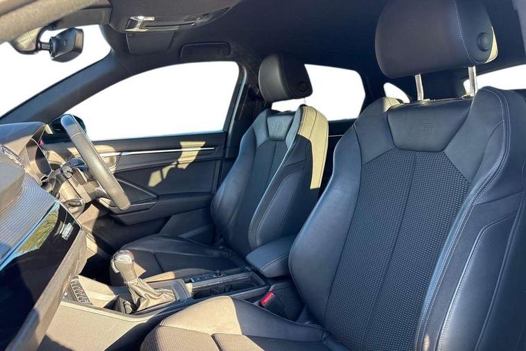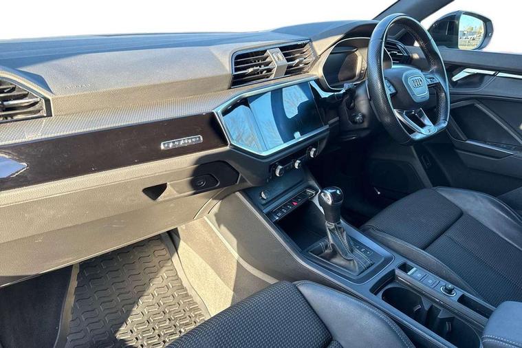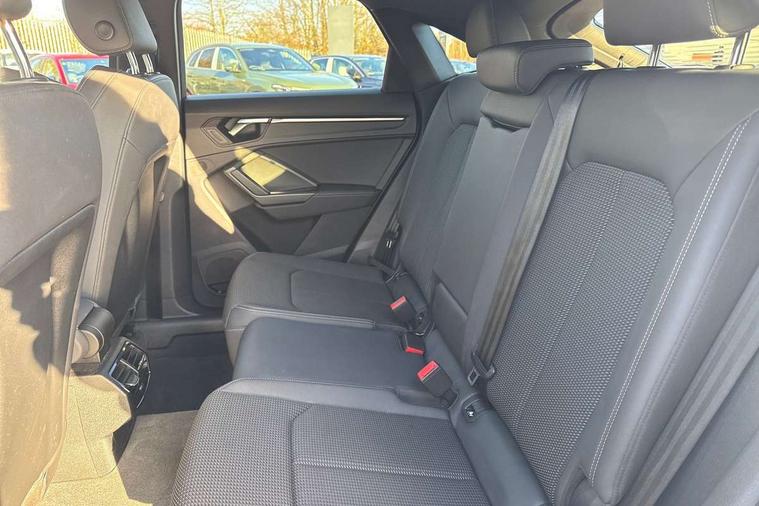 360 degree camera, Audi connect safety and service, Audi drive select, Audi lane departure warning, Audi Virtual Cockpit - 10.25" display, Bluetooth interface, Camera based traffic sign recognition, Distraction and Fatigue warning, Legal emergency call, MMI Navigation Plus with high resolution 10.1 inch touchscreen colour display, Phonebox light with wireless charging, Power operated tailgate, Progressive steering, Service interval indicator, Smartphone interface includes wireless Apple carplay/Android Auto, Start stop system with recuperation, Voice control system with natural language interaction, Sports suspension, 2 USB-C ports with charge and data functions, DAB digital radio module, SONOS premium sound system, Acoustic windscreen, Audi Beam uses LEDs to project the Audi logo onto the ground as you exit your Q3, Auto dimming door mirrors, Auto dimming frameless rear view mirror, Electrically folding, adjustable and heated door mirrors with integrated LED side indicators and kerb view function for passenger side, Front and rear electric windows, Front fog lights, Front underbody protection in manhattan grey paint finish, High gloss black finish B and C pillars, Honeycomb design radiator grille in matt anthracite black, LED Dynamic rear indicators, LED rear lights, LED third brake light, Matrix LED headlights with LED daytime running lights, Panoramic glass sunroof, Privacy glass dark tinted rear and rear-side windows (from B-pillar backwards), Rain and light sensors, Rear diffuser grille in grained matt black, Rear diffuser strip in matt anthracite black, Rear side wing doors, Rear underbody protection in matt black, Rear wiper, S line front and rear bumpers and side skirts in contrasting Manhattan grey paint finish, Variable front intermittent wipers, 12V socket in rear centre console, 3 seat bench in 2nd row, 40:20:40 folding with manual adjustment for 60:40 forwards/backwards position and backrest angle, Adjustable rear seat bench/backrest with centre armrest and cupholder, Black carpet mats, Black cloth headlining, Dual zone electronic climate control, Electric lumbar support, Electrically adjustable front seats, Front and rear black floor mats with contrast stitching in rock grey, Front and rear headrests, Front centre armrest, Heated front seats, Height and reach adjustable steering wheel, Illuminated door sill trims with S logo, ISOFIX child seat mounting for front passenger with airbag deactivation and outer rear seat including top tether attachment point for outer rear seats, Luggage compartment sill protection in stainless steel, Perforated leather gearknob, Single front passenger seat, Stainless steel pedals, Twin leather upholstery with front sport seats + S embossing, Black styling pack - Q3, Non smoking pack - Q3, 3x3 point rear seatbelts, 6 airbags - Driver, front passenger, curtain and side windows, Audi pre-sense front with pedestrain and cyclist recognition, Electrically operated child locks on rear doors, Electromechanical parking brake, Electronic stabilisation control including ABS, ASR and EDL, Front seatbelt reminder, Hill descent control, Hill hold assist, Pre sense basic, Seatbelt monitoring, Tyre pressure warning, Warning triangle and first aid kit, Advanced key, Anti theft wheel bolts, Immobiliser, Remote central locking, Thatcham approved category 1 anti theft alarm, Aluminium look interior elements, Detail dashboard around MMI touch colour display in glass look, black with surround in aluminium look, Leatherette door armrest, Piano black inlay,