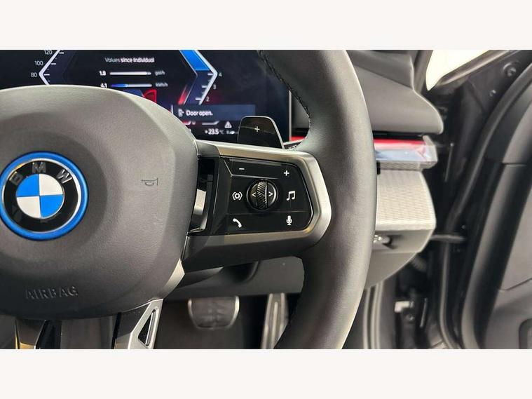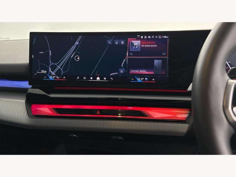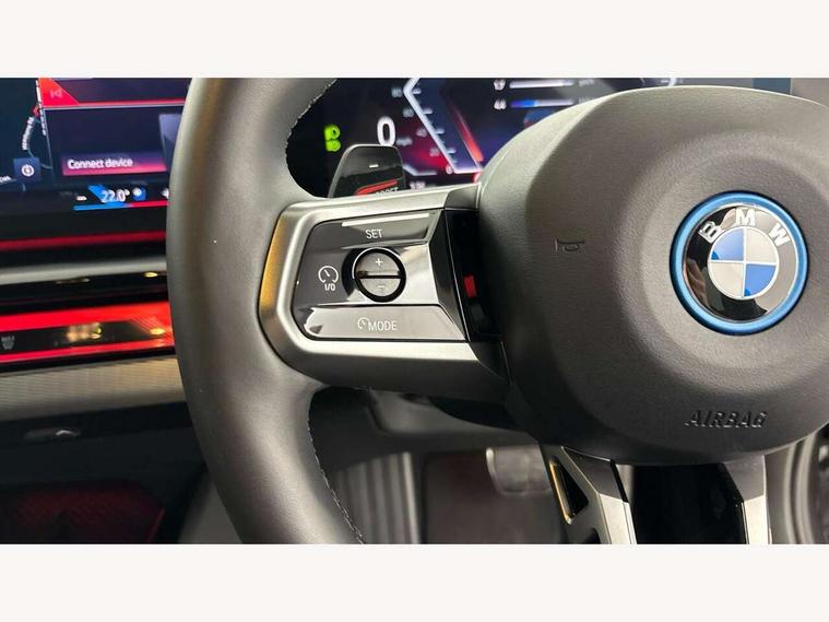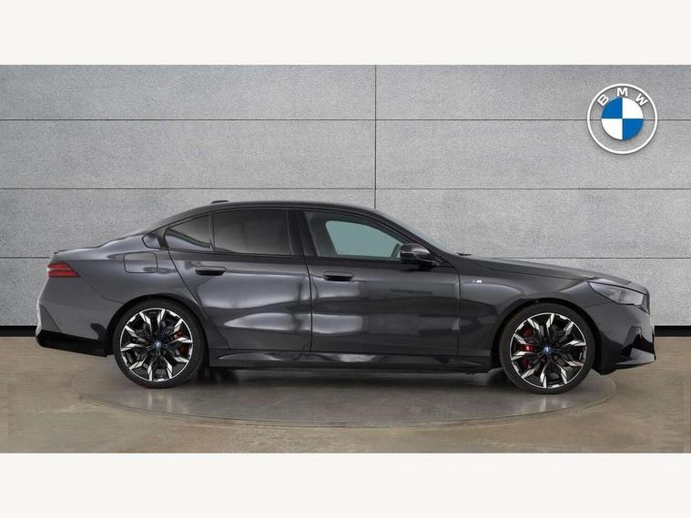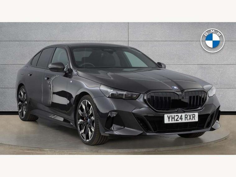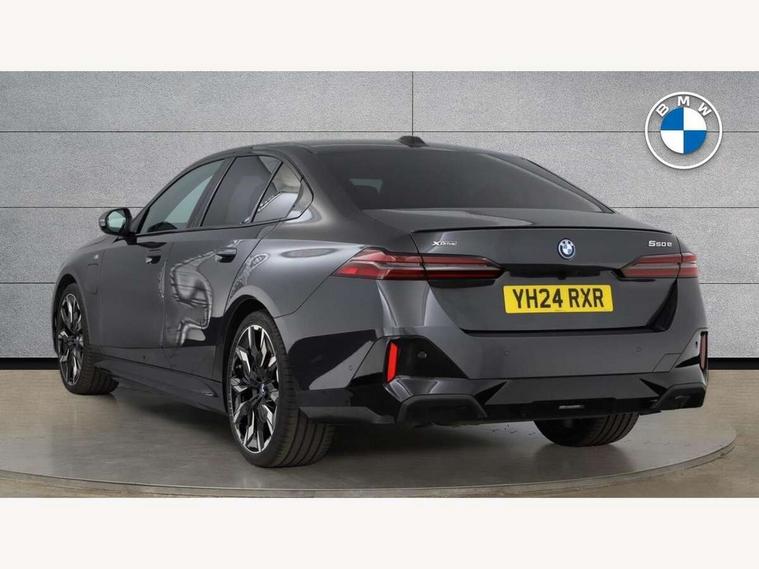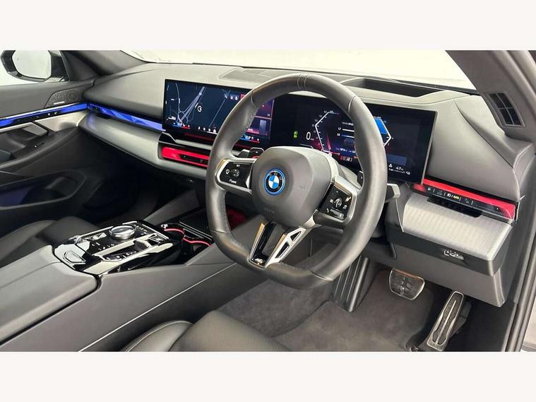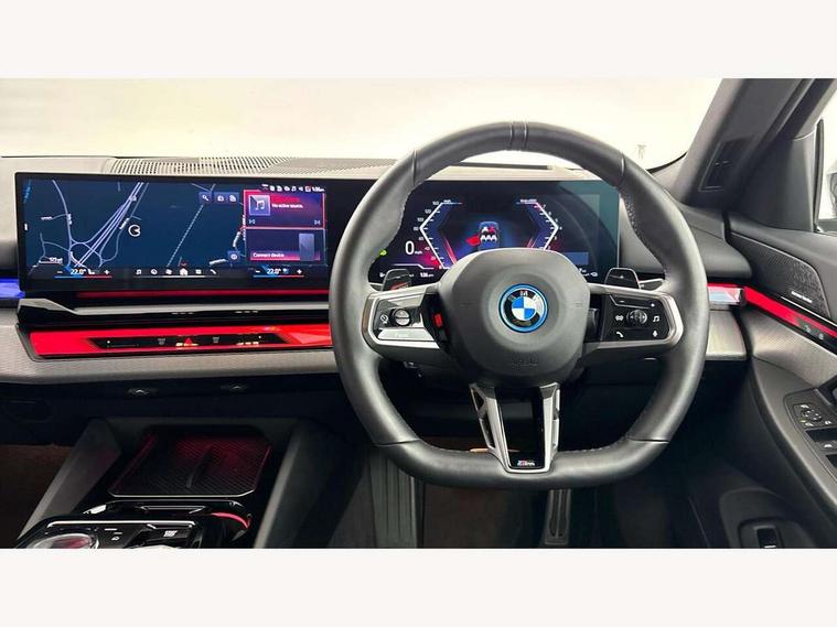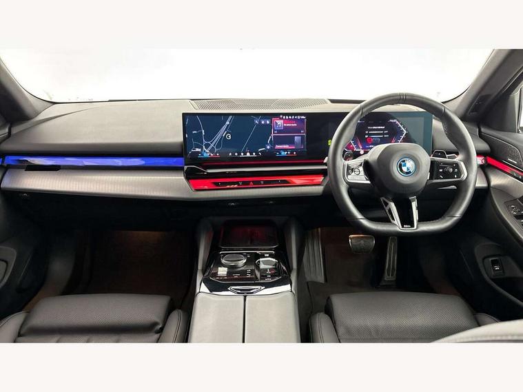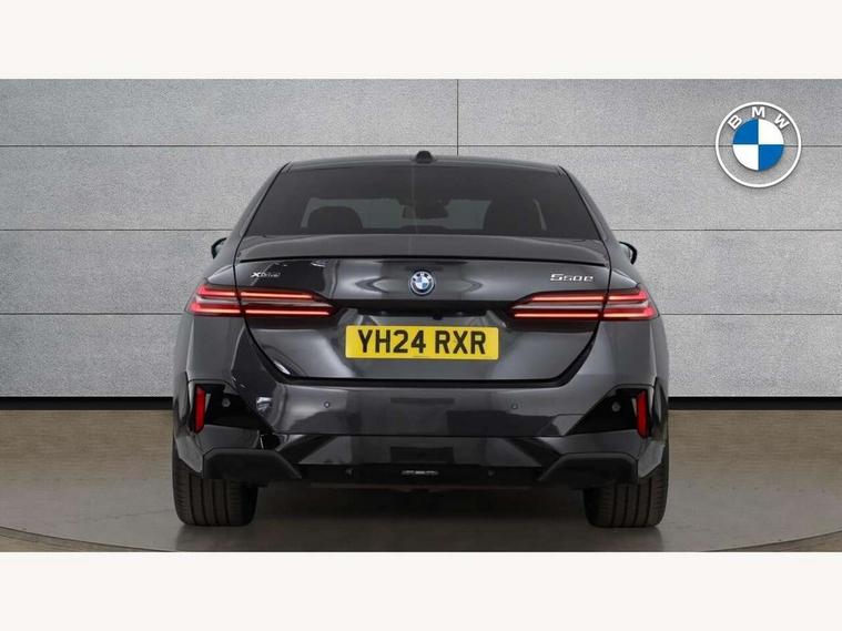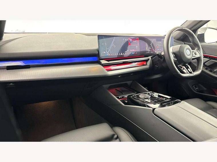 BMW ConnectedDrive online services, BMW legal emergency call, BMW Teleservices, Brake pad wear indicator, Cruise control with brake assist, Multifunctional instrument panel, Oil sensor for level and grade, On board computer inc. average speed, fuel consumption, liquid crystal Info display, journey computer, outside temperature display, personal profile, On-board diagnosis - OBD, PAS, Powered by Operating System 7.0, Run flat indicator, Service interval indicator, Stop/start button, 8 speed automatic steptronic transmission with gearshift paddles, AC charging cable professional (mode 3) for public charging, Expert mode, Launch control, DAB tuner, Personal eSim, Acoustic glazing, Adaptive LED headlights with high beam assist, Automatic cornering lights, Automatic windscreen wipers and automatic headlight, Body colour door handles, Body coloured bumpers, Dynamic brake lights with LED technology, Electric front and rear windows with fingertip open/close + anti-trap facility and comfort closing function, Follow me home headlight function, Heated windscreen washer jets, LED daytime running lights, LED third brake light, M high gloss shadow line with extended contents - Radiator grille frame, struts and strip in rear light, M light shadowline - Dark design of selected elements of the headlight and rear lights, Rear boot, Rear side wing doors, 2 zone automatic air conditioning, 3 seat bench in 2nd row, 3 spoke leather M steering wheel in BMW M specific design with M badge, 40/20/40 split folding rear seats with backrest, Armrest - front and rear integrated door trim, centre console includes storage compartment, rear centre includes 2 cupholders, Child seat ISOFIX attachment with rear outer seats includes top tether, Electric adjustable steering column, Electrically adjustable lumbar support for driver and front passenger, Front sport seats, Heated driver and front passenger seats, M Anthracite headlining, M Sport pedal covers in stainless steel, Partially electric front seat adjustment, Rear headrests, Single front passenger seat, Through load system, Velour floormats, Wireless charging tray, Ambient lighting pack - 5 Series/I5, BMW Iconic glow kidney grille exterior package, Connected package professional - 5 Series/I5, Driving assistance pack - 5 Series/I5, Expanded exterior mirror package - 5 series/I5, M high gloss shadow line pack - 5 Series/ I5, M Sport exterior styling pack - 5 Series/I5, 3 rear three point seatbelts, Active protection, Anti-lock braking system (ABS), Brake assist, Brake energy regeneration, Cornering brake control (CBC), Crash sensor activating central locking release, hazard warning lights, fuel cut off and interior lighting, Driver and front passenger airbags, Driver central airbag, Driver/front passenger side airbags, DSC - Dynamic Stability Control, Dynamic brake control, Dynamic Traction Control - DTC, Electromechanical parking brake with automatic drive away release and auto hold function, Electronic brake force distribution, Engine drag torque control, Front and rear brake discs with interior ventilation, Front and rear curtain airbags, Front head restraints with anti-whiplash, Head airbags for first and second row seats, Hill start assist, Locking of doors after driving off, M seat belts, M Sport brakes in high gloss red painted brake callipers with M designation, Mechanical child proof lock on rear doors, PC iBrake PostCrash approach control warning with light braking function, Side impact protection, Trailer stability control, Two tone horn, Tyre pressure monitoring system, Warning triangle and first aid kit, Alarm system, BMW Digital key, Locking wheel bolts, Tyre repair kit,