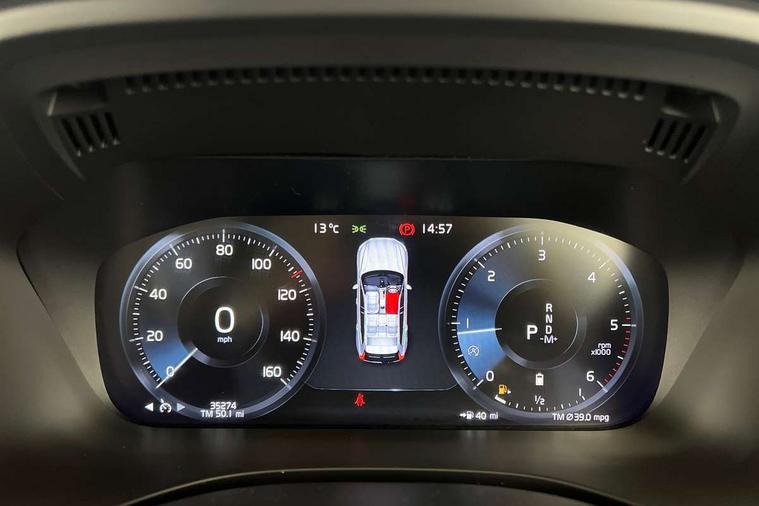 12.3" Active TFT crystal driver's instrument display, 9" Touch screen, Adjustable steering wheel force, Bluetooth handsfree system, Drive mode selector, Driver alert control with lane keeping aid, Oncoming Lane Mitigation, Sensus navigation with European mapping and traffic information, Service interval indicator, Speed limiter, Speed sensitive steering, Trip computer, Voice control system, Volvo on call, 8 speed automatic transmission with start/stop + manual change functions, Diesel particulate filter, DAB Digital radio, Steering wheel remote infotainment controls, Adaptive brake lights with high level LED brake lights, Auto dimming interior + exterior mirrors, Automatic headlight levelling system, Body colour bumpers, Colour coordinated auto folding and heated power door mirrors, Electric front+rear windows, Front aluminium tread plates, Home safe and approach lighting, Illuminated side steps, Integrated silver roof rails, LED Headlights + Active high beam incorporating daytime running lights, Piano black front grille with chrome surround, Rain sensor with automatic windscreen wiper activation, Rear wiper, Roof antenna, Roof spoiler, Tinted windscreen, Twin exhaust tailpipes with chrome finishers, Visible VIN plate, 12V socket in front tunnel console and luggage compartment, 3 spoke leather steering wheel with chrome trim, B Pillar ventilation, Bright metal luggage threshold, Centre armrest storage illumination, Centre console cupholders and storage, Floor mats, Front footwell illumination, Front reading lights, Head restraints for all seats, Heated front seats, Height/reach adjustable steering column, Illuminated glovebox, Illuminated luggage compartment, Illuminated vanity mirrors + ticket holder, Leather upholstery, Load cover, Load protection net, Power height adjustable passenger seat with lumbar support, Rear armrest / integral cup holders / storage tray, Rear seat concealed storage, Theatre lights, Underfloor stowage compartment, Versatile split folding rear seat - 60/40, 5 three point seatbelts, City safety with steering support with Pedestrian + cyclist + large animal detection + front collision warning with full auto brake, Drivers knee airbag, Dual stage driver/passenger airbags, Electronic parking brake with auto hold, First aid kit, Hill descent control, Hill start assist, IC (Inflatable Curtains) - Full Length, Passenger airbag cut-off device, Road sign information display, Run off Road Mitigation, Run off Road Protection, Seatbelt reminder and pretensioners, SIPS (Side Impact Protection System), SIPS airbags, Slippery road and hazard light alert, Stability and Traction Control with Spin control, Engine Drag Control and Corner Traction Control, Tyre pressure monitoring system, Vehicle deceleration control with Anti-lock Brake System, Electronic Brake Distribution and Emergency Brake Assist, Warning triangle, WHIPS whiplash protection system - front, Anti-theft alarm including immobiliser/volume sensor + level sensor, Care key with user defined top speed, Key integrated remote control central locking + fuel flap with deadlocking system and auto open/close power windows, Locking wheel nuts, Private locking for tailgate, Iron ore inlays,