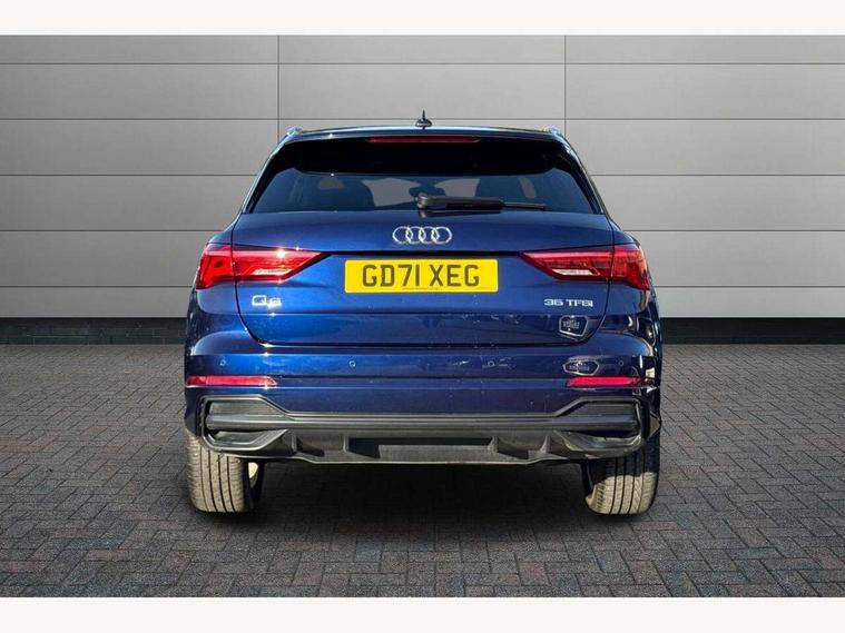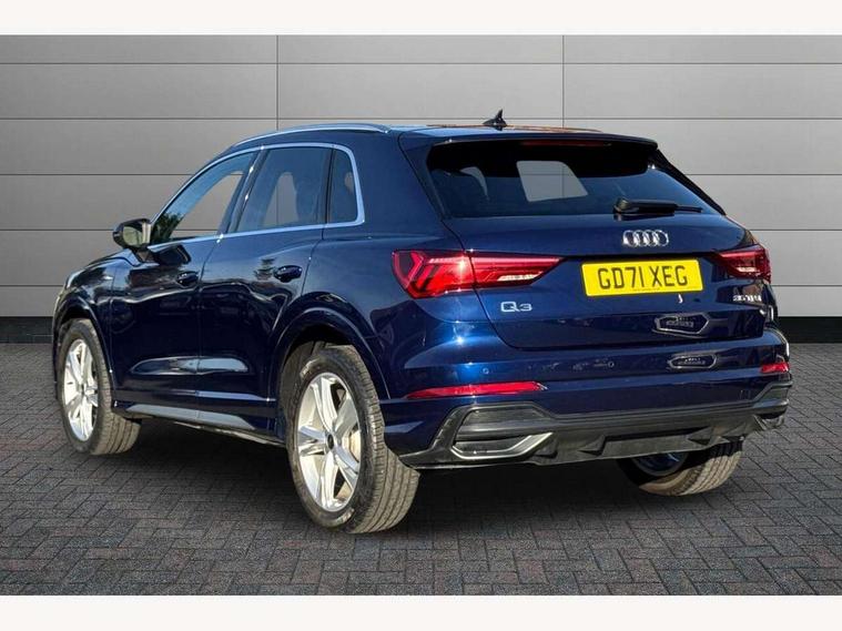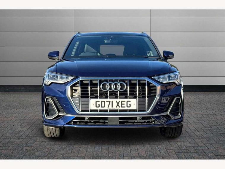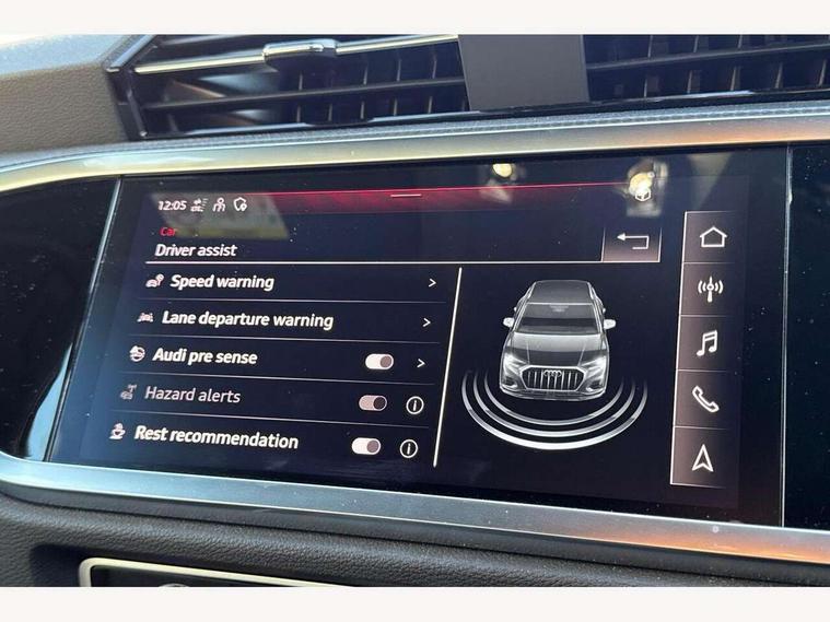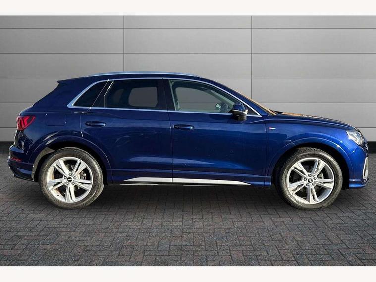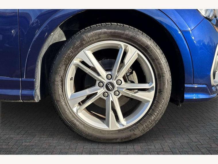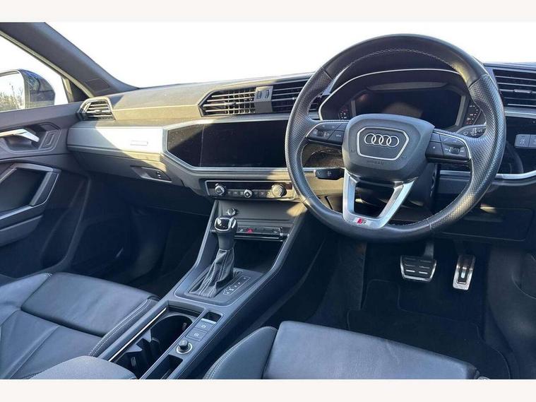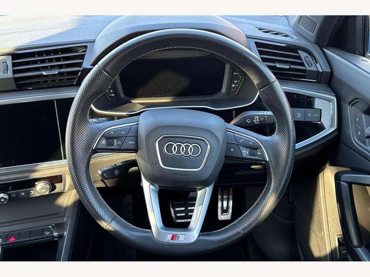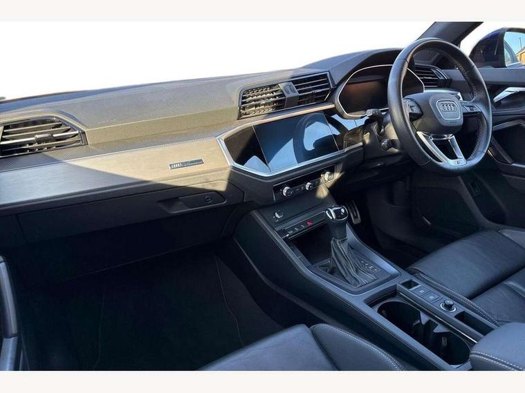 Amazon alexa Integration, Audi connect safety and service (e-call), Audi drive select, Audi lane departure warning, Audi smartphone interface includes wireless Apple carplay/Android Auto, Audi Virtual Cockpit - 10.25" display, Bluetooth interface, Camera based traffic sign recognition, MMI Navigation Plus with high resolution 10.1 inch touchscreen colour display, Power operated tailgate, Progressive steering, Service interval indicator, Start stop system with recuperation, Voice control system with natural language interaction, 48V Mild hybrid technology, Sports suspension, 2 USB-C ports with charge and data functions, 6 passive loudspeakers, DAB digital radio module, Acoustic windscreen, Aluminium roof rails, Aluminium window trim, Auto dimming frameless rear view mirror, Body coloured bumpers, Electrically folding, adjustable and heated door mirrors with integrated LED side indicators and kerb view function for passenger side, Front and rear electric windows, Front fog lights, Front side air inlets in matt platinum grey, Front spoiler blade in matt platinum grey, Grille vertical bars in aluminium silver/Matt, High gloss black finish B and C pillars, LED headlights with LED daytime running lights and dynamic rear indicator, LED rear lights, Privacy glass dark tinted rear and rear-side windows (from B-pillar backwards), Rain and light sensors, Rear diffuser strip in matt titanium black, S line badges on front wings, S Line front and rear bumpers, Side skirt insert in matt Platinium grey, Silver chrome grille surround, Titanium black radiator grille, 12V socket in rear centre console, 40:20:40 folding with manual adjustment for 60:40 forwards/backwards position and backrest angle, Adjustable rear seat bench/backrest with centre armrest and cupholder, Black cloth headlining, Dual zone electronic climate control, Front and rear black floor mats with contrast stitching in rock grey, Front and rear headrests, Front and rear roof module including reading lights, Front centre armrest, Glove compartment lighting, Height and reach adjustable steering wheel, Illuminated door sill trims with S logo, ISOFIX child seat mounting for front passenger with airbag deactivation and outer rear seat including top tether attachment point for outer rear seats, Luggage compartment light, Manual front seats with height adjustment, Perforated leather gearknob, Stainless steel luggage compartment sill finisher, Stainless steel pedals, Tool kit, Non smoking pack - Q3, 3x3 point rear seatbelts, 6 airbags - Driver, front passenger, curtain and side windows, Audi pre-sense front with pedestrain and cyclist recognition, Electrically operated child locks on rear doors, Electromechanical parking brake, Electronic stabilisation control including ABS, ASR and EDL, Hill descent control, Hill hold assist, Pre sense basic, Seatbelt monitoring, Tyre pressure warning, Warning triangle and first aid kit, Anti theft alarm, Anti theft wheel bolts, Remote central locking, Dark matt brushed aluminium inlay, Detail dashboard around MMI touch colour display in glass look, black with surround in aluminium look, Leatherette door armrest, Tyre repair kit,