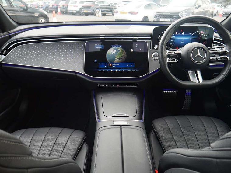 12.3" Driver display screen, 14.4" central media display, 5G Communications module, Acoustic presence indicator, Attention assist, Augmented reality navigation, Blind spot assist, Brake wear warning display, Direct steer speed sensitive steering, ECO start/stop function, Emergency call assistance, Evasive manoeuvre support, Fluorescent jacket for driver, Hard disc navigation, Head up Display, MBUX navigation premium, MBUX voice control, Mercedes connect me, Outside temperature display, Preinstallation for live traffic, Remote and charging services plus, Remote bootlid closing, Selfie and video camera, Service indicator (ASSYST), Status display for rear seat belts in instrument cluster, Trip computer in multifunction display showing current fuel consumption, Wireless charging, Wireless smartphone integration with Apple CarPlay and Android auto, 5m Domestic charging cable, 5m Public charging cable, 9G TRONIC automatic transmission, AC charging, Agility control suspension, Sporty engine sound system, Burmester 4D premium sound system, DAB Digital radio, Preinstallation for MBUX Entertainment Plus, Sound visualisation, 3rd brake light, Acoustic glass, Adaptive brake lights, Aerial integrated in rear window, AMG bodystyling, Auto dimming driver's door mirror, Auto dimming rear view mirror, Black radiator grille, Digital air vent control, Electric folding door mirrors, Electric windows with one touch opening/closing and obstruction sensors, Electrically adjustable and heated door mirrors, Heat insulating privacy glass, LED daytime running lights, LED digital light with adaptive highbeam assist plus, Pre-installation for roof rail systems, Rear boot, Rear side wing doors, Surround lighting with logo projection, 3 seat bench in 2nd row, 4 way lumbar support, Active ambient lighting, AMG brushed stainless steel sports pedals with rubber studs, AMG floor mats, AMG line interior, Automatic child seat recognition sensor, Central stowage compartment with USB socket for use with Android Auto and Apple CarPlay, Comfort seats, Courtesy lights in rear grab handles with reading light functionality, Folding rear seat backrest, Front centre armrest with stowage compartment, Glove compartment - lockable, air conditioned and illuminated, Head restraints for driver and front passenger (four-way adjustability) and in rear (two-way), Heated front seats, Illuminated door sills, Multifunction sports steering wheel in nappa leather, Roof liner in black fabric, Seat occupancy sensor for front passenger seat, Single front passenger seat, Sunvisors with illuminated vanity mirrors, Thermotronic 4 zone climate control, Keyless Go comfort package - E Class, Leather package - E Class, Memory package - E Class, Parking package with 360 degree camera - E Class, USB plus package - E Class, 3x3 point rear seatbelts, Active bonnet pedestrian safety measure which detects an impact and raises bonnet, Adaptive brake system with HOLD function and brake drying in the wet, Anti-lock braking system (ABS), Automatic front passenger airbag deactivation, Central airbag, Childproof locks manually operated for rear doors and electrically operated for rear power windows, Driver and adaptive front passenger airbags, Electronic parking brake, Electronic Stability Programme, Hill start assist, ISOFIX child seat attachment points two outer rear seats, Knee airbags, Pedestrian protection, Pre-Safe anticipatory safety system, Tyre pressure monitoring system, Warning triangle and first aid kit, Window airbags, Alarm system with interior monitoring, Central locking with interior switch, automatic locking and crash sensor with emergency opening function, Dashcam, Digital vehicle key, Guard 360 degree vehicle protection plus, Increased anti theft protection, Urban guard vehicle protection plus, Open pore black ash wood centre console trim, 19" AMG 5 twin spoke bi colour alloy wheels, Summer tyres, Tirefit,