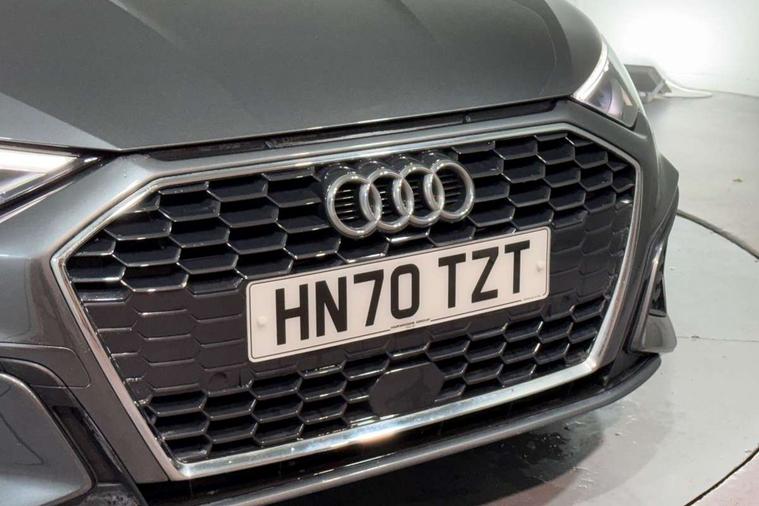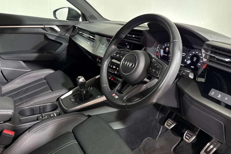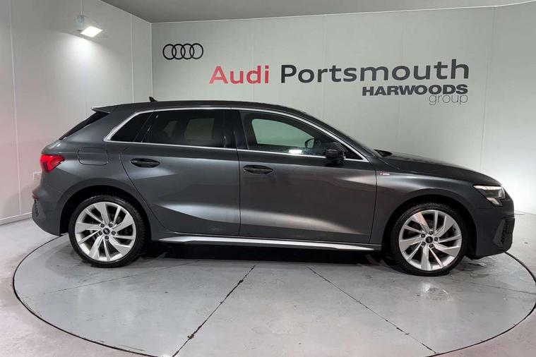Audi connect emergency call and service, Audi drive select (Auto, Comfort, Dynamic, Efficiency and Individual), Audi smartphone interface, Audi Virtual Cockpit - 10.25" digital and colour instrument cluster, Automatic start/stop system with recuperation, Bluetooth interface, Collision avoidance assistant, Cruise control, Electromechanical power speed sensitive steering, Lane departure warning system, MMI Navigation Plus with high resolution 10.1" colour touch screen display, Rear parking sensors, Service indicator, Trip computer, Voice control system with natural language interaction, 1xUSB-A and 1xUSB-C connection, 6 passive loudspeakers, DAB Digital radio, Acoustic glass windscreen, Aluminium window trim, Auto dimming frameless rear view mirror, Body colour exterior mirrors, Electrically adjustable/heated/folding/auto dimming door mirrors with integrated LED indications + kerb view function for passenger side, Front electric windows, Illuminated aluminium inserts front door sills with S logo, LED daytime running lights, Light and rain sensors, Privacy glass - dark tinted rear window, rear door and side windows, Rear electric windows, Rear side air outlets in grained matt black, Rear wiper, S line bumpers, S roof spoiler, 12V socket and storage compartment in front centre console, 40/20/40 split folding rear seat bench with cupholder, Black cloth headlining, Dual zone electronic climate control, Front and rear centre armrest in leather, Front and rear headrests, Front/rear floor mats, Height and reach adjustable steering wheel, Interior lighting - glove compartment light and right hand side, Luggage compartment floor covering, Manual boot compartment lid, Manually adjustable front seats, Seat side bolsters, Stainless steel pedals and front footrest, Twin leather upholstery with front sports seats S embossed logo, Aluminium interior elements pack - A3 Sportback, S line styling pack - A3 Sportback, 3x3 point rear seat belts, Driver and front passenger airbag with passenger airbag deactivation, Electronic Stabilisation Control (ESC) including ABS, ASR and EDL, First aid kit with warning triangle and 2 safety vests, Hill hold assist, Pre-sense front with pedestrian and cyclist detection, Seatbelt monitoring, Tyre pressure loss indicator, Anti theft alarm, Anti-theft wheel bolts, Electronically operated child lock, Immobiliser, Remote control central locking, Accent surfaces in the dashboard and centre console in platinum grey silk effect paint finish, Dark spectrum aluminium inlays,