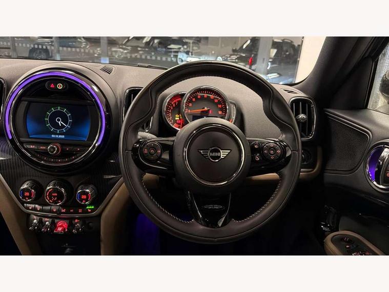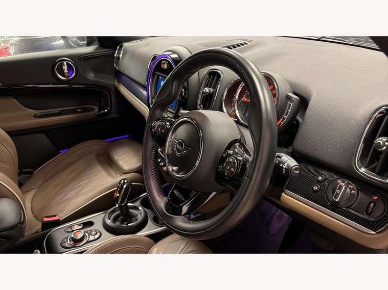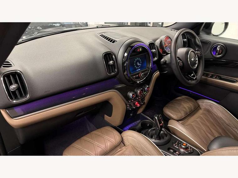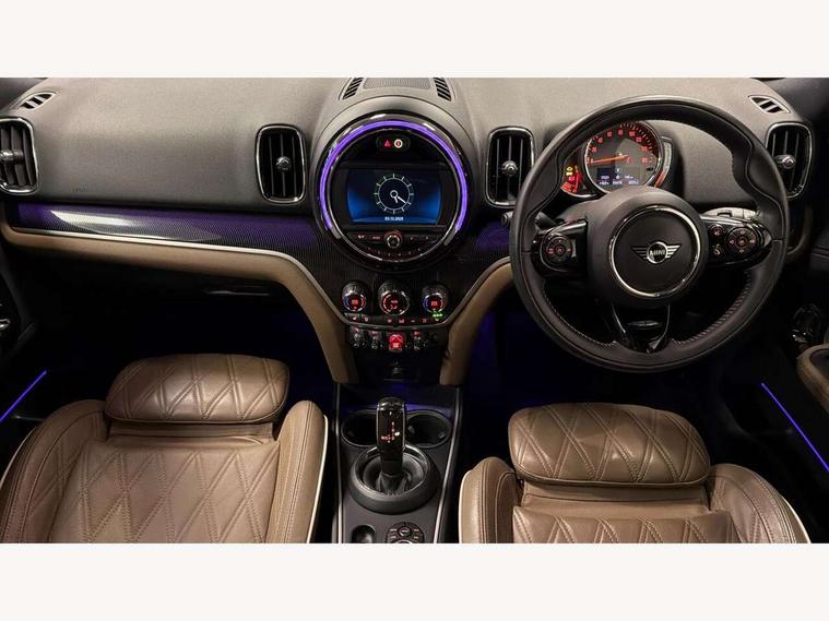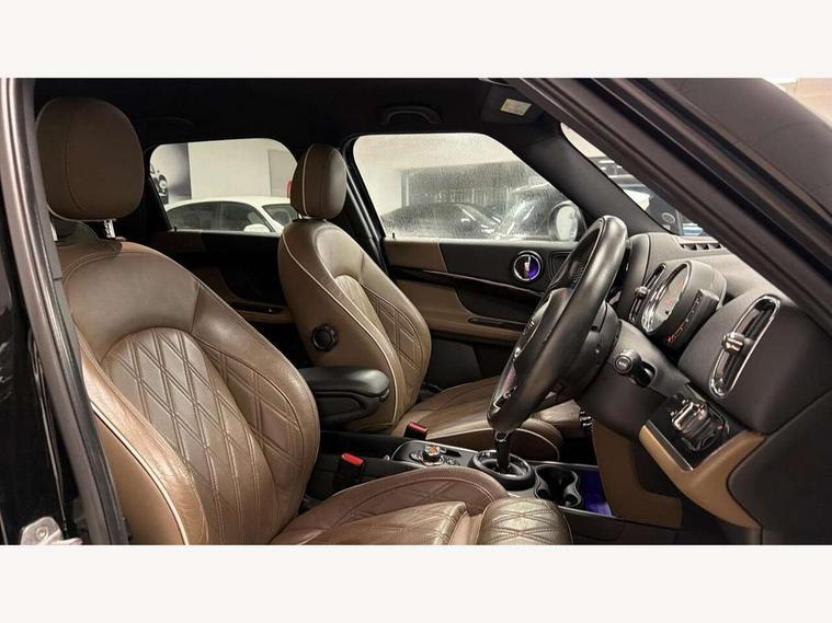 Active Guard incl speed limiting and lane departure functions with auto steering, and front collision warning with brake intervention, Automatic start/stop function with brake energy recuperation, Electro-mechanical speed dependant steering assistance, Instrument cluster, Mini E-call, MINI TeleServices, On board computer, Rear parking distance control, Double Vanos system, Fully variable valve control, High precision injection, Steptronic transmission with double clutch, FM tuner and DAB digital radio, Body colour fuel filler cap, Chrome line exterior, Day time driving lights, Door sill strips, Dynamic brake lights, Electric windows, Heated rear window, Heated windscreen washer jets, Left exhaust tailpipe with chrome finisher, Model logo, Model logo on Tailgate, Radiator grille, Rain sensor with auto headlights, Rear fog lights, Rear window wiper, Side scuttle panel with integrated indicator, Split rear doors, Sun/heat protection glass, White indicator lenses, 12V Accessory socket in centre console, 360L luggage compartment capacity, 4 lashing eyes in luggage compartment, 40:20:40 split folding rear seats, Chrome interior highlights, Cupholders, English handbook, Front headrests, Glove compartment, Height and length steering column adjustment, Interior lighting with 12 basic colours selectable via toggle switch in roof, Isofix rear child seat preparation, Leather gearshift lever and handbrake gaiters, LED reading lights, vanity mirror lights, front foot well light and spotlight on front seats, Manual air conditioning, Mechanical seat adjustment, driver seat height adjust, forward/back and front seats backrest, MINI Yours fine walk nappa leather steering wheel with contrast stitching in silver and MINI Yours badge, Multifunction steering wheel, Passenger seat height adjuster, Rear headrests, Storage compartments in doors, Sunvisors with vanity mirrors, Excitement pack - Countryman, Navigation pack - Countryman, 2 tone horn, 3 point seatbelts on all seats, 6 Airbags - front, side, head and seat belt tensioners, Anti-lock braking system (ABS), DSC - Dynamic Stability Control, Electronic handbrake, Front and rear disc brakes, Hill start assist, Tyre pressure monitoring system, Alarm system with tilt sensor, monitoring doors, bonnet interior and tailgate, Auto drive away locking, Deadlocking function, Electronic vehicle immobiliser, Locking wheel bolts, Start/stop toggle with keyless go, Chrome line interior, Tool kit,