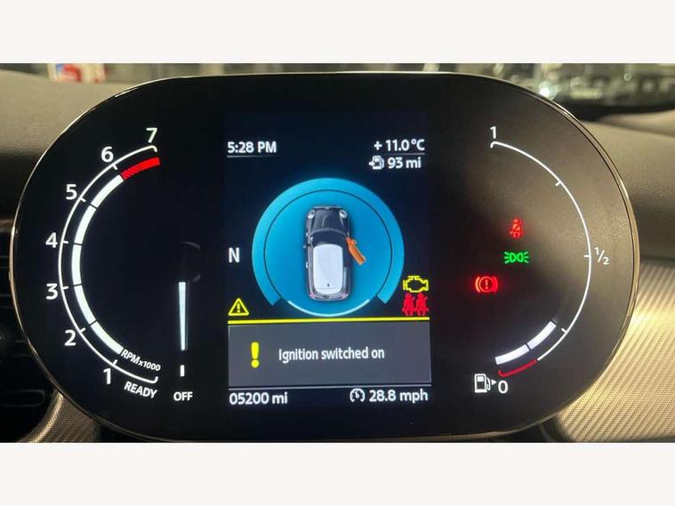 Automatic start/stop function with brake energy recuperation, Compatible mobile phone bluetooth with audio streaming, Cruise control with brake assist, Electro-mechanical speed dependant steering assistance, Flexible car sharing preparation, Instrument cluster, MINI Driving Modes - centre toggle switch to control driving setting (sport, mid and green), Mini E-call, MINI TeleServices, On board computer, Rear park distance control, Service interval indicator, 6 Speed manual transmission including gear change indicator display, Double Vanos system, Fully variable valve control, High precision injection, Performance Control, 4 speakers in front door trims and underneath front seats, 8.8" touchscreen with LED ring, FM tuner and DAB digital radio, Automatic headlight activation switch, Body colour fuel filler cap, Chrome line exterior - radiator grille bars, tailgate handle, lower front grille grating and rear central fog-light, Dynamic brake lights, Electric front windows, Heated rear window, Heated windscreen washer jets, LED headlight with closed ring and daytime driving lights, Metal door sill strips with MINI imprint, Model logo Cooper on right of tailgate, Rain sensor window wipers, Rear fog lights, Rear LED lights with union jack design, Rear window wiper, Side scuttle panel with integrated indicator, Sun/heat protection glass, White indicator lenses, 12V Accessory socket in centre console, 4 lashing eyes in luggage compartment, 60/40 split folding rear seat, Carbon black colour line - Knee roll and door armrest, Chrome interior highlights, Chrome line interior - air vents, gear lever base, door handles and speakers in doors, Cupholders, Front and rear head restraints, Front and rear isofix with front passenger airbag deactivation, Glove compartment, Height and length steering column adjustment, Interior lighting with 12 different colours across the dashboard, underneath door bezel with illuminated laser-engraved design on central display, Leatherette gearshift lever and handbrake gaiters, LED reading lights, vanity mirror lights, front foot well light and spotlight on front seats, Manual air conditioning, Mechanical seat adjustment - forward/back & backrest for front seats and driver seat height adjust, MINI yours badge on exterior pillar, Multifunction steering wheel, Passenger seat height adjuster, Satellite grey headlining including grab handles and clothes hooks, Storage compartments in doors, Sunvisors with vanity mirrors, Velour floor mats, Walknappa leather steering wheel with grey seam and MINI Yours badge on Piano Black lower steering wheel spoke, 3 point seatbelts on all four seats, 6 Airbags - front, side, head and seat belt tensioners, Anti-lock braking system (ABS), DSC - Dynamic Stability Control, Front and rear disc brakes, Single tone fanfare horn, Tyre pressure monitoring system, Alarm system with tilt sensor, monitoring doors, bonnet interior and tailgate, Electronic vehicle immobiliser, Start/stop toggle with keyless go, Tool kit,