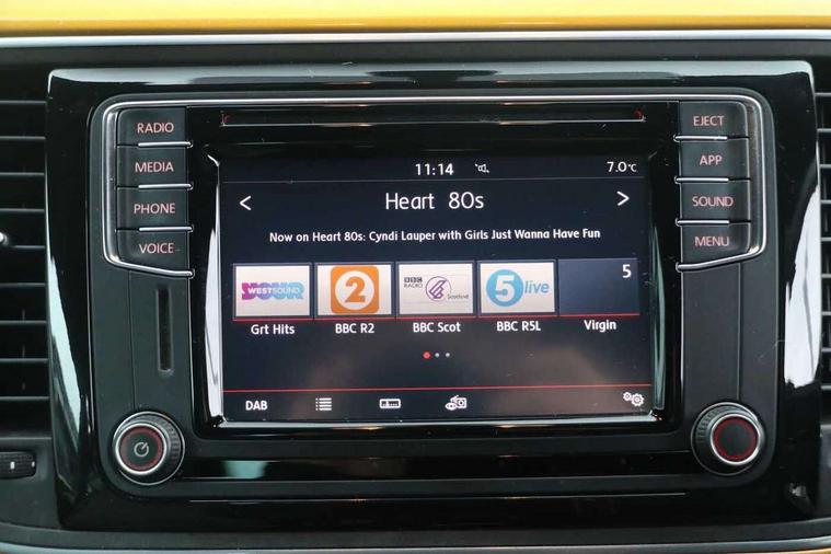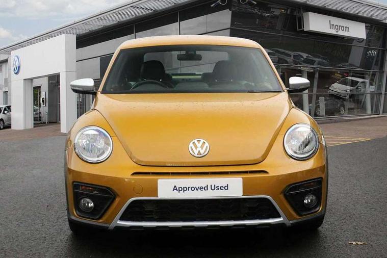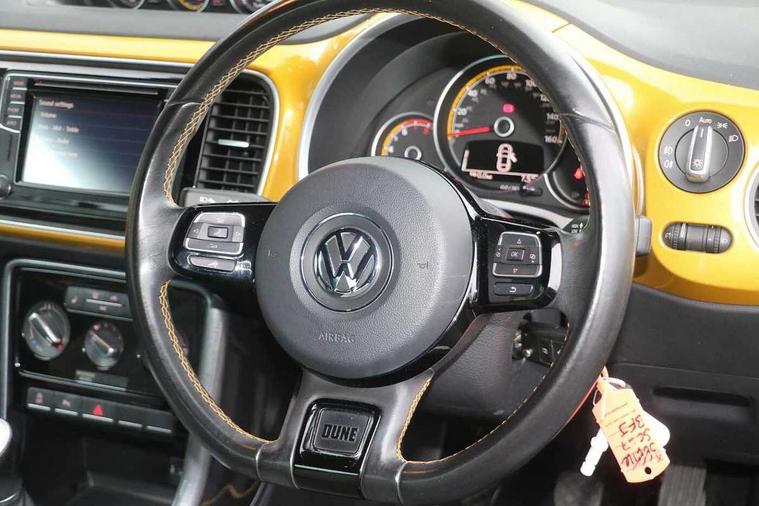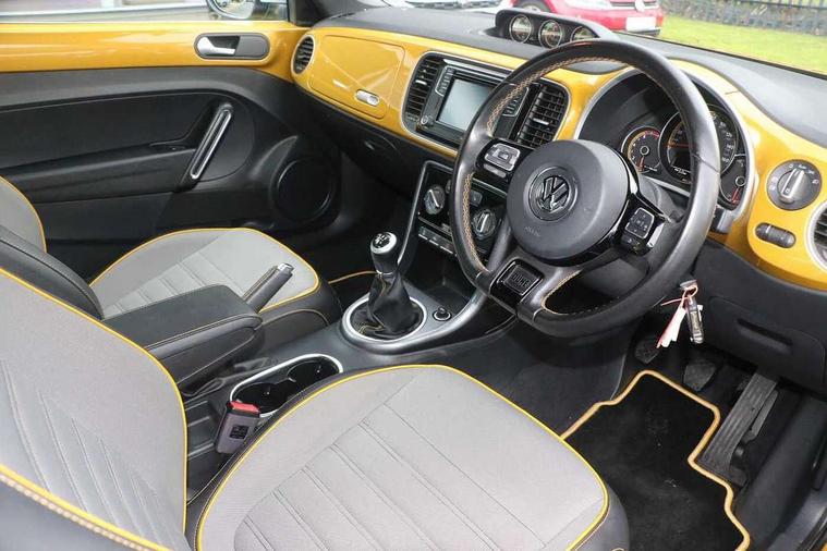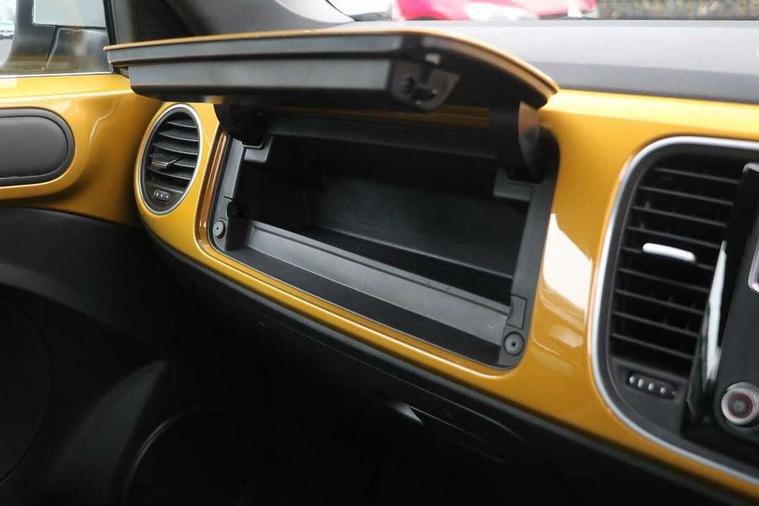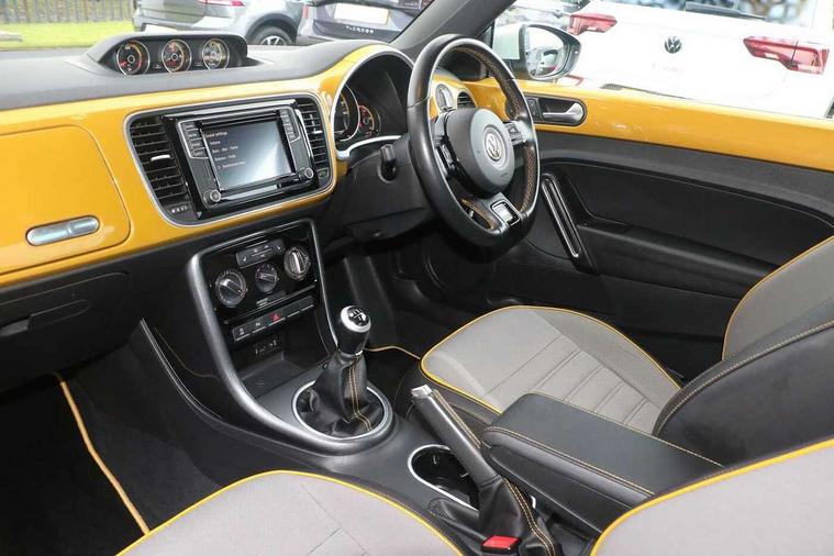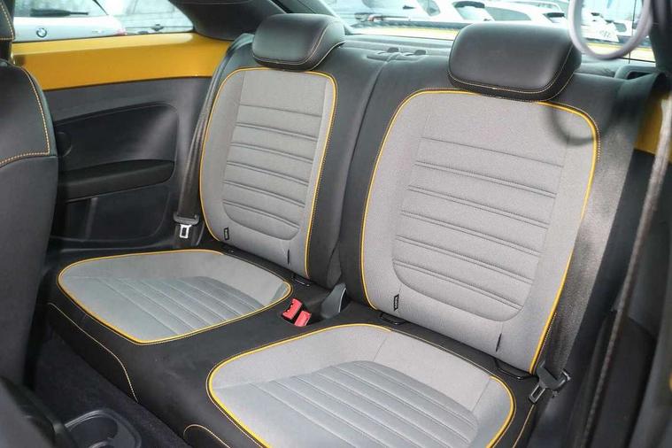 Bluetooth Telephone preparation, Brake pad wear indicator warning light, Door/tailgate open warning lights, Exterior temperature gauge, Front and rear parking sensors, Infotainment system, Multifunction computer, Service interval indicator, Speed sensitive power steering, Sports dials, Trip computer, Comfort suspension, Composition media system with radio/CD, colour touch screen, SD card, aux-in, USB MDI and bluetooth with SMS, DAB Digital radio, Black air intakes, Body colour door handles, Body colour door protectors with chrome insert, Body colour side mouldings, Body coloured bumpers, Chrome plated lower window frames, Chrome side window strips, Chrome strip on lower grille, Cornering front fog lights, Door mirror integrated indicators, Electric adjustable heated door mirrors, Electric front windows, Enlarged Sports rear spoiler, Heated rear windscreen, LED rear lights, Range adjustable headlights, Reflex silver door mirrors, Silver rear diffuser trim, Windscreen wipers/ intermittent wipe + 4 position delay, 2 outer rear head restraints, 2x12v socket in centre console, 3 Point rear seatbelts (2 seats only), 3 spoke steering wheel, 50/50 split folding rear seat, Dashboard storage, Driver/front passenger seat height adjustment, Dust/pollen filters, Easy entry slide seats (access to rear seats), Front and rear cupholders, Front centre armrest/storage, Front reading lights, Front seat and rear pockets, Front sports seats, Front/rear floor mats, Front/rear passenger grab handles, Glovebox, Height adjustable rear head restraints, Height/reach adjust steering wheel, Isofix child seat preparation, Luggage compartment lighting, Multifunction leather steering wheel with leather gear knob/handbrake grip, Removable luggage cover, Vanity mirrors, White adjustable panel illumination, Light and sight pack - Beetle, 3 point front seat belts, ABS, Automatic post collision braking system, Driver and passenger airbags, Driver/Passenger whiplash optimised head restraints, EDL + ASR, ESP, Front seat side impact airbags, Front seatbelt pretensioners, Hill hold control, Hydraulic Brake Assist (HBA), Manual passenger airbag deactivation function, Seatbelt warning lamp and buzzer, Tyre pressure warning, Alarm with interior protection, Anti-theft wheel bolts, Electronic engine immobiliser, Remote central locking with 2 remote folding keys, Chrome air vent surrounds, Steel space saver spare wheel,
