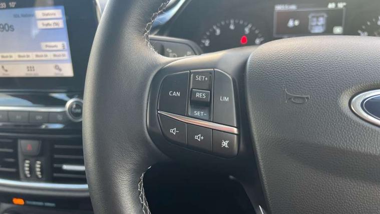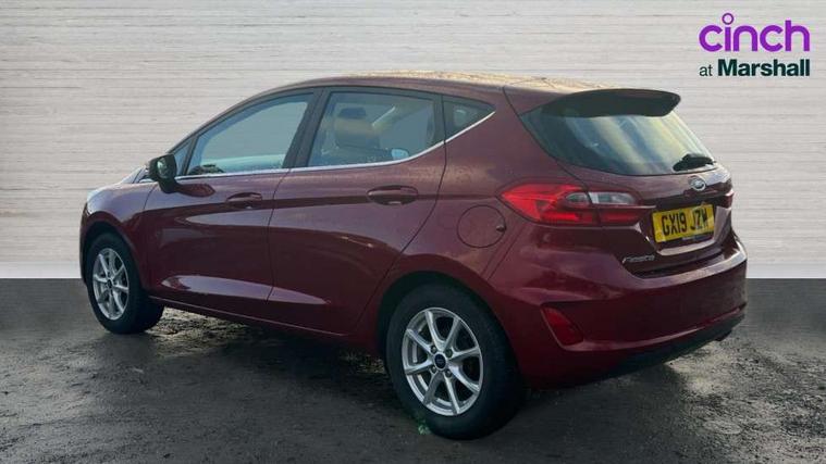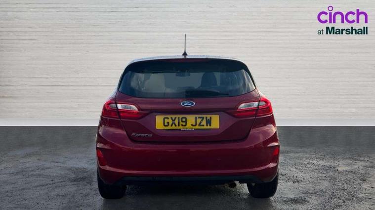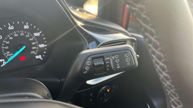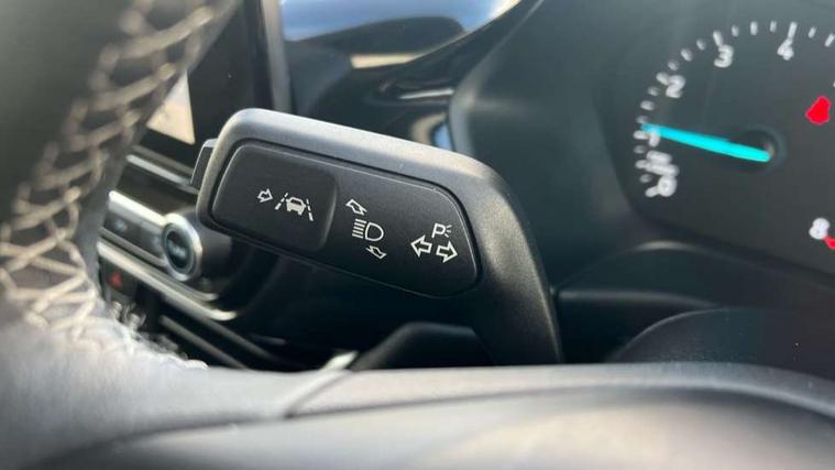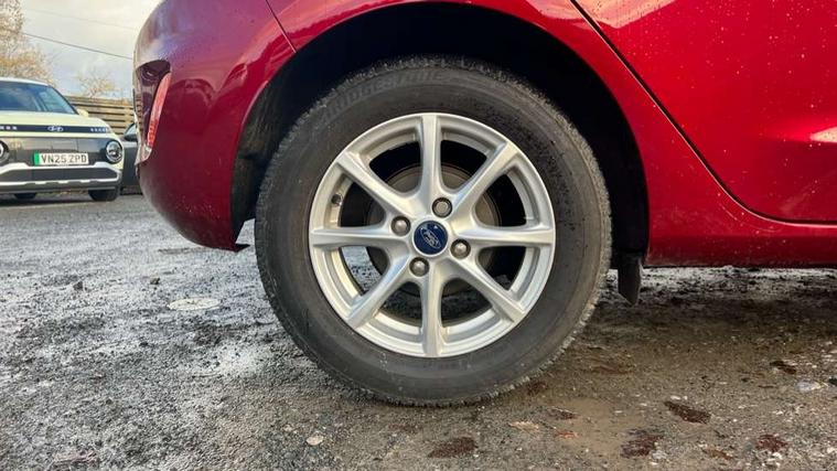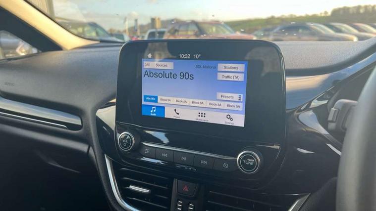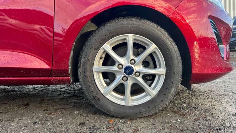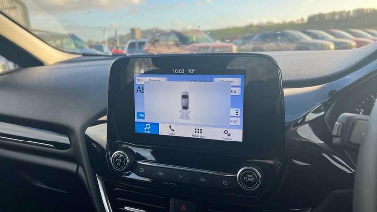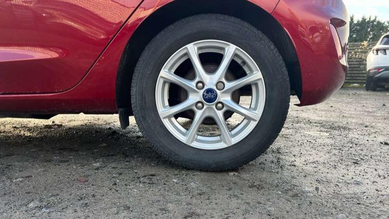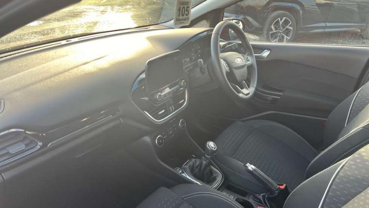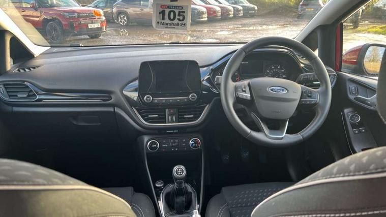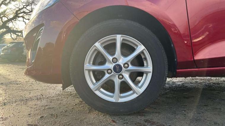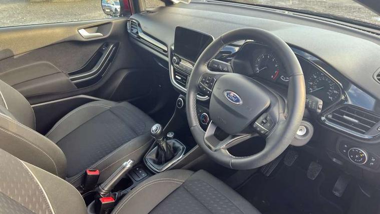 Bluetooth system, Electric power steering, Ford easy fuel, Trip computer, 2 USB ports, Auxiliary input socket, DAB Digital radio, Steering wheel mounted controls, Automatic headlights, Body colour bumpers, Body colour door handles, Body colour electric adjustable heated door mirrors with integral indicators, Body colour rear spoiler, Chrome beltline trim, Cornering front fog lights, Electric front windows/one touch facility, Halogen projector style headlights with static cornering lights + LED daytime running lights, Quickclear heated windscreen, Rear wiper, Tinted glass, Upper front grille chrome surround, 12V Accessory socket in centre console, 3 spoke leather trimmed steering wheel with audio control, 60/40 split folding rear seat, Adjustable head restraints, Boot carpet, Chrome inner door handles, Cloth upholstery, Footwell illumination, Front map reading lights, Front seat and rear pockets, Height adjustable driver's seat, Illuminated glovebox, Leather gear knob, Leather trimmed handbrake handle, Load area light, Luxury woven headliner, Manual air conditioning, Overhead console with sunglasses holder, Pollen filter, Rake/reach adjustable steering wheel, Rear centre head restraint, NCAP Pack - Fiesta, 3 point seatbelts on all rear seats, ABS+EBA, Curtain airbags, Driver and passenger airbags, Drivers knee airbag, Electronic stability control with hill start assist, Front passenger airbag deactivation, Front side airbags, Seatbelt warning, Tyre pressure monitoring system, MyKey system, Remote central locking & engine immobiliser, Thatcham Cat.1 alarm,