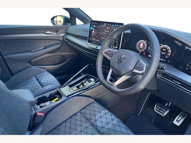 Activated carbon canister, Adaptive cruise control (ACC), Advanced driver attention and drowsiness monitor, Dynamic road sign display, Dynamic steering, E-Sim card for online connectivity, eCall emergency call system, Multi-color Digital cockpit pro, selection of different info profile possible, Multifunction front facing camera for distance control, Navigation system, Oncoming vehicle braking when turning including swerve support, Speed limiter, Speedo, rev counter, electronic odometer, trip, service interval display, exterior temperature and fuel gauge, Traffic jam assist, Voice enhancer and voice control, Warning signal and warning light for front and rear seatbelts not fastened, We connect plus preparation, We connect preparation, Wireless app connect, Hybrid propulsion system, Petrol Particulate Filter, Start-stop system with battery regeneration (recuperation - energy recovery during braking), XDS electronic differential lock for improved traction and handling, 2 USB C ports in front, 2 USB charging sockets on the centre console in the rear charging capacity upto 45W, Digital radio reception (DAB), Diversity antenna for FM reception, Gaming platform via car app, Infotainment system with 12.9" display, Mobile phone interface with inductive charging feature, 3rd brake light, Auto dimming rear view mirror, Automatic headlamp activation with Coming home and Leaving home feature, Body colored bumpers in R-Line style, Body colour door handles, Exterior ambient lighting, Exterior mirrors convex on the left and aspherical on the right, Front and rear electric windows, Heat insulating windshield made of laminated glass, LED separate daytime running light, Rain sensor, Rear exhaust tailpipe, Rear fog light on one side and reversing lights on both sides, Rear side wing doors, Rear windscreen washer and wiper with interval delay, Remote electrically foldable door mirrors, puddle lights and reverse activated passenger's door mirror, Volkswagen logo in front, illuminated lighting animation with wake up/goodbye scenario and illuminated door handles, Welcome light with surround lighting, 12V socket in front centre console, 12V socket in luggage compartment, 3 rear head restraints, 3 seat bench in 2nd row, Ambient lighting with 30 colour including LED light unit in front footwell with selectable light colour, Black roof lining, Brushed stainless steel pedals, Chrome plated radiator grille inserts, air vent surrounds and light switch surrounds, Door insert, side trim panel and arm support in leatherette, Front + rear black carpet mats, Front centre armrest, Front seat lumbar support adjuster, Integrated front head restraints, ISOFIX anchors for child seats on outer rear bench seats and on front passanger seat compatible for i-Size, Luggage compartment lighting, Manual height adjustable front passenger seat, Manually height adjustable driver seat, Plastic gear knob, Premium sports seats in front, Rear cupholder and loadthough, Sardegna cloth upholstery with front and outer rear seats Art Velour inner sides of bolsters, Single front passenger seat, Split folding backrest with centre armrest and unsplit rear seat bench, Sun visors with illuminated vanity mirrors, Titanium black instrument panel, Black exterior Styling package with Matrix LED headlights - Golf, Winter package - Golf DSG Estate/Hatchback, 3 point height adj front seatbelts + pretensioners, 3 rear three point seatbelts, ABS, Autonomous emergency braking front assist with pedestrian and cyclist monitoring, Child locks on rear doors, Driver and front passenger airbag with front passenger airbag deactivation, Electronic parking brake with auto hold, ESC (Electronic Stability Control), Extended pedestrian protection measures, Hill start assist, Rear disc brakes, Two tone horn, Tyre pressure loss indicator, Volkswagen roadside assistance, Anti theft wheel bolts, Preparation for alcohol interlock, Decorative inserts carbon grey for dashboard and front door trim panels, 18" Leeds alloy wheels, Tool kit for tyre mobility set, Tyre mobility kit Includes 12V compressor and tyre sealant,