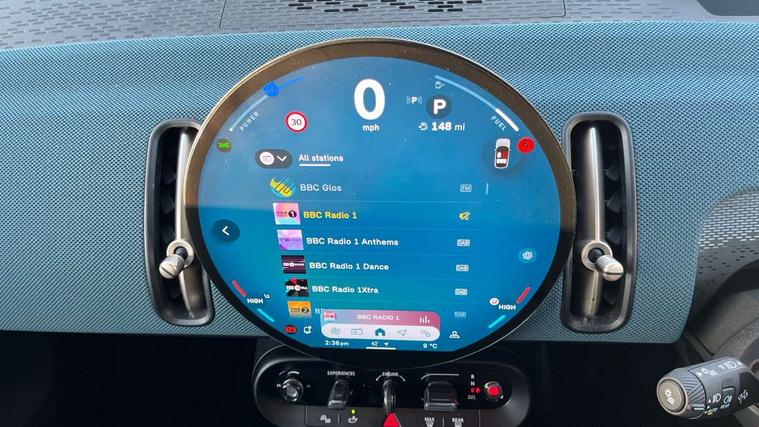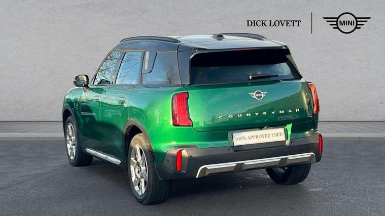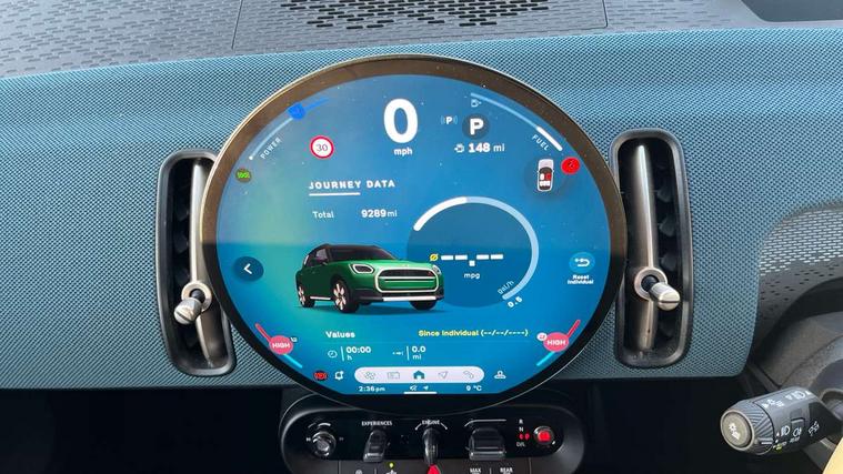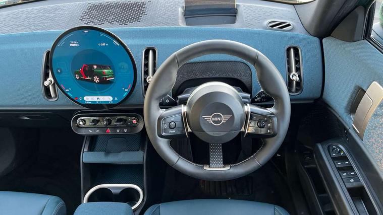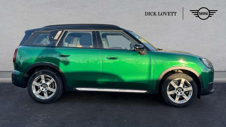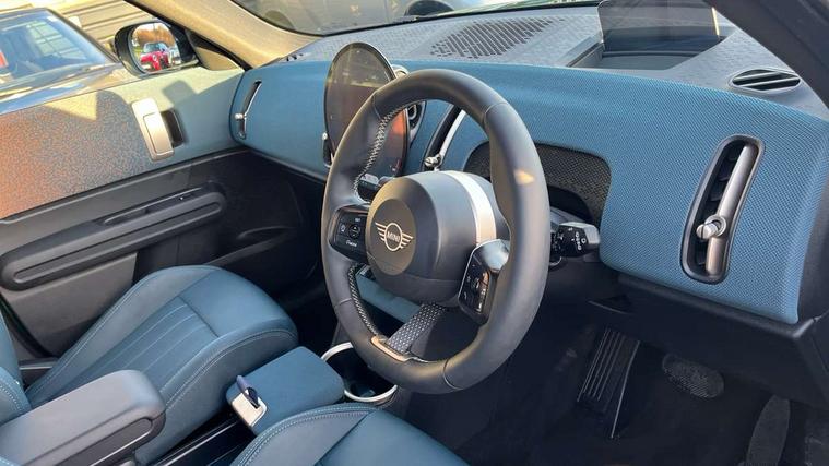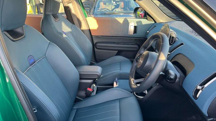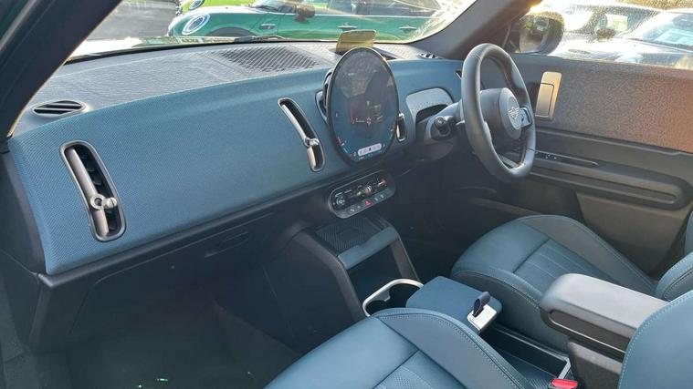 Bluetooth connection, Circular OLED Screen, Compatible mobile phone bluetooth with audio streaming, Cruise Control (DCC), Digital dashboard display, E-call, Electro-mechanical speed dependant steering assistance, MINI Experience Modes, Mini navigation system, MINI TeleServices, Parking assistant in camera and ultrasound based assistance system, rear view camera, parking aid and distance control, Auto transmission with Paddles, 6 speakers, DAB Digital radio, Personal eSim, Auto tailgate, Electric adjustable heated door mirrors, Front and rear electric windows, Heated rear window, LED daytime running lights, LED Headlights, LED rear lights, LED third brake light, Logos in Vibrant Silver, Rain sensor with auto headlights, Rear side wing doors, Rear window wiper, Roof rails, Vibrant silver grille surround, 3 seat bench in 2nd row, 60/40 split rear bench seat, Anthracite headliner, Auto air conditioning, Floor mats, Front armrest, Front headrests, Front sport seats, Heated steering wheel, Height and length steering column adjustment, Lidded storage box in Petrol knit, Rear headrests, Single front passenger seat, Sport Vescin Steering Wheel, Sunvisors with vanity mirrors, Vescin synthetic leather upholstery, Vibrant Silver sill inlay, 3x3 point rear seat belts, 6 Airbags - front, side, head and seat belt tensioners, ABS, DSC - Dynamic Stability Control, Electronic handbrake, Electronic Stability Programme (ESP), Front ISOFIX (iSize), Hill hold assist, Hill start assist, Manual rear child locks, Traction control, Tyre pressure monitoring system, Warning triangle, Alarm system with tilt sensor, monitoring doors, bonnet interior and tailgate, Auto drive away locking, Deadlocking function, Electronic vehicle immobiliser, Locking wheel bolts, Remote control locking, Start/stop toggle with keyless go, Petrol/Brown dashboard knit, MINI Mobility Kit,