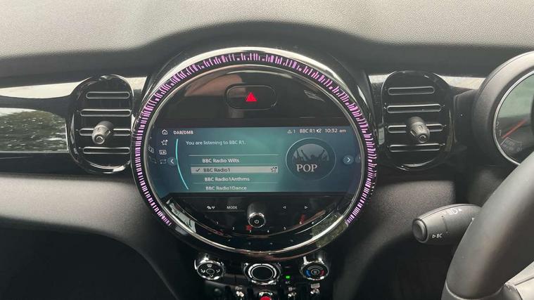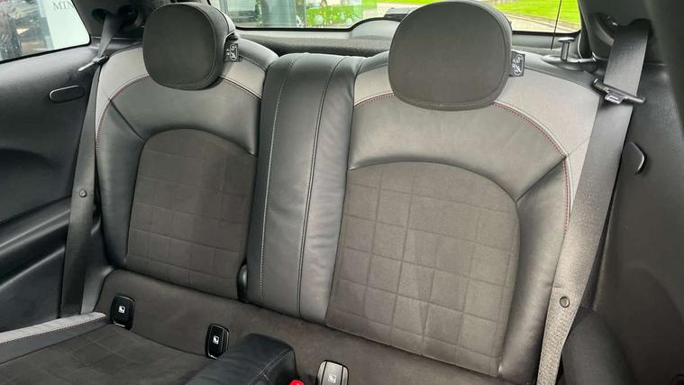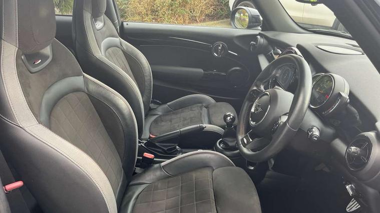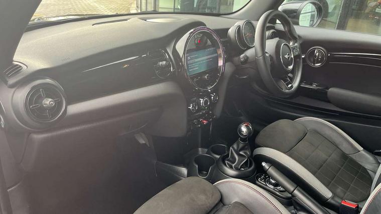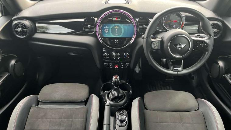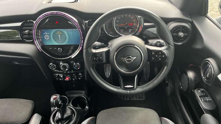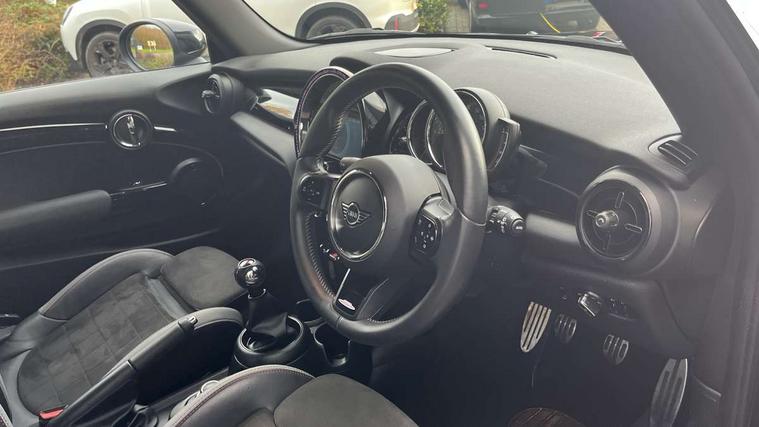 Apple CarPlay, Automatic start/stop function with brake energy recuperation, Compatible mobile phone bluetooth with audio streaming, Cruise control with brake assist, Electro-mechanical speed dependant steering assistance, Flexible car sharing preparation, Instrument cluster, MINI Driving Modes - centre toggle switch to control driving setting (sport, mid and green), Mini E-call, MINI TeleServices, On board computer, Rear park distance control, Service interval indicator, 6 Speed manual transmission including gear change indicator display, Double Vanos system, Fully variable valve control, High precision injection, Intelligent adaptive suspension, Performance Control, 8.8" touchscreen with LED ring, FM tuner and DAB digital radio, 3rd brake light, Automatic headlight activation switch, Bonnet scoop, Dynamic brake lights, Electric front windows, Heated rear window, Heated windscreen washer jets, JCW Aerodynamic kit - Front and rear bumpers with sporty JCW styling and part-painted side sills with MINI John Cooper Works door sill finishers, John Cooper Works rear spoiler, LED headlight with closed ring and daytime driving lights, Metal door sill strips with Cooper S, Model logo Cooper S on right of tailgate, Radiator grille chrome border with honeycomb structure including S Badge, Rain sensor window wipers, Rear fog lights, Rear LED lights with union jack design, Rear window wiper, Side scuttle panel with integrated indicator, Sun/heat protection glass, Two central exhaust tailpipes with chrome finisher, White indicator lenses, 12V Accessory socket in centre console, 2 seat bench in 2nd row, 4 lashing eyes in luggage compartment, 60/40 split folding rear seat, Anthracite headliner including grab handles and clothes hooks, Carbon black colour line - Knee roll and door armrest, Chrome interior highlights, Cupholders, Front and rear isofix with front passenger airbag deactivation, Front floor mats in velour, Glove compartment, Height and length steering column adjustment, Interior lighting with 12 different colours across the dashboard, underneath door bezel with illuminated laser-engraved design on central display, JCW Sport seats with integrated headrests, adjustable thigh support and John Cooper Works logo, Leatherette gearshift lever and handbrake gaiters, LED reading lights, vanity mirror lights, front foot well light and spotlight on front seats, Manual air conditioning, Mechanical seat adjustment - forward/back & backrest for front seats and driver seat height adjust, Multifunction steering wheel, Passenger seat height adjuster, Single front passenger seat, Storage compartments in doors, Storage pocket on back of front seats, Sunvisors with vanity mirrors, Walknappa leather steering wheel with grey seam and John Cooper Works badge on Piano Black lower steering wheel spoke, Piano black exterior pack - Mini Hatchback Cooper S, 3 point seatbelts on all four seats, 6 Airbags - front, side, head and seat belt tensioners, Anti-lock braking system (ABS), DSC - Dynamic Stability Control, Front and rear disc brakes, Two tone horn, Tyre pressure monitoring system, Alarm system with tilt sensor, monitoring doors, bonnet interior and tailgate, Electronic vehicle immobiliser, Start/stop toggle with keyless go, Piano black interior trim, Tool kit,