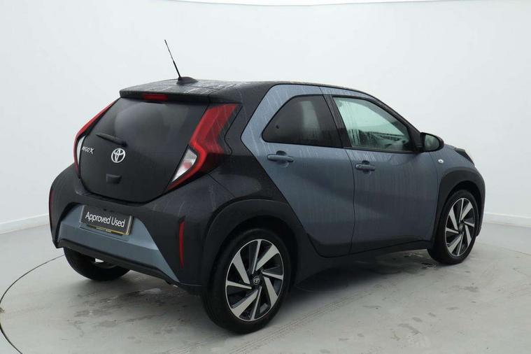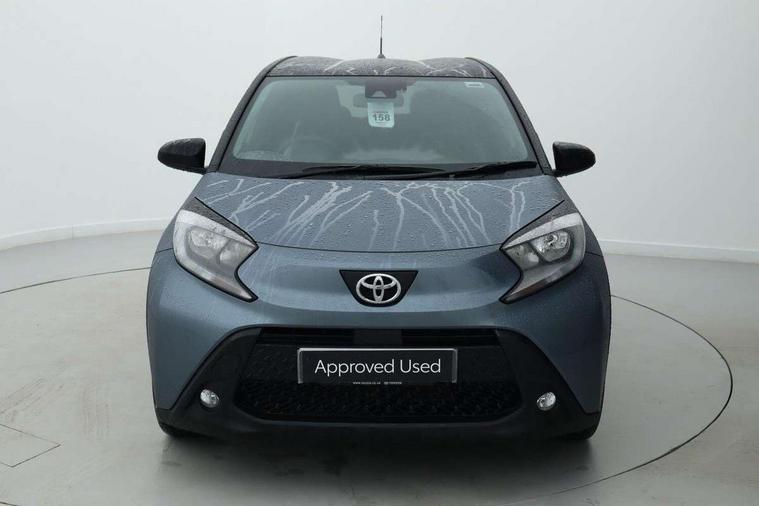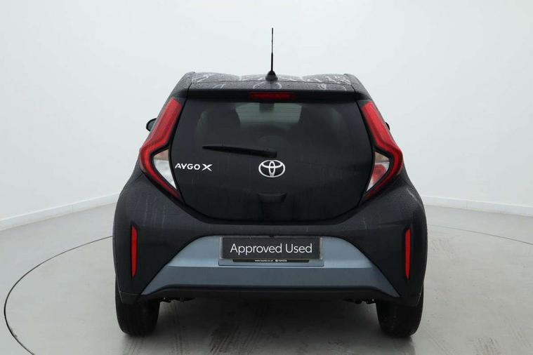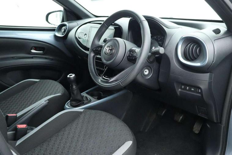 4.2" TFT colour screen, Adjustable speed limiter, Analogue speedometer, Bluetooth connectivity, Digital tachograph, Driver attention alert system, eCall emergency call system, Electric power steering, Intersection turn assist, Key reminder warning, Noise reduction kit, Pre collision system with emergency steering assist, Reversing camera with static guide lines, Smart phone integration with Apple car play/Android Auto, Speed limit display, Start and stop, Vehicle Stability Control (VSC), 4 speakers, 9" HD multimedia display touch screen with Toyota smart connect, DAB digital audio broadcast, USB connector, Auto headlights, Auto wipers, Automatic headlights cut-off, Bicycle towing hook, Black contrast roof, Black side protection mouldings, Black wheel arch mouldings, Body colour door handles, Body coloured front bumper, Boot door scuff plate, Eclipse black rear bumper, Electric heated door mirrors, Follow me home headlights, Front fog lights, Front power windows, Gloss black door mirrors, Gloss black upper front grille, Headlight cut-off reminder, LED daytime running lights, LED front light guide, LED High mounted stop lamp, Manual day/night rear view mirror, Manual headlight levelling, Pagoda roof, Power adjustable door mirrors, Power back door, Privacy glass, Projector halogen headlights, Rain sensor, Rear combination lights LED bulb type, Rear side wing doors, Rear windscreen defogger, Rear windscreen wiper, Short antenna, Variable intermittent windscreen wipers, 12v power outlet - front, 2 seat bench in 2nd row, 3 spoke leather steering wheel, 50/50 split folding rear seat, Adhesive roof headlining, Adjustable speed limiter switch on steering wheel, Audio and telephone switches on steering wheel, Auto air conditioning, Black insert on steering wheel, Black roof lining, Boot light, Centre room light, Chrome interior door handles, Chrome surround on air conditioning buttons, Clean air filter, Console box storage in body color, Fabric upholstery, Floor mats, Front and rear cup holders, Front head rest deco art, Front head restraints, Height adjustable driver seat, Intelligent adaptive cruise control switch on steering wheel, ISOFIX child restraint system on rear seats, Lane departure alert switch on steering wheel, Leather gearshift knob, Manual tilt steering wheel, Manually reclining and sliding driver seat, Manually reclining and sliding front passenger seat, Multimedia switches on steering wheel, Pollen filter, Rear door pockets, Rear head restraints, Satin silver insert on gear shift knob, Single compartment glovebox with lights, Single front passenger seat, Soft tonneau cover, Sun visors with mirror on driver and passenger side, Voice recognition switch on steering wheel, Toyota safety sense pack - Aygo X, Anti lock braking system + Electronic brake force distribution, Child safety door lock, Emergency brake light signal (EBS), Hill start assist control (HAC), Passenger airbag on/off switch, Seat belt reminder for front and rear seats, Supplement restraints system (SRS) - 6 airbags, Traction control, Tyre pressure warning system, Immobiliser, Remote power door locks, Black wheel centre caps, Tyre repair kit,
