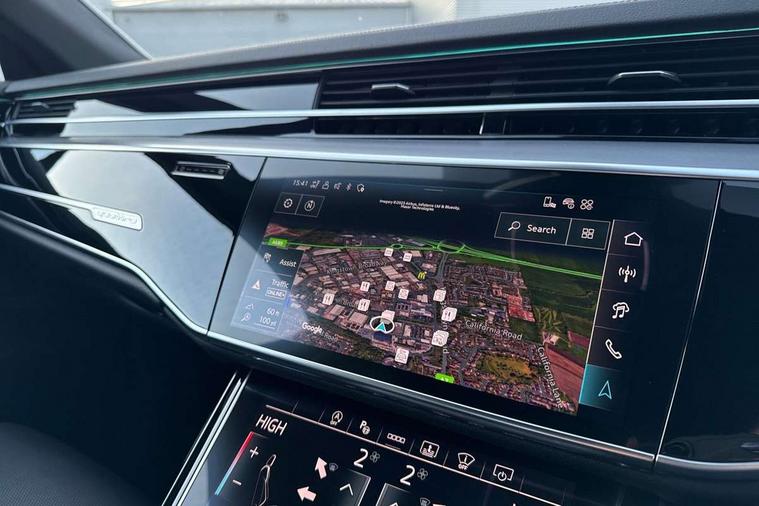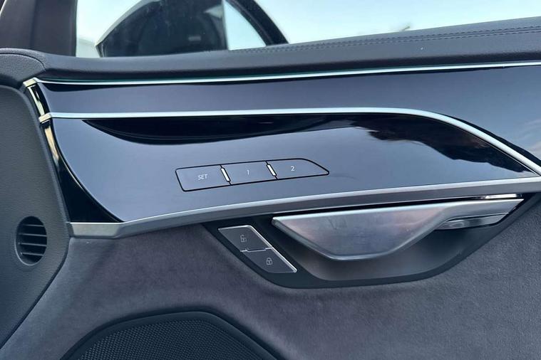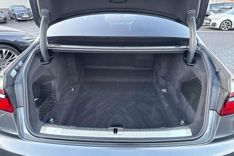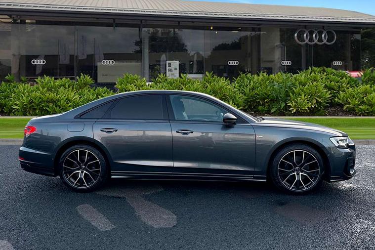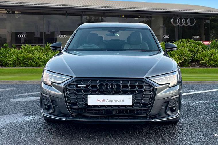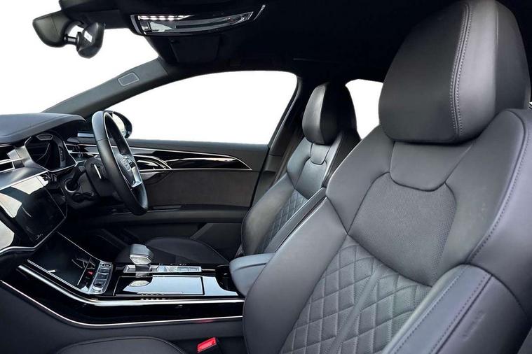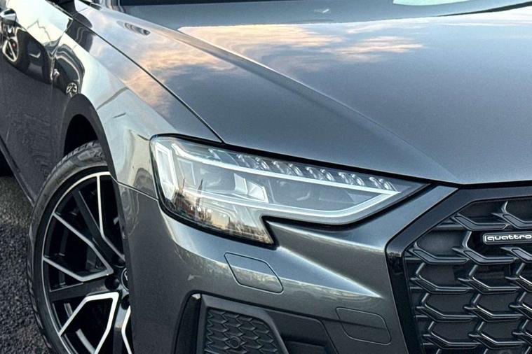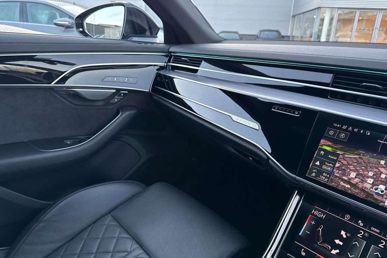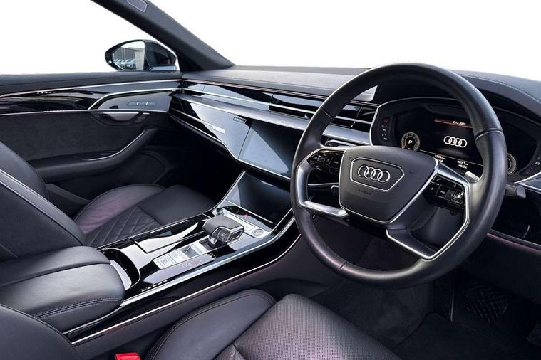'Lights On' Reminder warning buzzer, Adaptive cruise control with cruise assist, emergency assist, efficiency assist, swerve assist, turn assist and speed limiter, Audi connect safety and service (e-call), Audi drive select, Audi parking system plus with front and rear sensors, Audi smartphone interface with app store includes wireless Apple carplay, Android auto and Amazon alexa integration, Audi virtual cockpit, Bluetooth interface, Camera based traffic sign recognition, Convenience key, Electro - mechanical power assisted steering, Head up Display, MMI navigation plus with MMI touch + Twin touch screens with haptic feedback, Operating buttons in black, glass look with haptic feedback including extended aluminium look, Power door closure, Power operated tailgate, Rear view camera, Remote fuel filler release, Service interval indicator, 24 litre AdBlue tank, 48V Mild hybrid technology, 8 speed transmission with hill hold assist, 82 litre fuel tank, Adaptive air suspension, Diesel particulate filter, Quattro all wheel drive with self locking centre differential, Audi music interface, Audi sound system, DAB digital radio module, DVD System, MMI radio plus, USB connection, Acoustic double glazing, All-weather, manoeuvring, position, static cornering, turning and motorway lights with automatic dynamic headlight range control, Audi space frame, Auto dimming rear view mirror, Body colour bumpers, Body colour side protection with aluminium trim strips, Electric front windows, Electric rear windows with isolation switch, Electric sunblinds for rear window and rear door windows, Electrically adjustable heated folding + automatically dimming exterior mirrors with memory function and integrated LED indicators, Front wash/wipe with interval delay, HD matrix LED headlights with dynamic light presentation and dynamic indicators, Headlight cleaning system, Heat insulating darkened glass in side and rear windows, Heat insulating glass windscreen, Heated rear window, Heated windscreen washer jets, High beam assist, LED brake lights, LED daytime running lights, LED third brake light, OLED rear lights with changeable rear light signature, Privacy glass, Rear boot, Rear side wing doors, Side skirts, Welcome/leaving lighting, 12V socket, 2 zone automatic air conditioning, 3 seat rear bench with centre armrest in 2nd row, 4 way electric lumbar support for driver and front passenger, Audi phone box light, Black cloth headlining, Centre console with cupholders, Comfort centre armrest, Door pockets with bottle holder, Driver and front passenger side sunvisors with illuminated vanity mirrors, Dust/pollen filters, Electric front seats with memory function, Front floor mats, Glove compartment cooling, Heated front seats, Height/reach electric steering column with easy exit function, Illuminated door sill trims with aluminium inlays and S diamond emblem, Isofix child seat mounting points on outer rear seats, Leather gearknob, Passenger footwell storage net, Reading lights, Rear floor mats, Rear headrests, Roof mounted sunglasses holder, Single front passenger seat, Stainless steel pedals and footrest, Valcona leather upholstery with front sports seats in diamond quilted with S embossed logo, Black exterior styling pack - A8 Black Edition, Chrome exterior pack - A8, Extended LED Interior multi coloured light pack - A8, 3 point seatbelts on all rear seats, ABS/EBD, Active front headrest system, ASR traction control, Audi pre sense basic, Audi pre sense front, Black brake calipers, Driver/Front Passenger airbags, EDL traction control, Electromechanical parking brake, ESP, Extended pedestrian protection measures, Front and rear disc brakes, Front and rear side airbags with head airbag system, Front passenger airbag deactivation, Rear child proof door locks, Seatbelt reminder + electric contact in buckle + advanced safety equipment, Tyre pressure loss indicator, Warning triangle and first aid kit, Anti theft alarm tow away protection, Anti-theft wheel bolts and wheel loosening detection, Remote central locking, Carbon vector upper inlays, Dark matt brushed aluminium lower inlays,