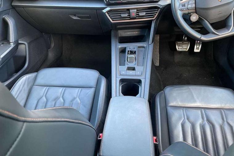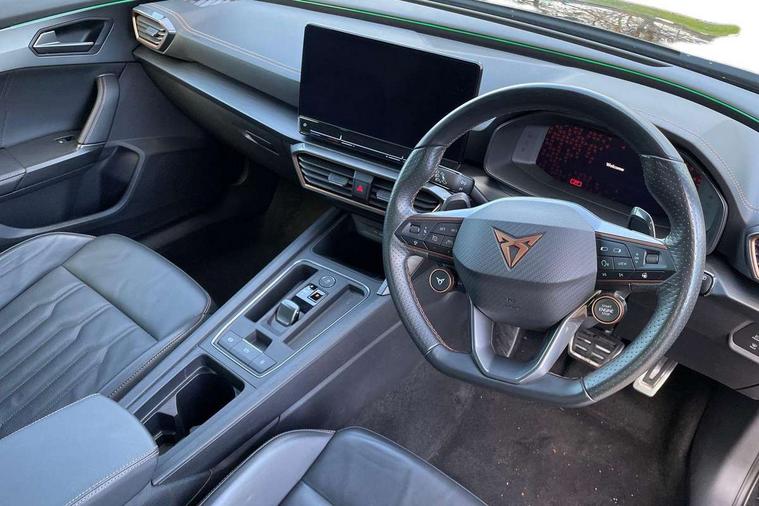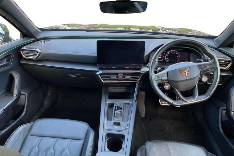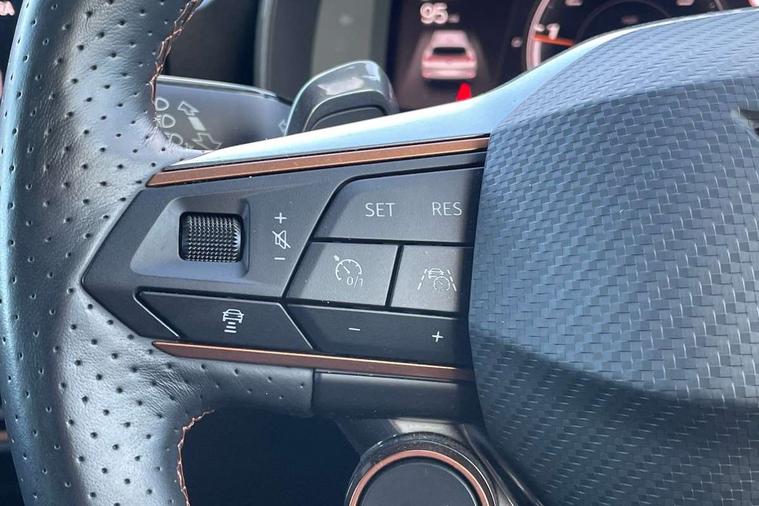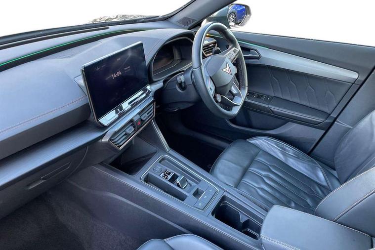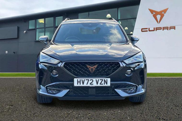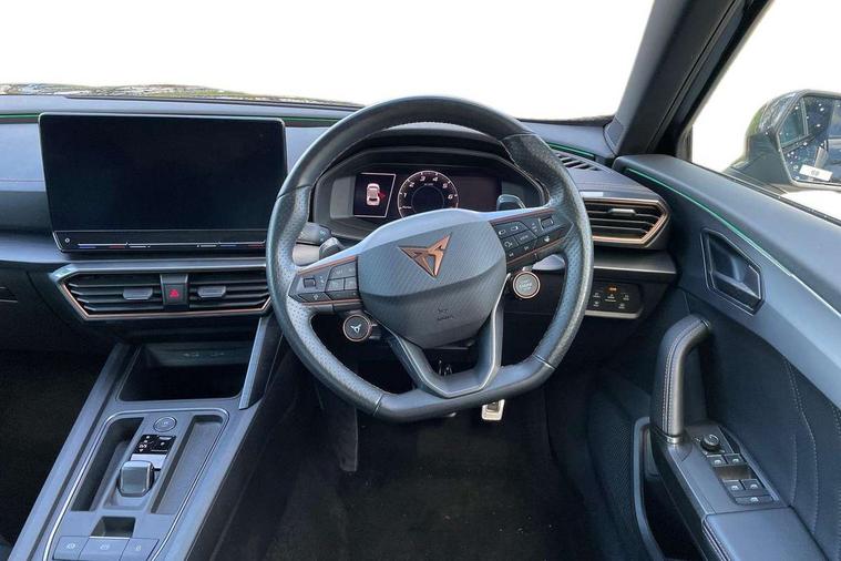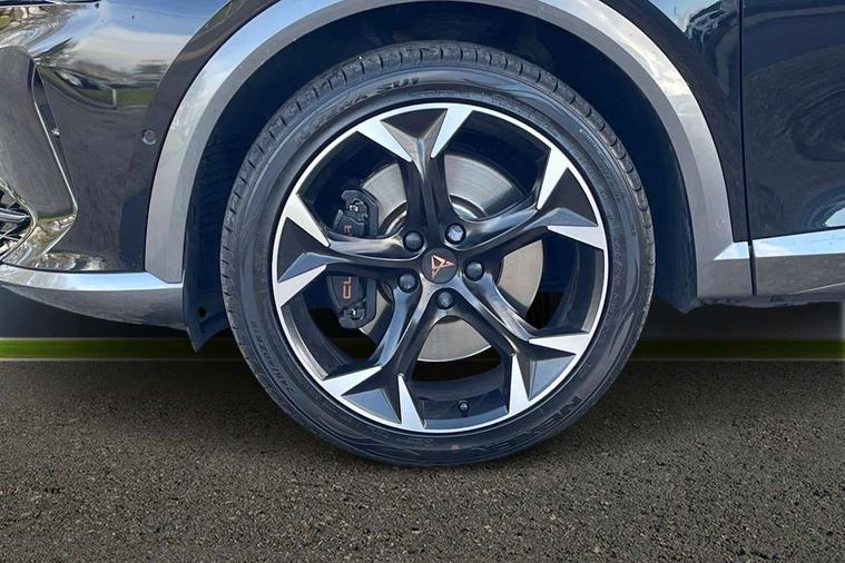 Digital cockpit and configurable dashboard, Driver alert system, Dynamic chassis control with driving profile selection (Comfort, Sport, CUPRA, Individual), E-call, Forward collision warning with automatic braking, Lane assist, Navigation system with 12'' Touchscreen Display, Park assist (inc front/rear parking sensors), Predictive adaptive cruise control with speed limiter, Rear view camera, RPM, trip computer, outside temp gauge, instrument light brightness, low fuel warning light, lights on reminder, gearshift indicator, Service interval indicator, Speed sensitive power steering, Start/stop system with regenerative braking, Virtual pedal and electric tailgate, Voice control system, Wireless apple carplay, Wireless phone charger, Electronic locking differential and dynamic traction support, Sports suspension with front shock absoption, 2 front and 2 rear USB type C sockets, Auxiliary input socket, DAB radio, Auto dimming rear view mirror, Body colour door handles, Body coloured bumpers, Dark grey wing mirror, Daytime running light with automatic headlight control and coming home feature, Dynamic headlight range control, Electric front/rear windows, Electrically adjustable heated and folding door mirrors with memory function, Front fog lamps with cornering function, Gloss black roof rails and window surrounds, LED Headlights, LED Taillights with dynamic indicator, Rain sensing wipers, Rear diffuser with twin exhaust pipe on each side, Rear side wing doors, Rear wash/wipe, Sports bumpers, Third brake light, Tinted rear windows, VZ logo rear badging, Welcome lights, 12v power supply in centre console, 12V socket, 12v socket in loadspace, 2 front and 2 rear reading lights, 230V socket, 3 seat bench in 2nd row, 60/40 split rear bench seat with armrest and mechanical seat release, Black headlining, Cupra sports pedals, Dust/pollen filter, Front and rear head restraints, Front centre armrest, Height/reach adjust steering wheel, Illuminated interior front door sills, Illuminated sunvisor with mirror, Isofix, Leather heated multi-function sports steering wheel with start stop, CUPRA mode button and gear shift paddles, Luggage tie-down hooks, Single front passenger seat, Three zone climate control with control panel in rear, Variable luggage/load compartment floor, Wraparound lighting, Genuine Nappa leather Pack - Cupra, Safety and driving pack (XL) - Formentor, 3 point seatbelts on all rear seats, ABS, Brake control system - ESC and brake booster, Child proof door locks, Driver and front passenger airbags with front passenger airbag de-activation, Electronic parking brake, Front and rear disc brakes, Front side curtain airbags, Hill hold control, Seat belt reminder for front and rear seats, Tyre pressure monitoring system, Anti theft alarm system, Keyless entry and start system (KESSY), Locking wheel bolts, Copper and aluminium interior detailing, 19" 'Exclusive' machined sport matte black and silver alloy wheels, Space saver spare wheel,