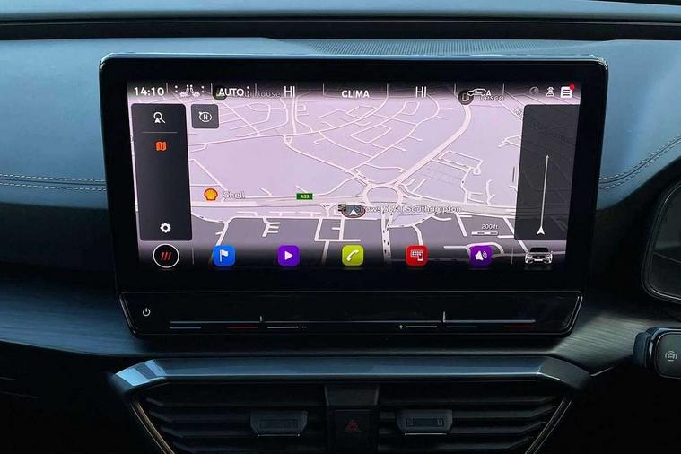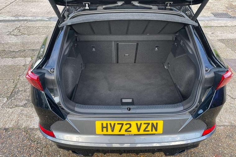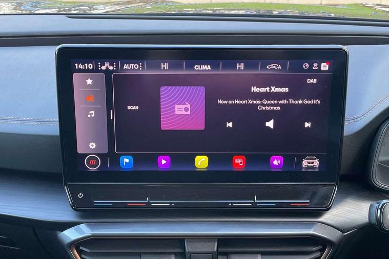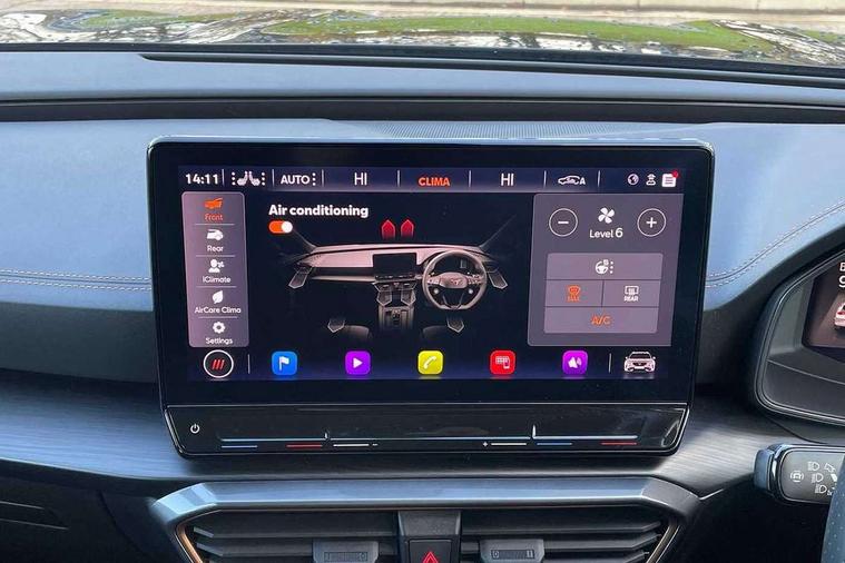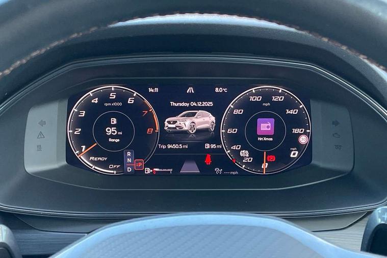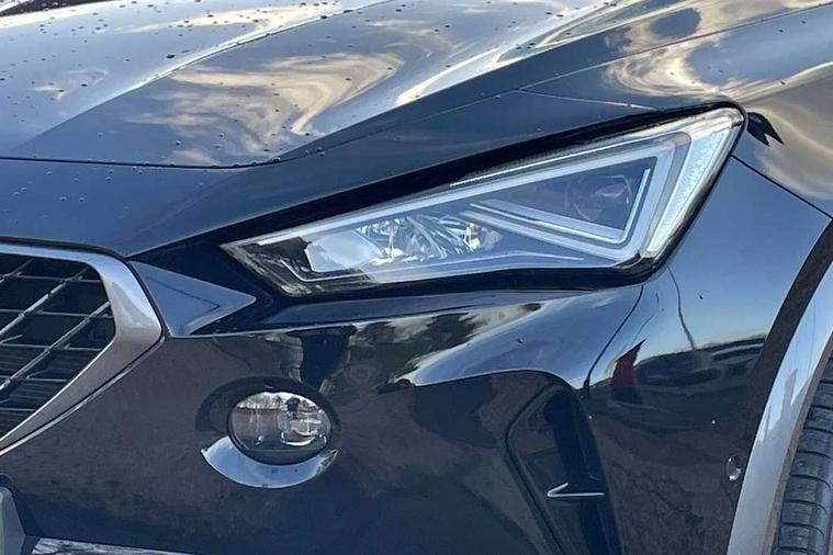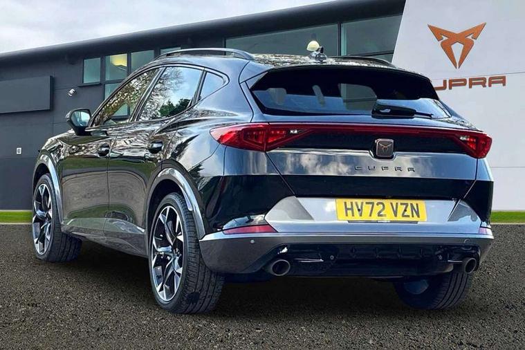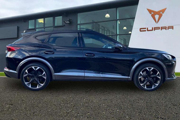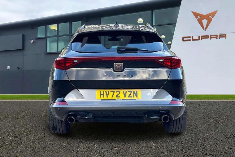 Digital cockpit and configurable dashboard, Driver alert system, Dynamic chassis control with driving profile selection (Comfort, Sport, CUPRA, Individual), E-call, Forward collision warning with automatic braking, Lane assist, Navigation system with 12'' Touchscreen Display, Park assist (inc front/rear parking sensors), Predictive adaptive cruise control with speed limiter, Rear view camera, RPM, trip computer, outside temp gauge, instrument light brightness, low fuel warning light, lights on reminder, gearshift indicator, Service interval indicator, Speed sensitive power steering, Start/stop system with regenerative braking, Virtual pedal and electric tailgate, Voice control system, Wireless apple carplay, Wireless phone charger, Electronic locking differential and dynamic traction support, Sports suspension with front shock absoption, 2 front and 2 rear USB type C sockets, Auxiliary input socket, DAB radio, Auto dimming rear view mirror, Body colour door handles, Body coloured bumpers, Dark grey wing mirror, Daytime running light with automatic headlight control and coming home feature, Dynamic headlight range control, Electric front/rear windows, Electrically adjustable heated and folding door mirrors with memory function, Front fog lamps with cornering function, Gloss black roof rails and window surrounds, LED Headlights, LED Taillights with dynamic indicator, Rain sensing wipers, Rear diffuser with twin exhaust pipe on each side, Rear side wing doors, Rear wash/wipe, Sports bumpers, Third brake light, Tinted rear windows, VZ logo rear badging, Welcome lights, 12v power supply in centre console, 12V socket, 12v socket in loadspace, 2 front and 2 rear reading lights, 230V socket, 3 seat bench in 2nd row, 60/40 split rear bench seat with armrest and mechanical seat release, Black headlining, Cupra sports pedals, Dust/pollen filter, Front and rear head restraints, Front centre armrest, Height/reach adjust steering wheel, Illuminated interior front door sills, Illuminated sunvisor with mirror, Isofix, Leather heated multi-function sports steering wheel with start stop, CUPRA mode button and gear shift paddles, Luggage tie-down hooks, Single front passenger seat, Three zone climate control with control panel in rear, Variable luggage/load compartment floor, Wraparound lighting, Genuine Nappa leather Pack - Cupra, Safety and driving pack (XL) - Formentor, 3 point seatbelts on all rear seats, ABS, Brake control system - ESC and brake booster, Child proof door locks, Driver and front passenger airbags with front passenger airbag de-activation, Electronic parking brake, Front and rear disc brakes, Front side curtain airbags, Hill hold control, Seat belt reminder for front and rear seats, Tyre pressure monitoring system, Anti theft alarm system, Keyless entry and start system (KESSY), Locking wheel bolts, Copper and aluminium interior detailing, 19" 'Exclusive' machined sport matte black and silver alloy wheels, Space saver spare wheel,