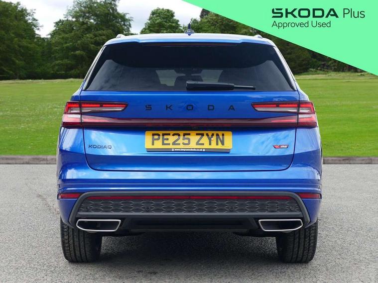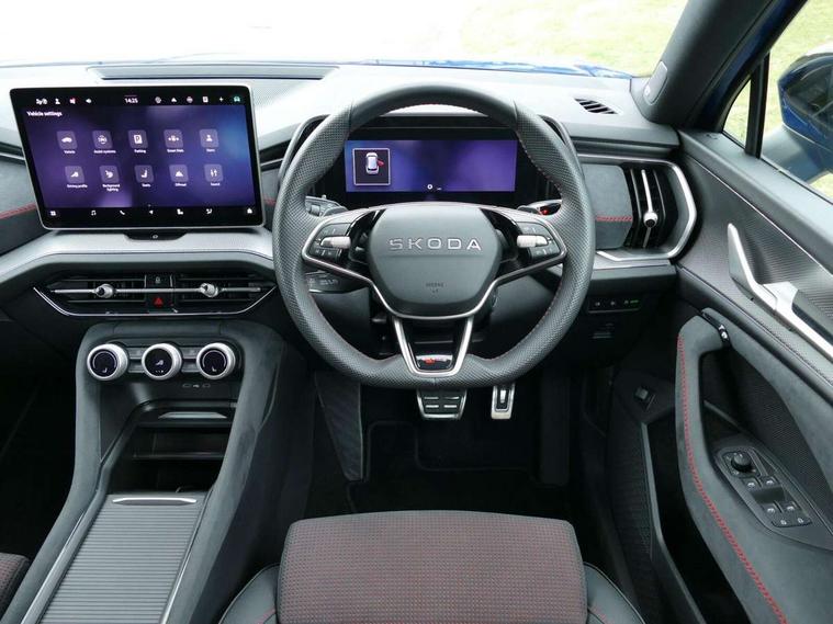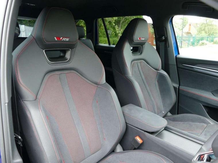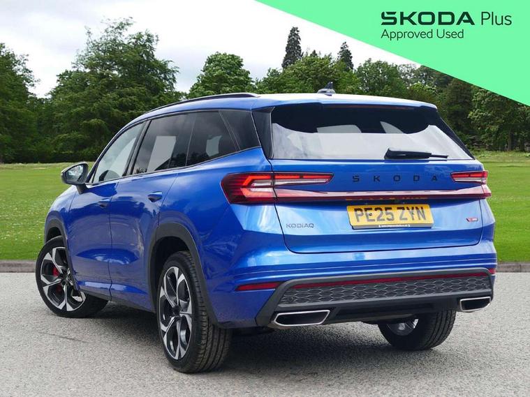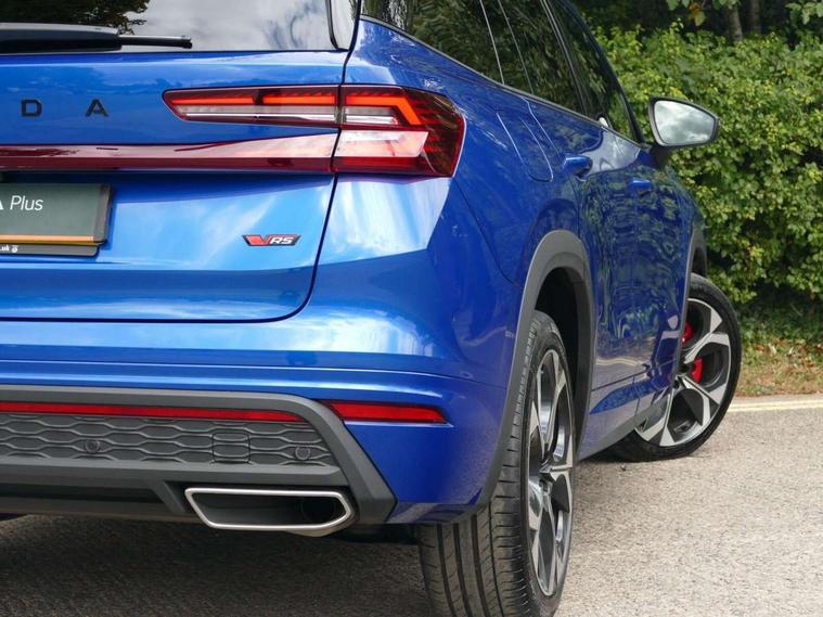 13" satellite navigation touchscreen display, Blind spot detection with door exit warning, Bluetooth system, ChatGPT functionality, Driver alert - Fatigue and drowsiness monitor, Dry display cleaner, Emergency call, Front and rear parking sensors, Front cross traffic assist, Lane assist, Off road modes, PAS, Rear traffic assist, Tailgate unlocking from outside, Traffic sign recognition, USB C Port x 2 in front centre console, Virtual Cockpit - 10.25" digital display, Voice control system, Wireless charging for two smartphones (15W) with cooling function, Wireless SmartLink for Apple CarPlay and Android Auto, Stop/start function, 2x USB-C in the rear, DAB Digital radio, Dynamic sound booster, Aero front windscreen wipers with intermittent function, Auto dimming rear view mirror, AWL (all weather lighting) and all weather light with cornering function, Black roof rails, Black vRS styling including front grille surround and upper part of window surround, Black wheel arch surrounds, Body colour door handles, Cornering light and poor weather light, Electric folding /adjustable/separted heated/folding door mirrors, auto dimming with boarding sports and memory function, Electric front and rear windows, Exterior black decorative trims, Gloss black door mirrors, Gloss black window frame and D pillar, Heat insulating glass in windshield, Heated rear window, Ice scraper in fuel tank cap, LED daytime running lights, LED third brake light in rear spoiler, Light assistant with automatic headlight control and coming home feature, Logo projection in door mirrors, Privacy glass, Rear roof spoiler, Rear side wing doors, Rear window wiper, Red decorative strip between rear LED lights, Safety reflectors on front and rear doors, Tailgate lettering in Black, Unique dark chrome design logo on alloy wheels, vRS badging on front grille and tailgate, vRS front and rear bumpers, vRS rear diffuser and visible tailpipe in stainless steel, Window control switches with black trim, Windscreen wipers with rain sensor, Without engine designation, 1.5l bottle holder points in all door, 1x centre rear reading light, 2 seat bench in 3rd row, 3 configurable smart dials with 32mm coloured display, 3 seat bench in 2nd row, 4 foldable roof handles with rear coat hooks, Aluminium pedals, Ambient interior lighting - Dashboard, front-door stowage compartments, front and rear door panels and footwell lighting, Automatic gear selector on steering column, Chrome interior door handles, Driver/front passenger reading lights, Fabric headlining, Fixed bench 40:60:40 split folding backrests, Front and rear floor mats, Front centre armrest with jumbo box storage compartment, cup holder and 12V socket, Front sport seats, Height adjustable front headrests, Interior black decorative trims, Isofix child seat fittings in outer middle row rear seats and front passenger with top tether, Manually adjustable steering column, Pollen filter, Rear centre armrest with cupholders, Rear seat boot backrest release, Single front passenger seat, Skoda lettering on steering wheel, Storage pocket including mobile phone pockets on the backs of the front seats, Sunvisors with illuminated vanity mirrors, Three rear height adjustable headrests, Ticket holder on A Pillar, Tri zone climate control, Umbrella in door panel x1 made from sustainable materials, Upper and lower glovebox with card holder and coin compartment, USB C port by rear view mirror for charging only (15W), Acoustic package - Kodiaq, Convenience plus pack - Kodiaq SE L/Sport Line/vRS, Light and view plus package - Kodiaq, Performance package - Kodiaq vRS, Simply clever cargo package - Kodiaq, Auto door release and activation of warning lights in the event of an accident, Driver and front passenger airbag with knee airbag and front passenger airbag deactivation, Electric child locks, Electronic parking brake, ESC (incl. ABS+EMD+MSR+ASR+EDL+HBA+DSR+RBS+ESBS+MCB+TSA+XDS), Front assist with braking reaction to vehicles, pedestrians and cyclists, Front disc brakes, Fuel cut off safety device, Height adjustable front 3 point seatbelts + pretensioners, Hill hold assist, Junction assist with automatic emergency braking, Rear disc brakes, Red brake calipers, Safety vest holder in door, Seat belt reminder for all seats, Three point rear seat belts, Two tone horn, Tyre pressure monitor, Alarm with interior monitoring and tilt sensor with safe function, Anti-theft wheel bolts, Immobiliser, Remote central locking with 2 keys, 20" Elias black polished alloy wheel,