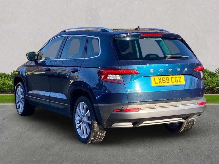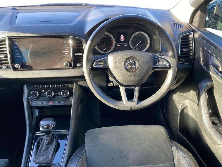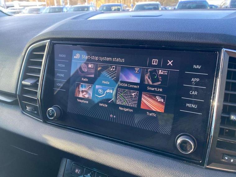 Drive mode selector, Driver alert system, Driver fatigue sensor, Driver profile selection, Multifunction colour trip computer, Outside temperature gauge, Rear view camera, Service interval indicator, Start/stop system with regenerative braking, DAB radio with Bluetooth, SD card slot, USB connection, Acoustic glass, Aero front windscreen wipers with intermittent function, Automatic headlight control system, Black electric window control buttons, Body colour door mirrors and handles, Body coloured bumpers, Electric front and rear windows with child proof lock, Full LED headlights + adaptive front light system + LED daytime running lights and front cornering fog lights, Headlight washers, Heated rear windscreen, LED rear lights with high functionality, Light assistant (coming/leaving home/tunnel light), Privacy glass, Safety reflectors on front doors, Third brake light, 1.5 litre bottle holders in driver and front passenger door panels, 12V socket in boot, 12v socket in front centre armrest with storage compartment and rear air vents, 2 Folding hooks and nets in boot, 2 Front readings lights for driver and passenger, 3 rear height adjustable headrests, 4 foldable roof handles with rear coat hooks, 4 lashing points on luggage floor, Backrest release, Cargo elements in boot, Chrome inner door handles, Dual zone climate control, Folding tables on the front seat backrests, Front seat and rear pockets, Height adjustable front three point seats belts with tensioners, Height adjustable passenger seat, Height/reach adjust steering wheel, Ice scraper, Illuminated and cooled glovebox, Illuminated luggage compartment, Isofix child seat preparation outer rear, Net programme in boot, Pen holder, Pollen filter, Rear boot cover, Rear reading lights, Rear seats fixed folding and divided 60:40, Removable LED torch in the boot, Retractable parcel shelf attachable to tailgate, Safety vest holder, Storage box in upper central dashboard closed, Storage compartment below the passenger seat, Sunvisors with illuminated vanity mirrors, Textile floor mats, Umbrella under passenger seat, VarioFlex seats with retractable parcel shelf, Chrome roof rails + chrome pack - Kodiaq, Airbags - Front side, head, knee and curtain, Automatic door unlocking in case of crash, Automatic fuel cut off in case of crash, Driver airbag, Electronic parking brake with auto hold function, Emergency rear braking signal, ESC including ABS, MSR, ASR, EDS, HBA, DSR, RBS, MKB and traction control, Front assist radar scanning of the space in front of the car with automatic braking, Hill hold control, Passenger airbag with switch-off function, Pedestrian monitor, Seatbelt reminder signalisation and pretensioner for all seats, Three point seatbelts rear, Two tone horn, Tyre pressure display, Tyre pressure monitor, Alarm with interior monitoring, back up horn and tilt sensor with safe function, Electronic engine immobiliser, Keyless entry and keyless start with safe system, Remote central locking with 2 remote folding keys, Chrome framed air vents, Storage on wheel cover,