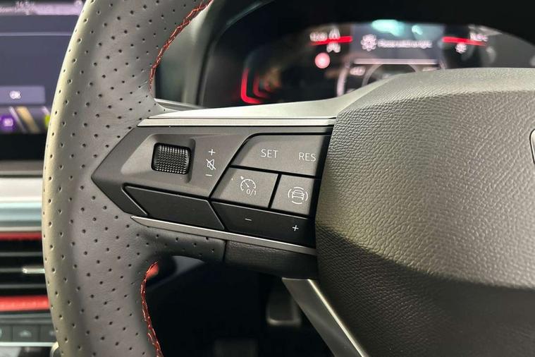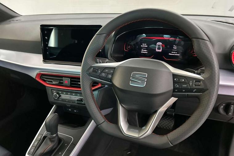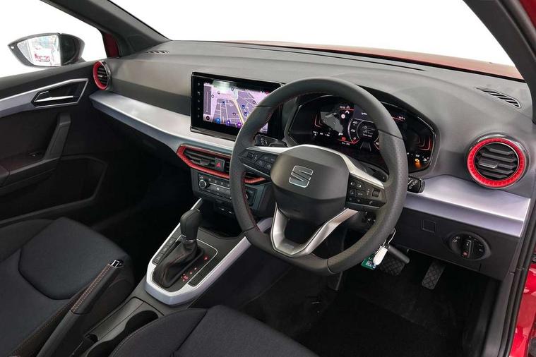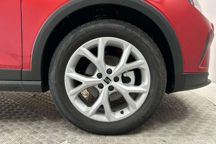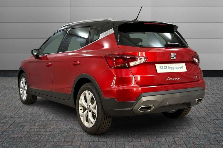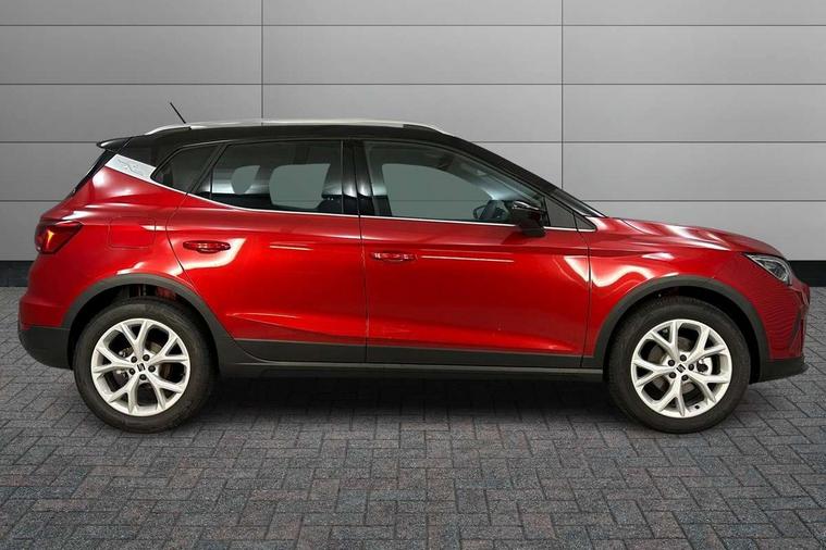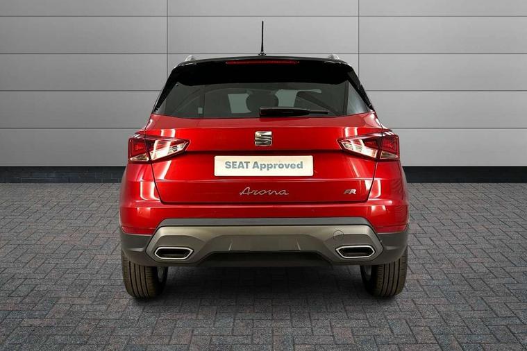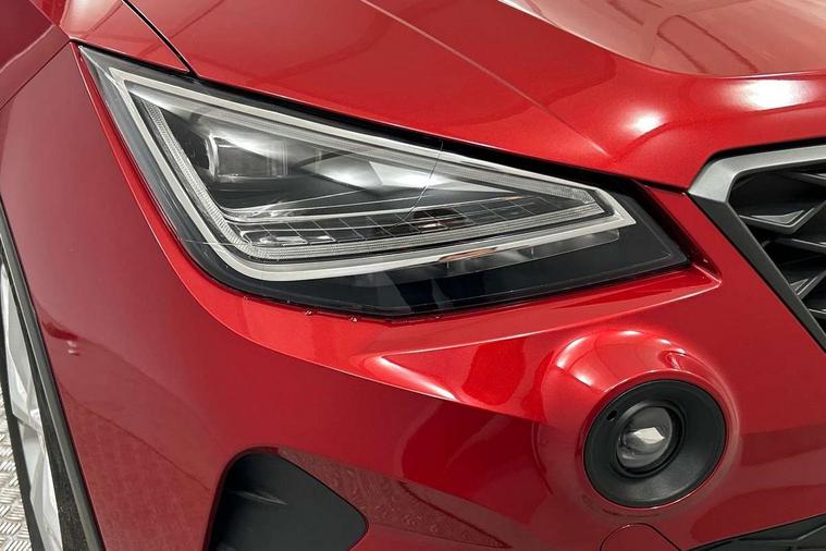 'Lights On' Reminder warning buzzer, 8" Digital cockpit, Digital clock, E-call, Electric speed sensitive power steering, Full link smartphone integration with mirror link, wireless apple carplay, Google android auto + USB Type C cable for apple and android devices, Lane keeping system, Low fuel warning light, Outside temperature display, RPM counter, SEAT Drive profile - Four different models normal-sport-eco-individual, steering response, throttle response and gear shifts mode, Trip computer, Wireless phone charger, 6 speakers, 9.2" colour touchscreen with navigation system, voice control and USB port (type c), Bluetooth interface for hands free and audio streaming, DAB digital radio and AM/FM radio, Steering wheel mounted audio controls, Anti theft roof antenna, Auto dimming interior rear view mirror, Automatic activation of hazard warning lights, Body coloured bumpers, Body coloured door handle inserts, Chrome roof rails and window surrounds, Dark tinted rear windows, Electric front/rear windows, Electrically adjustable, heated and folding door mirrors, Front fog lights with cornering function and rear fog light, FULL LED automatic headlights with dynamic headlight range control, coming and leaving home, LED daytime running lights, LED rear tail lights and licence plate lights, Protective side mouldings, Rain sensing wipers, Rear side wing doors, Rear spoiler, Rear window wash/wipe, Roof colour door mirrors, Third brake light, Twin exhaust pipe styling hidden exhaust pipe, Visible VIN plate, 2 cupholders, 3 seat bench in 2nd row, 60/40 split folding rear seat, Aircare filter, Black interior roof, Cloth upholstery, Double boot floor, Driver sunvisor with covered mirror + card holder, Dual zone climate control, Front courtesy light with front reading lights, Gear shift indicator, Height adjustable front seats, Height/reach adjustable steering column, Illuminated air vent surrounds, Illuminated boot, Instrument lighting with brightness control, Interior ambient lighting, Interior light in footwell, central console and door panel, ISOFIX points in outer rear seats with top tether anchorage points, Passenger sunvisor with vanity mirror, Perforated flat bottomed leather steering wheel/gear knob/handbrake with red stitching and FR logo, Potentiometer, Single front passenger seat, Steering wheel mounted gearshift paddles, Two front and three rear height adjustable headrests, Interior chrome pack - Arona, Safe and driving pack (S) - Arona, 3 point seatbelts on all rear seats, ABS, Active front headrests, Child locks on rear doors, Driver and front passenger airbags with front passenger airbag de activation, front side and curtain airbags, Emergency Brake Assist (EBA) and front assist, Front and rear seatbelt reminder, Hill hold control, Multi-Collision braking, Tiredness recognition system, Traction control, Tyre pressure monitoring system, Alarm with back up horn with tow away protection, Deadlock, Electronic engine immobiliser, Locking wheel bolts, Remote central locking, Titan black dashboard, 17" Dynamic alloy wheels,