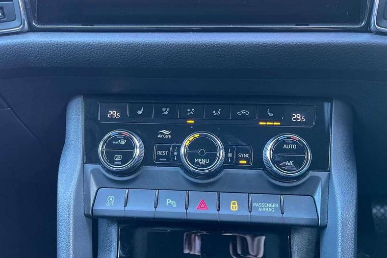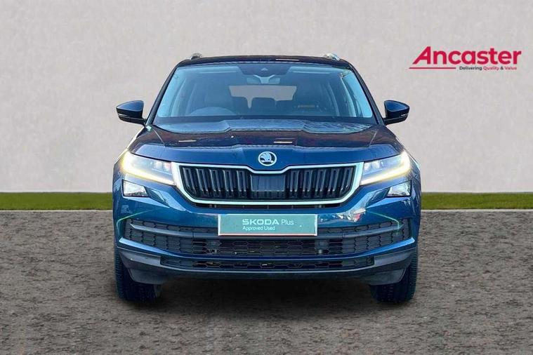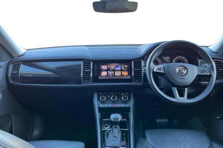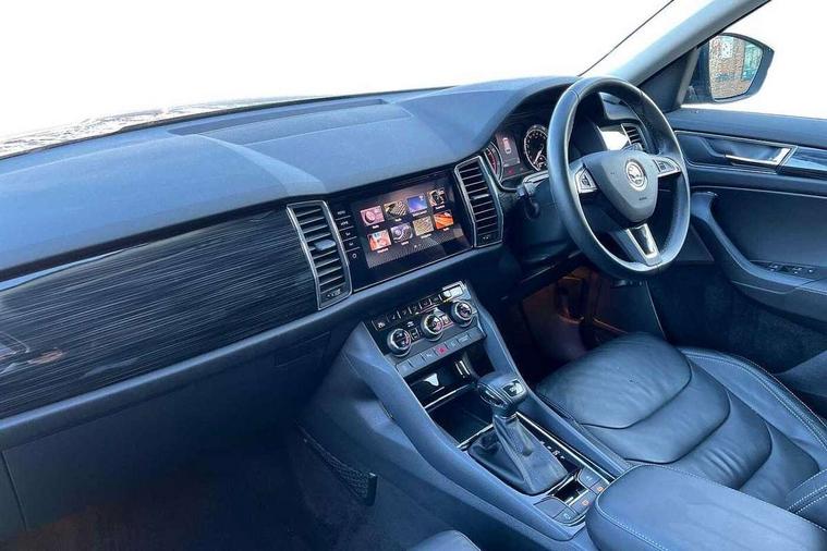 Bluetooth system, Colour multifunction trip computer, Columbus satellite navigation with 9.2" touch screen and integrated Wi-Fi + WLAN, Digital voice enhancement, ECO Stop/start function, Exterior temperature indicator, Map care, Phone box, SmartLink plus, Speed limiter, Tailgate unlocking from outside, Bolero Radio, DAB Digital radio, DVD System, USB and SD card connectivity, Aero front windscreen wipers with intermittent function, Aero rear window wiper, Auto dimming rear view mirror, Automatic activation of hazard warning lights, Black electric window control buttons, Black wheel arch surrounds, Body colour bumpers, Body colour door mirrors and handles, Electric front and rear windows, Electrically adjustable/heated/foldable and auto dimming door mirrors with memory function, Front and Rear door steps, Full LED Headlights with adaptive front light system and LED daytime running lights, Headlight washers, Heated rear window, High beam assist, Invisible tailpipe, LED front fog lights with static cornering light function, LED rear fog light, LED third brake light in rear spoiler, Light assistant (coming home/tunnel light), Radiator grille frame in matt black with chrome strip, Rain and light sensors, Rear spoiler, Safety reflectors on front and rear doors, Silver roof rails, Sunset privacy glass, Tinted windows, 12V socket in boot, 2 rails with 2 hooks including 4 hooks for net programme, 4 foldable roof handles with rear coat hooks, 4 lashing points on luggage floor, 60:40 foldable rear seat with sliding adjustment and backrest angle adjustment, Bottle holders in door panel in the 1.5 litre front and 1 litre rear, Cargo storage compartments, Centre console with open storage box, cup holder and 12V socket, Chrome headlight control button, Chrome interior door handles, Coat hooks on B pillar, Covered storage compartment on driver side, Electrically adjustable front seats with lumbar support and memory function, Front and rear door armrest with black adductor trim, Front centre armrest with storage compartment, Front courtesy lights, Gear shift lever with chrome frame and black gloss insert, Height adjustable front headrests, Height adjustable rear headrests, Illuminated and cooled glovebox, Illuminated luggage compartment, Isofix system on outer rear seats, Leather upholstery, Manually adjustable steering column, Net programme in boot (1x horizontal Net, 2x vertical Nets), Overhead glasses storage compartment, Pollen filter, Rear centre armrest with cupholders, Roll up luggage compartment cover with intermediate position, Small Bags on the inner sides of the front backrests, Small pockets on the inner side of the front backrests, Storage compartment in lower middle Instrument panel, illuminated with closing, Three rear height adjustable headrests, Ticket holder on A Pillar, Umbrella in door panel, Chrome pack - Kodiaq, Auto door release and activation of warning lights in the event of an accident, Driver and passenger airbags, Electronic parking brake with hill hold control, Emergency rear braking signal, ESC (incl. ABS+MSR+ASR+EDS+HBA+DSR+RBS+MKB), Front and rear three point safety belt on all seats, Front assist includes AEB city/urban, Front side airbags, Fuel cut off safety device, Head and knee airbags, Passenger airbag deactivate switch, Rear disc brakes, Safety vest holder in door, Seat belt reminder for all seats, Two tone horn, Tyre pressure monitor, Warning lights in front doors, Alarm with interior monitoring and tilt sensor with safe function, Immobiliser, Keyless entry and start system (KESSY), Remote central locking,