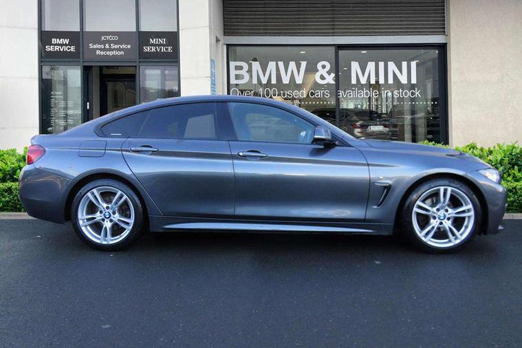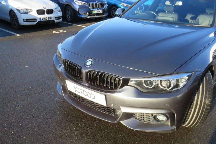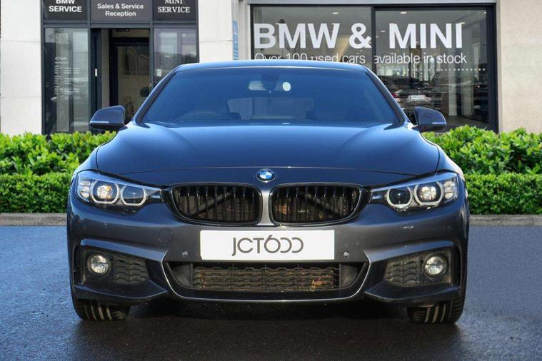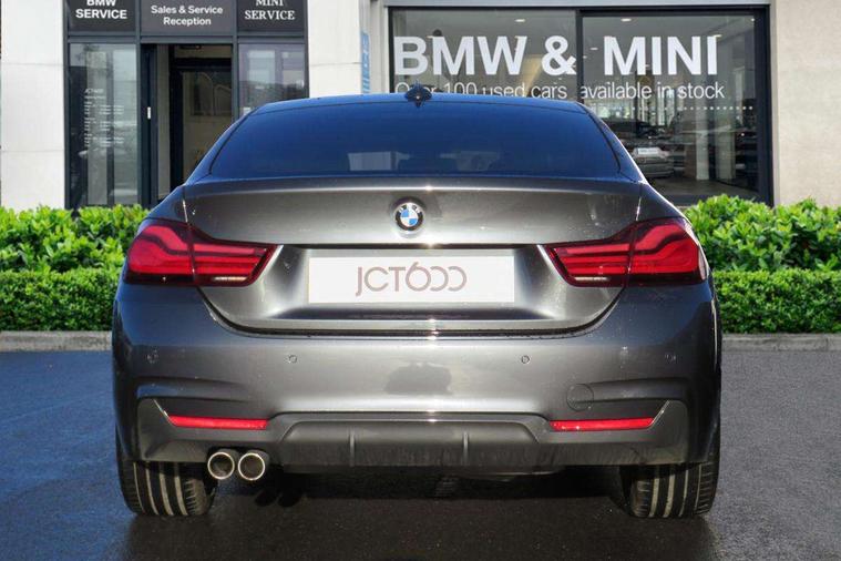 Auto start-stop, Automatic tailgate operation, BMW Online services, BMW remote services, BMW Teleservices, Brake pad wear indicator in front and rear, Check Control warning system for monitoring of lights and door/luggage compartment open warning, Condition based service, Control display - 6.5" colour display screen, Front/rear park distance control (PDC), iDrive Controller with 8 favourite buttons, Instrument cluster with speedometer with mph readout, tachometer, fuel gauge and oil temperature gauge, Lights on warning by audio warning signal when ignition is switched off, M Sport instrument cluster, Oil sensor for level and grade, warning by check control system, On board computer - average speed, fuel consumption, outside temp display with acoustic warning, clock/date, service interval, odometer/trip meter, Optimum shift indicator, Personal Profile - automatic lock when driving away selectable, Professional multimedia navigation system, Run flat indicator, Aluminium front suspension, Drive performance control with ECO PRO comfort + sport mode, Electronic differential lock, Five link rear suspension, Sport automatic transmission with steering-wheel mounted gearshift paddles and launch control, VALVETRONIC engine management, DAB tuner, Auto dimming rear view mirror, Body colour door handles, Body colour front bumper, Body colour mirror caps, Body colour rear bumper, Body colour roof mouldings, Chrome kidney grille with extra wide black, high gloss black vertical slats, Direction indicator, side repeaters, integrated in exterior mirrors, Door sill finishers with M designation, Dual exhaust tailpipes in left with chrome finisher, Dynamic brake lights, Electric front windows with fingertip open/close + anti-trap facility, Follow me home headlights, Front air inlet with high gloss black finish, Front and rear bumper system, Green tinted heat protection glazing, Heated windscreen washer jets, Heated, electrically adjustable exterior mirror aspheric on driver side, convex on passenger side, High gloss black air breather, High gloss black rear bumper insert, High gloss shadow line exterior trim, High level third brake light, LED daytime running lights, LED direction indicator lenses, LED eyebrow light, LED front fog lights, LED tail lights with 3D L-shaped LED light design, Lightweight engineering, M aerodynamic bodystyling, Model designation, Rain sensor including auto headlights activation, Shark fin antenna, Two speed adjustable intervals windscreen wipers, Visible VIN plate, Welcome lighting, Windscreen with grey shadeband, 12V sockets in front centre console and passenger footwell, 2 Rear seat headrests, 3 spoke leather M sport multifunction sports steering wheel, 4 grab handles, Air conditioning and radio control panel in high gloss black, Ambient lighting - switchable BMW classic orange/ cold white LED, Anthracite headlining, Automatic air conditioning with two zone control, Bottle holders integrated into front door trim storage compartments, Chrome centre console panel highlight, Driver and front passenger seat heating, Front and rear side armrests integrated into door trim, Front folding sliding armrest with storage compartment, Front head restraints, Front sports seats, Full black panel display, Glove compartment, Interior lighting, front centre over interior mirror and rear centre automatic interior light activation when door is opened, Leather gearknob and handbrake lever, Load lashing eyes in luggage compartment, Reach + rake manual adjustable steering column, Rear child seat isofix attachment with passenger airbag deactivation, Rear coded belt buckles, Storage compartment in rear centre console, Sunvisors with vanity mirrors and ticket pocket, Toolkit located in luggage compartment, Two front cup holders with a sliding lid, Velour floor mats, Extended lighting package - 4 Series Gran coupe, Non Smokers pack, 3 point seatbelts on all seats, Airbag - Front driver and passenger, front and rear head, front side, curtain head protection, manual deactivation of front passenger airbag possible, Anti lock braking system (ABS) with brake assist, Automatic Stability Control (ASC), Battery safety cut-off, BMW emergency call, Brake drying, Brake energy regeneration, Brake pretensioning, Cornering brake control (CBC), Crash sensor activating central locking release, hazard warning lights, Dynamic brake control, Dynamic stability control + (DSC+), Dynamic Traction Control - DTC, Front and rear ventilated brake disc, Front seatbelt force limiters, Hill start assistant, Pyrotechnically pre-tensioned front seatbelts, Seat belt security check for driver, Side impact protection, Twin horns, Tyre pressure monitoring with three level warning strategy, Variable torque distribution, Warning triangle and first aid kit, Alarm system (Thatcham 1) with electronic engine immobiliser, Central locking switch for all doors, fuel filler cap and luggage compartment, Remote control integrated key with blue inset, Start/stop button with Comfort Go keyless engine start and auto Start/stop deactivation button, Reduced rolling resistance tyres, Run flat tyres,