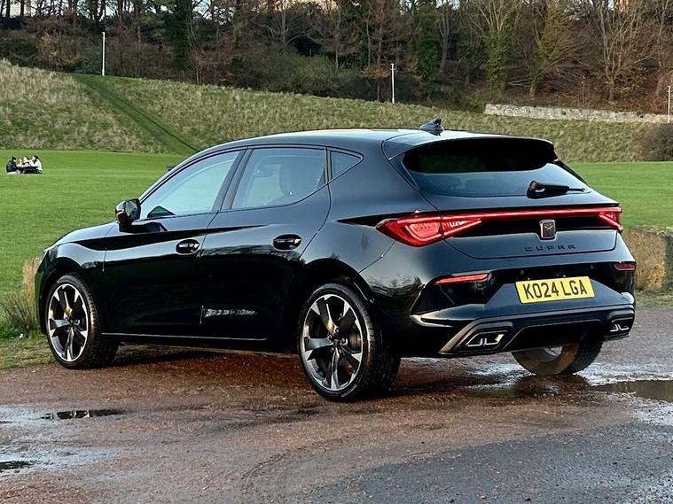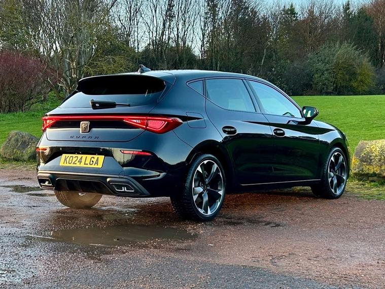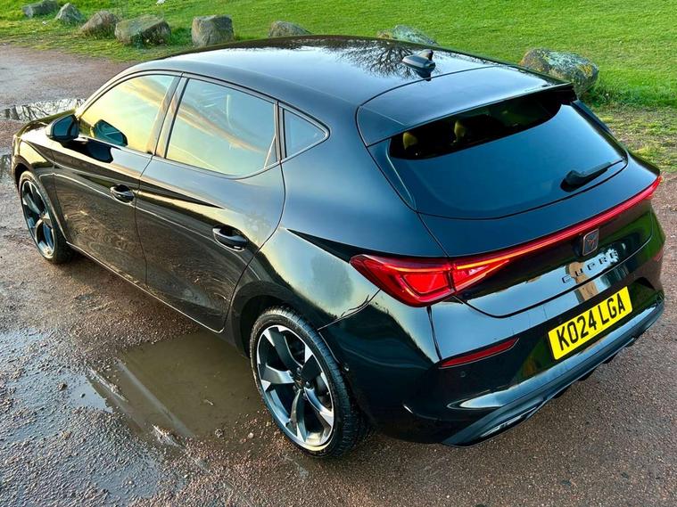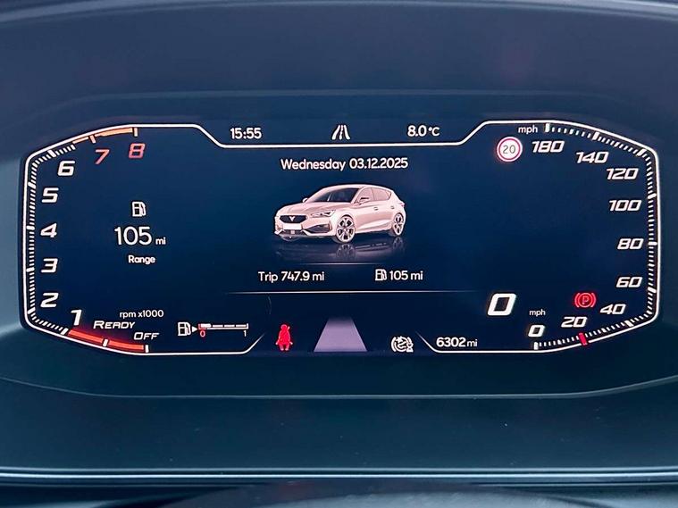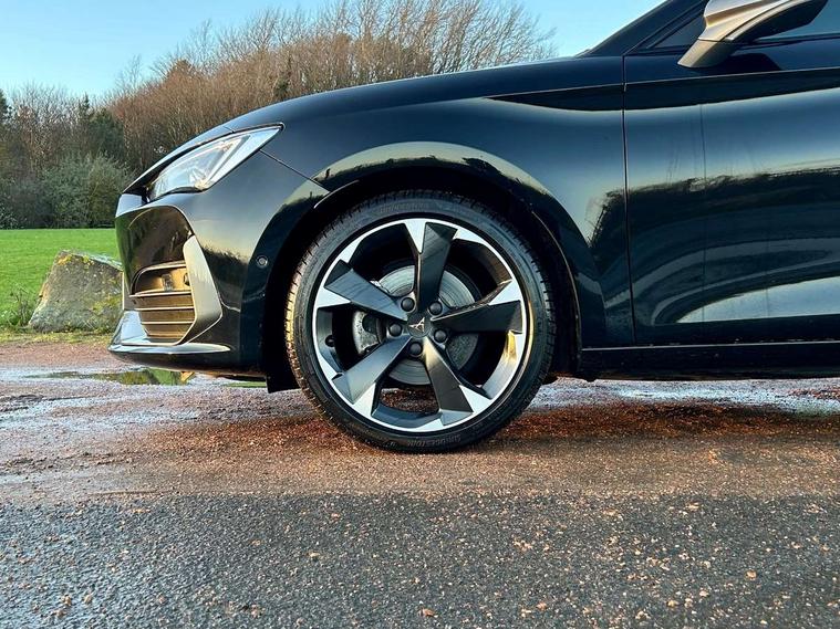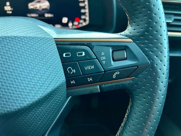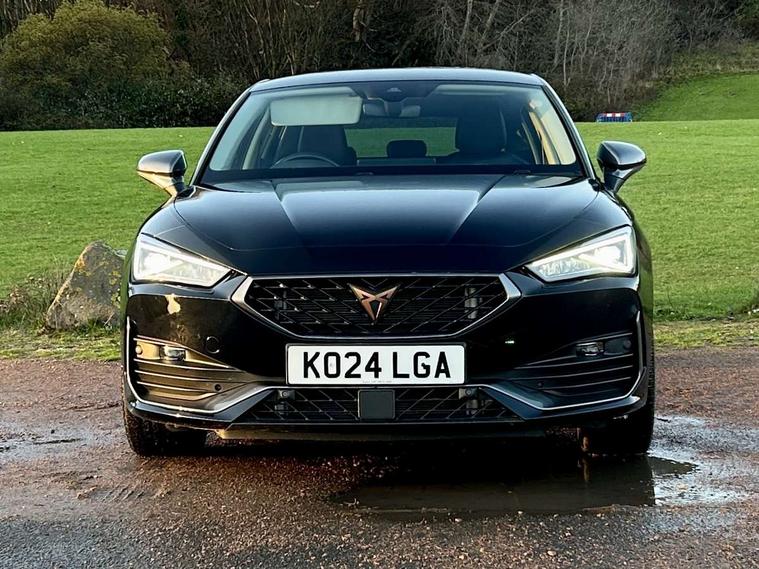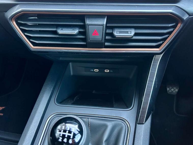 CUPRA drive profile selection with (Comfort/Sport/Individual), throttle response and gearshift mode, Digital cockpit, E-call, Electro mechanical speed sensitive power steering, Four x USB Type C ports (2 in front and 2 in rear), Front assist with forward collision warning braking reaction to vehicles, pedestrians and cyclists, Full link smartphone integration with Mirror Link, wireless Apple CarPlay and wired Google Android Auto, Lane assist, Lockable tailgate, Park assist (inc front/rear parking sensors), Rear view camera, RPM, trip computer, outside temp gauge, instrument light brightness, low fuel warning light, lights on reminder, gearshift indicator, Service interval indicator, Start/stop system with regenerative braking, Wireless phone charger, Sports suspension, Auxiliary input socket, Auto dimming rear view mirror, Body colour door handles, Body coloured bumpers, Cupra sports bumpers, Dark tinted rear windows, Electric front/rear windows, Electrically adjustable, heated and folding door mirrors, LED front fog lamps with cornering function, LED headlights with dynamic turn signals, tail lights, rear fog lights with rear coast to coast lighting, Rain sensing wipers, Rear diffuser with twin exhaust pipe on each side, Rear side wing doors, Rear wash/wipe, Separate daytime running light with automatic headlight control and coming home feature, Third brake light, 12v power supply in centre console, 3 seat bench in 2nd row, 5 headrests, 60/40 split rear bench seat with armrest, Ambient lighting with glovebox, footwell and single monocolour, Cupra Leather flat bottomed, perforated steering wheel, Driver/passenger manual seat height adjustment, Folding boot cover, Front and rear reading lights X 4, Front centre armrest, Front seats manual lumbar adjustment, Grey headlining, Height/reach adjust steering wheel, Illuminated interior front door sills, ISOFIX points in outer rear seats with top tether anchorage points, Jack and tool kit, PVC/Cloth upholstery with copper stitching, Single front passenger seat, Sports seats, Sunvisors with illuminated mirror, Three zone climate control, Media system plus with navigation pack - Leon Cupra, Safety and driving pack (M) - Cupra leon, 3 point seatbelts on all rear seats, ABS, Brake control system - ESC and brake booster, Child proof door locks, Cupra black brake calipers, Driver and front passenger airbags with front passenger airbag de-activation, front side and curtain airbags, Electronic parking brake, Extended safety system - seat belt tensioner, window closure and hazard lights, Hill hold control, Rear disc brakes, Seat belt reminder for front and rear seats, Tiredness recognition system, Tyre pressure monitoring system, Anti theft alarm system with interior monitoring in cab, backup horn and towing protection, KESSY Advanced - Keyless start, keyless entry, Locking wheel bolts, Chrome and copper interior detailing, 18" Machined sport black and silver alloy wheels with 92Y tyres,