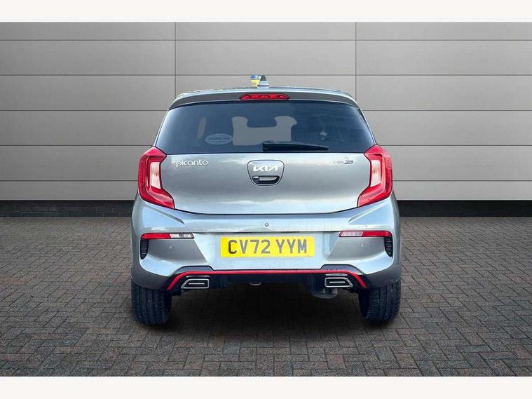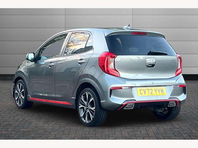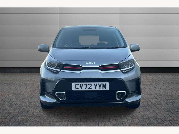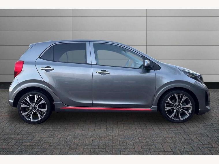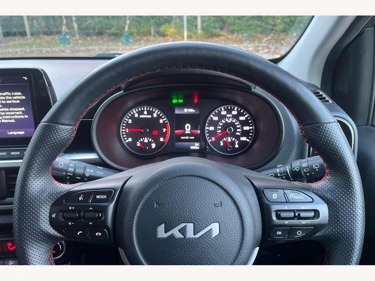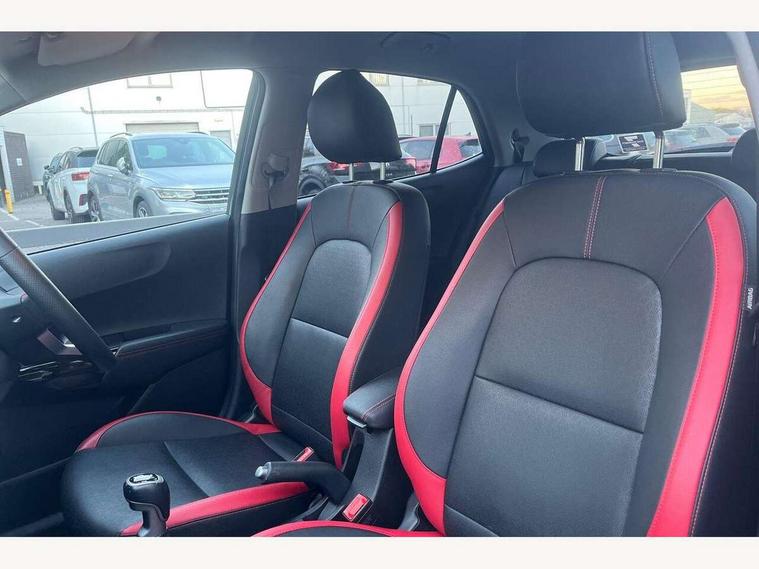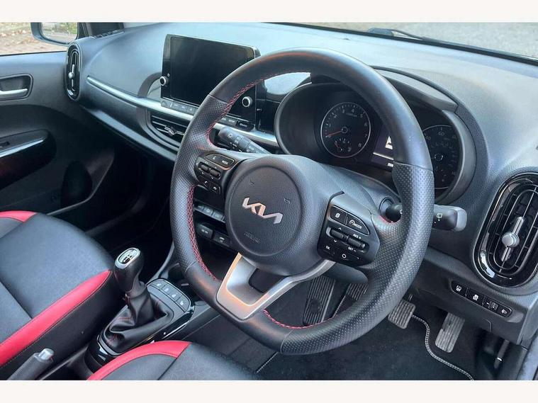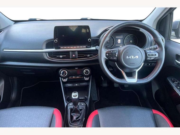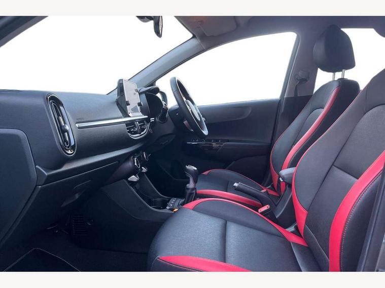 8" touch screen satellite naviagtion with RDS and DAB with telematics, Apple car play/Android Auto with voice control, Cruise control + speed limiter, Emergency call service, Emergency stop signalling system, External temperature gauge, Kia Connect (UVO), Motor driven power steering, Rear parking sensors, Reversing camera system with dynamic guidelines (Integrated into centre fascia screen), Tachometer, Trip computer, Wireless Smartphone charger, 6 speaker audio system, Bluetooth with music streaming, Steering wheel mounted controls, USB ports for connection of a media device, Automatic headlight control system, Bi-function projection headlights, Black beltline mouldings, Black grille with silver surround, Body colour B pillars, Body colour bumpers, Body colour side sill mouldings, Body coloured mirrors and chrome exterior handles, Day/night rear view mirror, Electric adjustable/heated/folding door mirrors with LED indicators lights, Front and rear electric windows with drivers's auto up/down function, Front fog lights, Headlamp levelling, Heated rear window, High mount brake light, LED daytime running lights, LED rear fog lights, Privacy glass - Rear windows and tailgate, Rain sensor, Rear side wing doors, Rear wash/wipe, Speed variable front wipers, Sports front and rear bumpers with gloss black skid plates twin exhaust, Tinted glass, Visible VIN plate, Welcome and follow-me home light functionality, 1 x rear coat hook, 12V power point front, 2 seat bench in 2nd row, 3 x passenger assist grips, 60/40 split/folding 2nd row of seats, All round height adjustable headrests, Automatic air conditioning, Black and red accents front door armrest, Centre Console with Storage Box and Sliding Armrest, Cupholders in centre console, D-cut steering wheel with red stitching, Driver and front passenger sunvisors with driver's side illuminated vanity mirrors, Driver seat height adjust, Faux leather upholstery, Front cabin lights, Glovebox, Heated front seats, Heated steering wheel, High gloss lower centre fascia trim, door armrest and air vents, ISOFIX Child seat top tethers and anchor fixings, Leather trimmed steering wheel and gearshift, Luggage area light, Luggage area parcel shelf, Passenger front seatback pockets, Satin chrome interior door handles, Single front passenger seat, Slide/reclining front seats, Tilt adjustable steering wheel, Advanced Driver Assistance Pack - Picanto, 2 x 3-point rear seatbelts, ABS/EBD, Automatic unlocking of doors in case of impact, Dual front airbags, ESC + BAS + VSM + HAC, Front passenger airbag cut-off switch, Front seatbelt height adjusters, Front seatbelt pretensioners + load limiters, Hill hold control, Knee airbags, Rear child proof door locks, Seatbelt warning, Side impact protection, Torque vectoring brake based and straight line stability (SLS), Traction control, Twin curtain airbags, Twin front side airbags, Tyre pressure monitoring system, Anti theft alarm, Engine immobiliser, Locking wheel nuts, Smart key with engine start/stop button, 16" alloy GT-Line wheels, Tyre mobility kit,