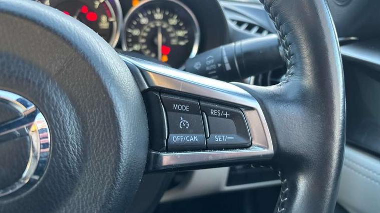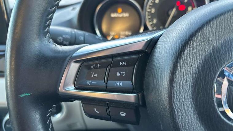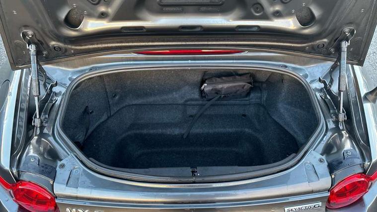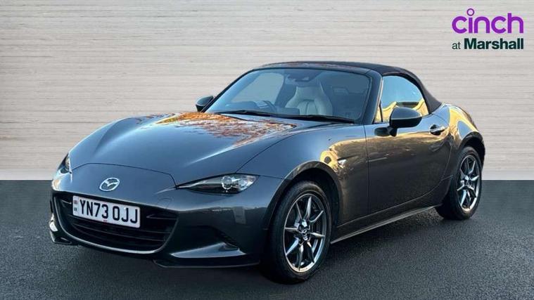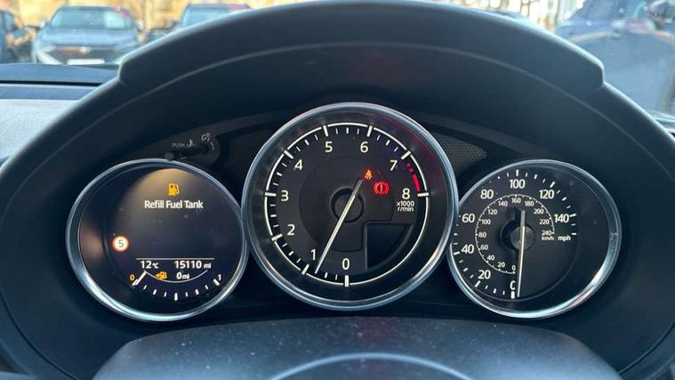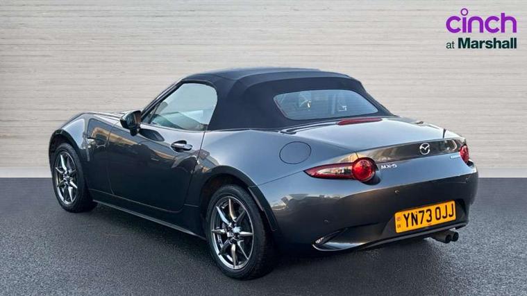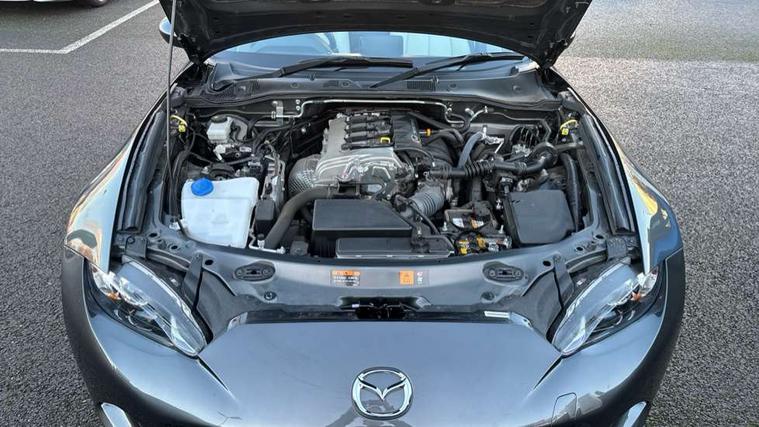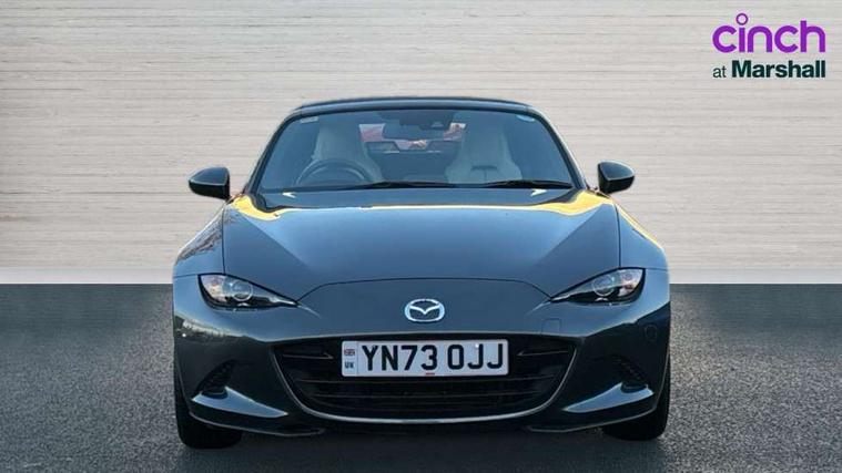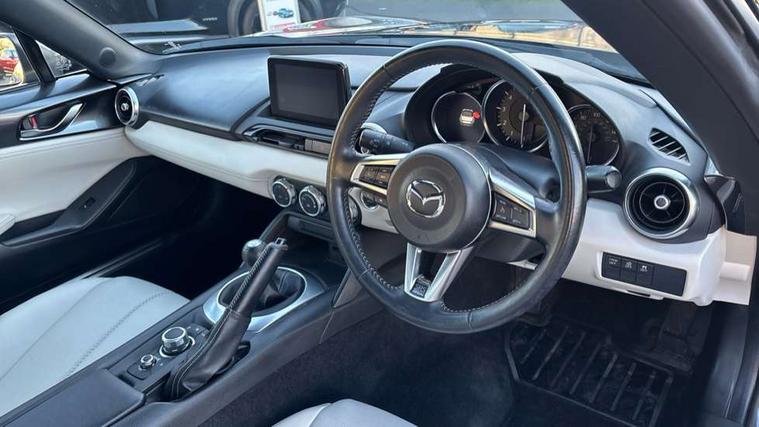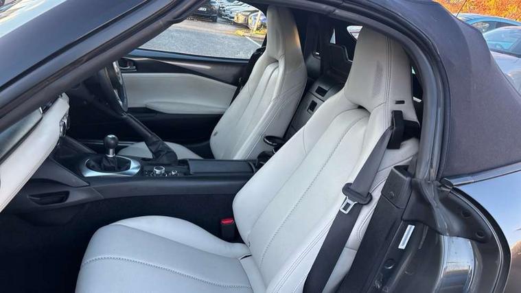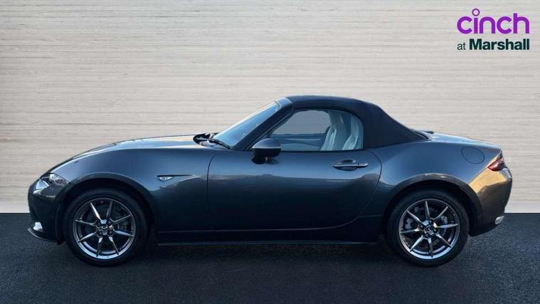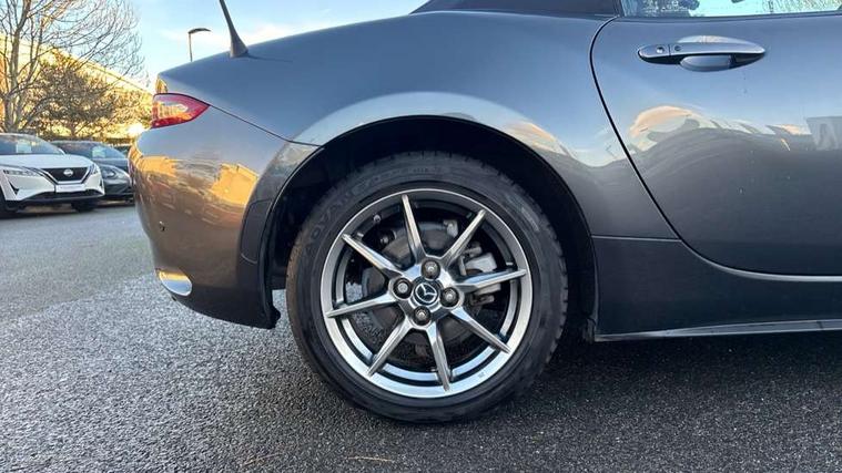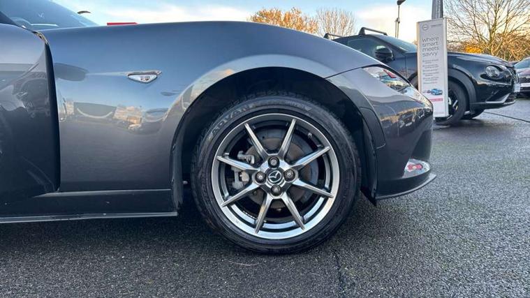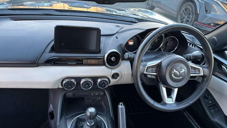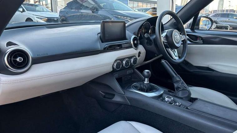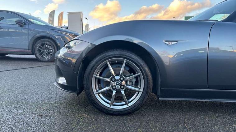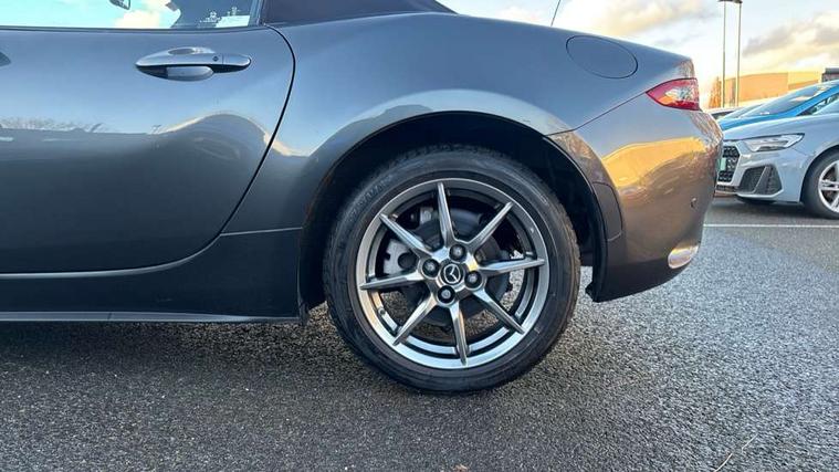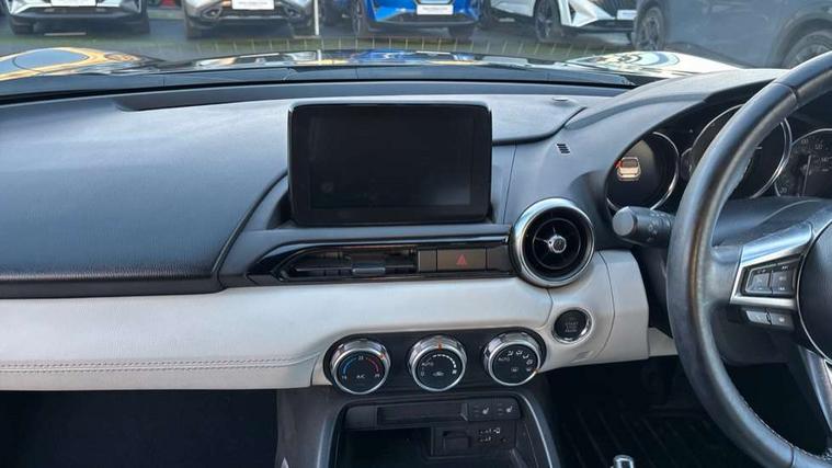 7" colour touch screen with Mazda connect infotainment, Aha and stitcher app, Analogue speedometer, Apple car play/Android Auto, Cruise control + speed limiter, Driver alert system, eCall emergency call system, Emergency stop signalling system, Engine start/stop button, Hands free phone preparation, Integrated bluetooth with hands-free calling, bluetooth audio and easy access to phone contacts, Integrated navigation system, Lane departure warning system, Multi dot display tachometer and electric odometer, PAS, Rear parking sensor, Service indicator, Traffic sign recognition, Trip computer, Water temperature gauge, Dynamic stability control, I-ELOOP, i-stop, 2 USB/aux input socket, Multimedia Commander including separate volume dial, Premium Bose sound system with 9 speakers with 2 in each front headrest, AM/FM/DAB radio and MP3, Steering wheel mounted audio/bluetooth controls, Adaptive front lighting system, Auto dimming rear view mirror, Automatic headlamp levelling, Black scuff plates with stainless steel insert, Body colour bumpers, Body colour co ordinated interior upper door trim, Body coloured electric/heated door mirrors, Coming/leaving home lighting function, Dual exhaust pipes, Dusk sensitive headlamps, Electric front windows/one touch facility, Front intermittent wipers, LED 3rd brake light, LED daytime running lights, LED Headlights, LED indicator lights, Manually operated blue premium cloth soft top with heated rear glass window, Rain sensing front wipers, Rear boot, Rear combination lights, Rear fog light, 12V socket, Black interior carpeting, Centre console storage box, Chrome Air conditioning dials, Climate control air conditioning, Coin Box, Driver and front passenger sunvisors with covered vanity mirror and driver ticket holder, Driver seat manual slide, recline and tilt adjustment, Front centre armrest, Front head restraints, Gear shift indicator, Heated front seats, in 3 heat levels, Interior courtesy light, Interior storage located behind seats, ISOFIX front passenger seat child seat compliance, Leather gear knob, Leather handbrake lever, Leather steering wheel, Lockable rear centre box with lid, Luggage compartment light, Nappa leather upholstery, Passenger seat + manual slide/recline adjust, Single front passenger seat, Tilt/telescopic steering column, Two cupholders, Windblocker, 3 point ELR front seatbelts with pretensioners, ABS+Electronic Brake force Distribution, Deployable Hood System (DHS), Driver and front passenger airbags, Driver and passenger seatbelt reminder audible warning, Hill hold assist, Passenger airbag deactivate switch, SCBS - Smart City Brake Support, rear plus front with autonomous emergency braking, Side airbags, Traction control, Tyre pressure monitor, Remote central locking with deadlocking and remote boot release, Smart keyless entry, Superlocking, Thatcham category 1 alarm + immobiliser, Chrome air vent surrounds, Dashboard panel - light stone vinyl, 16" Bright Silver alloy wheels, Tyre puncture repair kit,