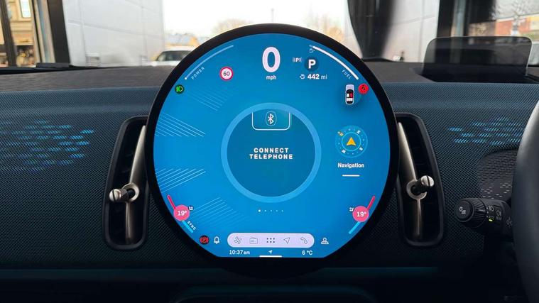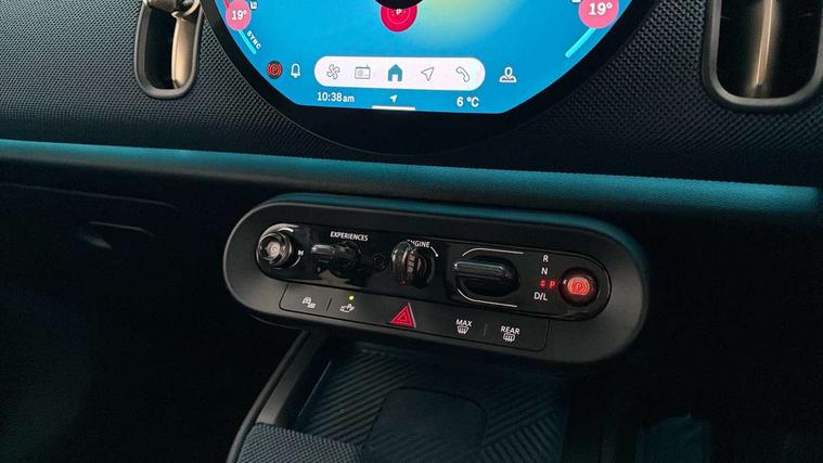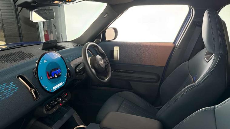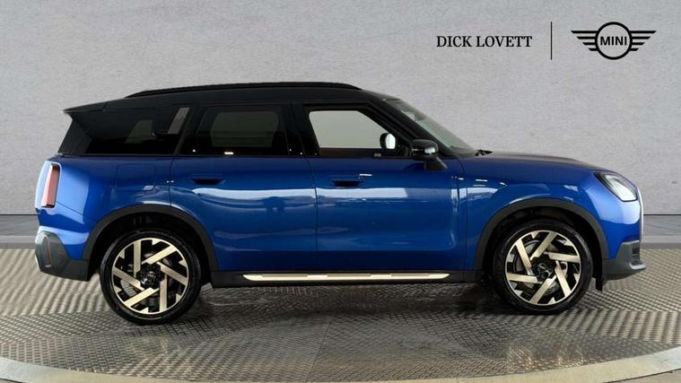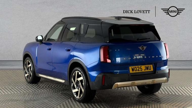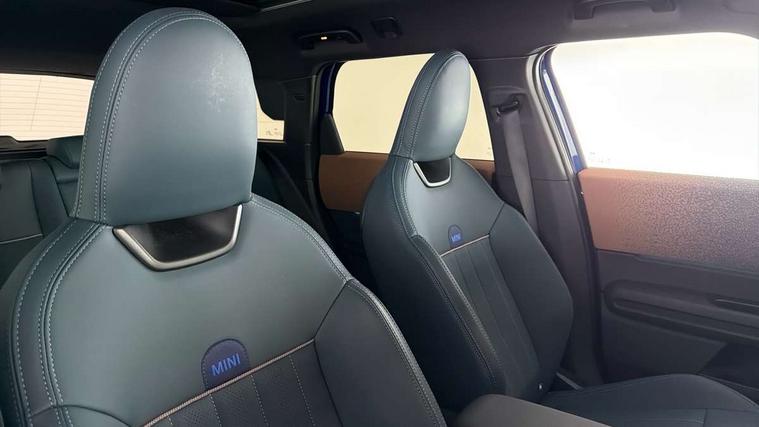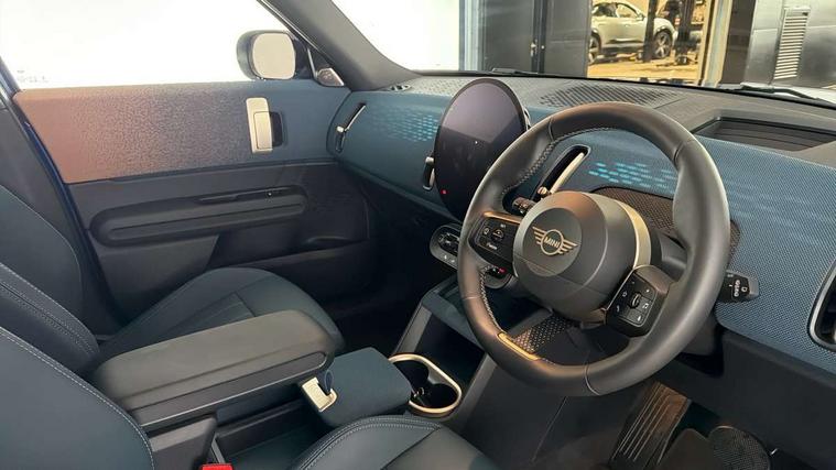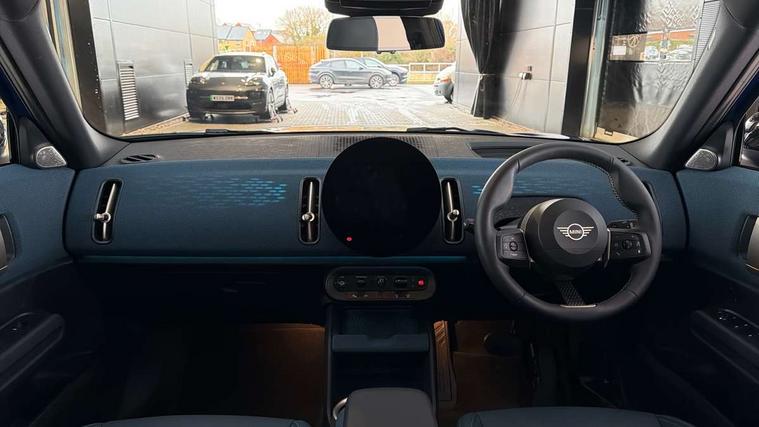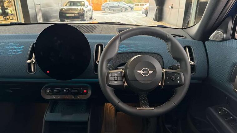 Bluetooth connection, Circular OLED Screen, Compatible mobile phone bluetooth with audio streaming, Cruise Control (DCC), Digital dashboard display, Driving assistant, Driving Assistant Plus Preparation, E-call, Electro-mechanical speed dependant steering assistance, MINI Experience Modes, MINI Head up display, Mini navigation system, MINI TeleServices, Parking assistant in camera and ultrasound based assistance system, rear view camera, parking aid and distance control, Auto transmission with Paddles, Larger capacity fuel tank, 6 speakers, DAB Digital radio, Personal eSim, Auto tailgate, Electric adjustable heated door mirrors, Front and rear electric windows, Heated rear window, High beam assistant, Interior rear-view mirror with automatic anti-dazzle function, LED daytime running lights, LED headlights with extended contents including Adaptable light signatures, LED rear lights, LED third brake light, Logos in Vibrant Silver, Rain sensor with auto headlights, Rear side wing doors, Rear window wiper, Roof rails, Vibrant silver grille surround, 3 Seat sliding rear bench in 2nd row, 60/40 split rear bench seat, Anthracite headliner, Auto air conditioning, Driver and front passenger seat heating, Floor mats, Front armrest, Front headrests, Front sport seats, Heated steering wheel, Height and length steering column adjustment, Lidded storage box in Petrol knit, Luggage compartment separating net, Rear headrests, Seat adjustment for rear seats, Single front passenger seat, Sport Vescin Steering Wheel, Sunvisors with vanity mirrors, Vescin synthetic leather upholstery, Vibrant Silver sill inlay, Wireless charging tray, Interior and exterior mirror package - Mini Countryman, 3x3 point rear seat belts, 6 Airbags - front, side, head and seat belt tensioners, ABS, DSC - Dynamic Stability Control, Electronic handbrake, Electronic Stability Programme (ESP), Front ISOFIX (iSize), Hill descent control, Hill hold assist, Hill start assist, Manual rear child locks, Traction control, Tyre pressure monitoring system, Warning triangle, Alarm system with tilt sensor, monitoring doors, bonnet interior and tailgate, Auto drive away locking, Comfort access system, Deadlocking function, Electronic vehicle immobiliser, Locking wheel bolts, Remote control locking, Start/stop toggle with keyless go, Petrol/Brown dashboard knit, MINI Mobility Kit,