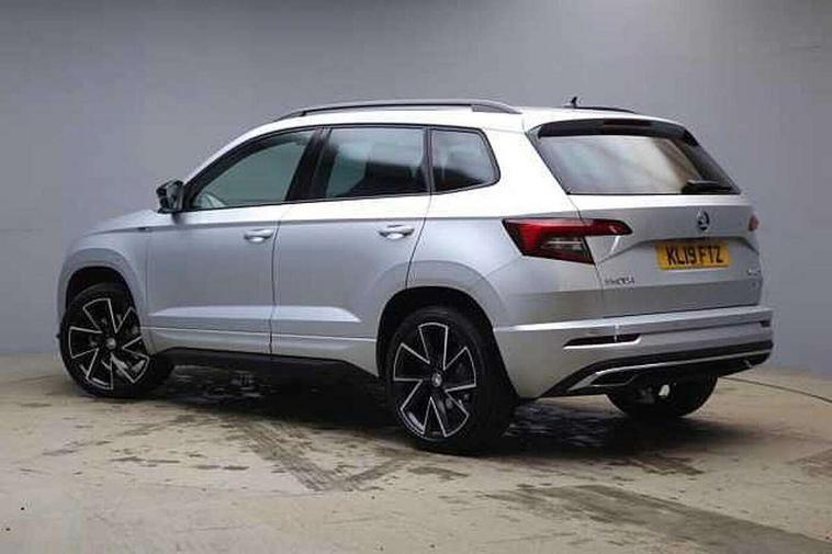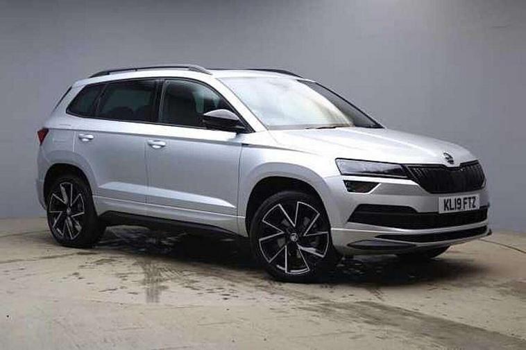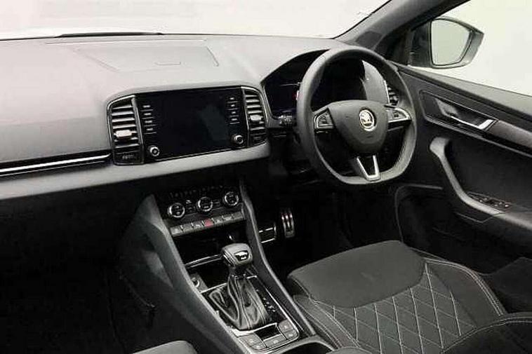 Driver alert system, Driver fatigue sensor, Driver profile selection, Multifunction colour trip computer, Outside temperature gauge, Personalisation of drive mode selection with off road includes 3 keys, Rear view camera, Service interval indicator, Start/stop system with regenerative braking, DAB radio with Bluetooth, SD card slot, USB connection, Acoustic glass, Aero front windscreen wipers with intermittent function, Automatic headlight control system, Black roof rails and door mirrors with radiator grille, Body colour door mirrors and handles, Chrome outside aluminium bar around the window, Electric front and rear windows with child proof lock, Electrically adjustable heated folding and auto dimming door mirrors with boarding spots, Front door steps with SportLine logo, Full LED headlights + adaptive front light system + LED daytime running lights and front cornering fog lights, Headlight washers, Heated rear windscreen, LED rear lights with high functionality, Light assistant (coming/leaving home/tunnel light), Panoramic sliding sunroof, Privacy glass, Protective door side sills in body colour, Rear diffuser, Safety reflectors on front doors, Sportline badge on front fender, Sportline decorative inserts with badging, Sports front and rear bumpers, Third brake light, 1.5 litre bottle holders in driver and front passenger door panels, 12V socket in boot, 12v socket in front centre armrest with storage compartment and rear air vents, 2 Folding hooks and nets in boot, 2 Front readings lights for driver and passenger, 3 rear height adjustable headrests, 4 foldable roof handles with rear coat hooks, 4 lashing points on luggage floor, Aluminium pedals, Backrest release, Black roof headlining, Cargo elements in boot, Chrome inner door handles, Driver and passenger seats height adjust, Dual zone climate control, Front seat and rear pockets, Height adjustable front three point seats belts with tensioners, Height/reach adjust steering wheel, Ice scraper, Illuminated and cooled glovebox, Illuminated luggage compartment, Isofix child seat preparation outer rear, Manual lumbar support for front seats, Net programme in boot, Pen holder, Pollen filter, Rear boot cover, Rear reading lights, Rear seats fixed folding and divided 60:40, Removable LED torch in the boot, Retractable parcel shelf attachable to tailgate, Safety vest holder, Seatbelt reminder signalisation and pretensioner for all seats, Storage box in upper central dashboard closed, Storage compartment below the passenger seat, Storage net on centre console passenger side, Sunvisors with illuminated vanity mirrors, Textile floor mats, Umbrella under passenger seat, Welcome animation with sportline logo, LED Interior lighting pack with Skoda welcome logo - Karoq, Airbags - Front side, head, knee and curtain, Automatic door unlocking in case of crash, Automatic fuel cut off in case of crash, Driver airbag, Electronic parking brake with auto hold function, Emergency rear braking signal, ESC including ABS, MSR, ASR, EDS, HBA, DSR, RBS, MKB and traction control, Front assist radar scanning of the space in front of the car with automatic braking, Hill hold control, Passenger airbag with switch-off function, Pedestrian monitor, Three point seatbelts rear, Two tone horn, Tyre pressure display, Tyre pressure monitor, Alarm with interior monitoring, back up horn and tilt sensor with safe function, Electronic engine immobiliser, Keyless entry and keyless start with safe system, Remote central locking with 2 remote folding keys, Chrome framed air vents, 19" Vega anthracite alloy wheels, Anti-theft wheel bolts protection, Storage on wheel cover,
