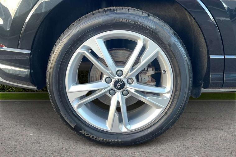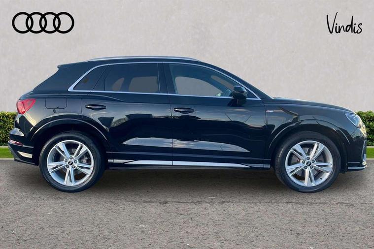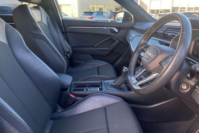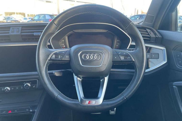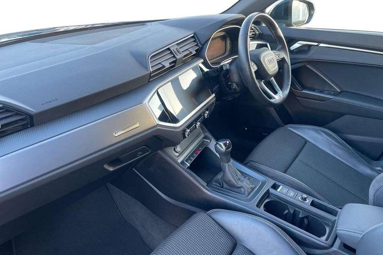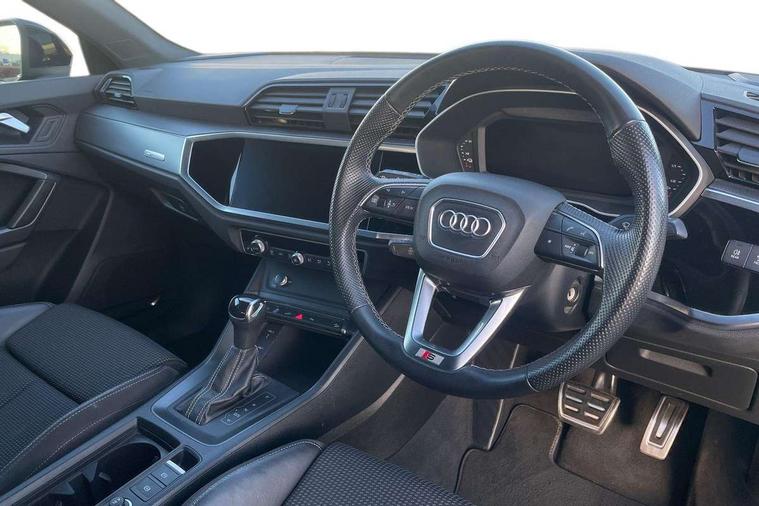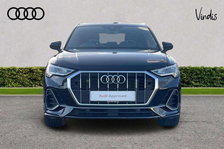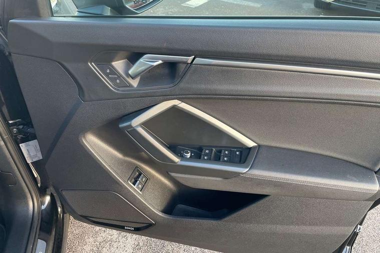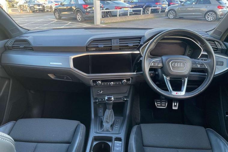 Amazon alexa Integration, Audi drive select, Audi lane departure warning, Audi Virtual Cockpit - 10.25" display, Bluetooth interface, Camera based traffic sign recognition, Legal emergency call, MMI Navigation Plus with high resolution 10.1 inch touchscreen colour display, Power operated tailgate, Progressive steering, Service interval indicator, Smartphone interface includes wireless Apple carplay/Android Auto, Start stop system with recuperation, Voice control system with natural language interaction, 3 pin 10 amp domestic charging cable, 3.6 kw On-board charger, Type 2 mode 3 32 amp charging cable, Type 2 socket for AC charging, 2 USB-C ports with charge and data functions, 6 passive loudspeakers, DAB digital radio module, Acoustic windscreen, Aluminium roof rails, Aluminium window trim, Auto dimming frameless rear view mirror, Body colour front spoiler blade, Body coloured bumpers, Electrically folding, adjustable and heated door mirrors with integrated LED side indicators and kerb view function for passenger side, Front and rear electric windows, Front fog lights, Front side air inlets in matt platinum grey, Grille vertical bars in aluminium silver/Matt, High gloss black finish B and C pillars, LED Dynamic rear indicators, LED headlights with LED daytime running lights, LED rear lights, LED third brake light, Privacy glass dark tinted rear and rear-side windows (from B-pillar backwards), Rain and light sensors, Rear diffuser grille in grained matt black, Rear diffuser strip in matt titanium black, Rear side wing doors, Rear wiper, S line badges on front wings, S Line front and rear bumpers, Side skirt insert in matt Platinium grey, Titanium black radiator grille, Variable front intermittent wipers, 12V socket in rear centre console, 3 seat bench in 2nd row, 40:20:40 folding with manual adjustment for 60:40 forwards/backwards position and backrest angle, Adjustable rear seat bench/backrest with centre armrest and cupholder, Black cloth headlining, Dual zone electronic climate control, Front and rear black floor mats with contrast stitching in rock grey, Front and rear headrests, Front and rear roof module including reading lights, Front centre armrest, Glove compartment lighting, Height and reach adjustable steering wheel, Illuminated door sill trims with S logo, ISOFIX child seat mounting for front passenger with airbag deactivation and outer rear seat including top tether attachment point for outer rear seats, Luggage compartment light, Manual front seats with height adjustment, Perforated leather gearknob, Single front passenger seat, Stainless steel luggage compartment sill finisher, Stainless steel pedals, Ambient lighting pack - Q3, Non smoking pack - Q3, 3x3 point rear seatbelts, 6 airbags - Driver, front passenger, curtain and side windows, Audi pre-sense front with pedestrain and cyclist recognition, Electrically operated child locks on rear doors, Electromechanical parking brake, Electronic stabilisation control including ABS, ASR and EDL, Front seatbelt reminder, Hill descent control, Hill hold assist, Pre sense basic, Seatbelt monitoring, Tyre pressure warning, Warning triangle and first aid kit, Anti theft alarm, Anti theft wheel bolts, Immobiliser, Remote central locking, Dark matt brushed aluminium inlay, Detail dashboard around MMI touch colour display in glass look, black with surround in aluminium look, Leatherette door armrest, Tool kit, Tyre repair kit,