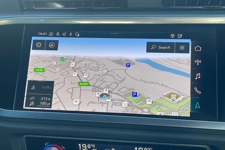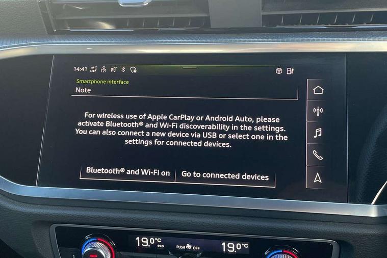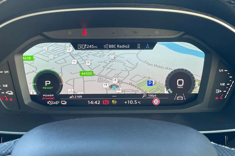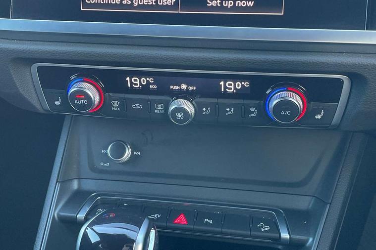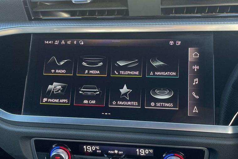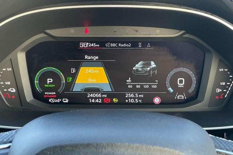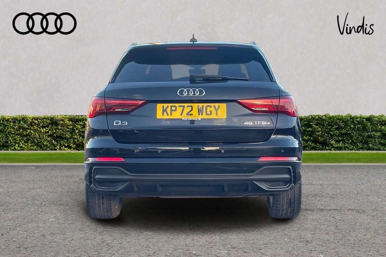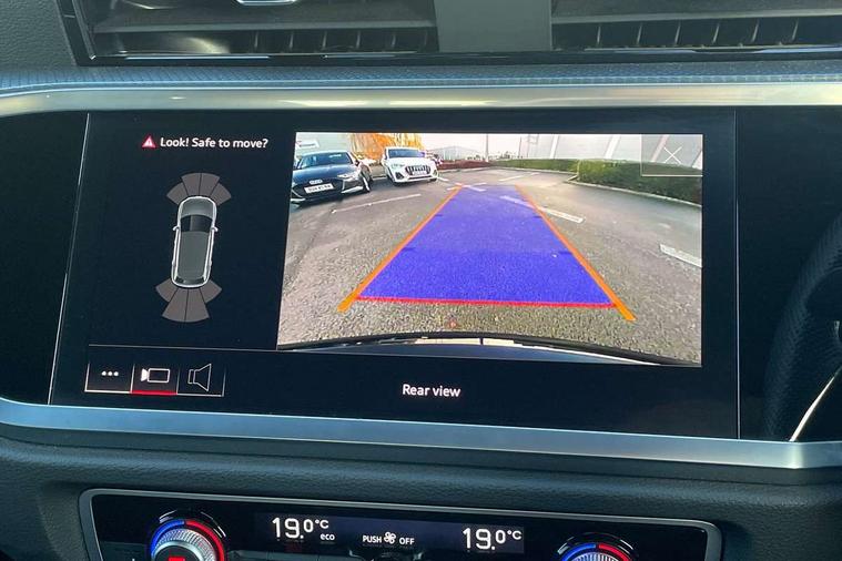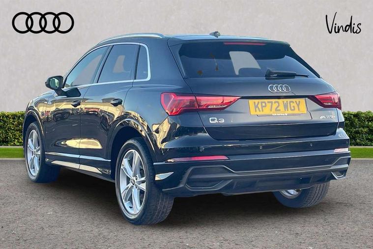 Amazon alexa Integration, Audi drive select, Audi lane departure warning, Audi Virtual Cockpit - 10.25" display, Bluetooth interface, Camera based traffic sign recognition, Legal emergency call, MMI Navigation Plus with high resolution 10.1 inch touchscreen colour display, Power operated tailgate, Progressive steering, Service interval indicator, Smartphone interface includes wireless Apple carplay/Android Auto, Start stop system with recuperation, Voice control system with natural language interaction, 3 pin 10 amp domestic charging cable, 3.6 kw On-board charger, Type 2 mode 3 32 amp charging cable, Type 2 socket for AC charging, 2 USB-C ports with charge and data functions, 6 passive loudspeakers, DAB digital radio module, Acoustic windscreen, Aluminium roof rails, Aluminium window trim, Auto dimming frameless rear view mirror, Body colour front spoiler blade, Body coloured bumpers, Electrically folding, adjustable and heated door mirrors with integrated LED side indicators and kerb view function for passenger side, Front and rear electric windows, Front fog lights, Front side air inlets in matt platinum grey, Grille vertical bars in aluminium silver/Matt, High gloss black finish B and C pillars, LED Dynamic rear indicators, LED headlights with LED daytime running lights, LED rear lights, LED third brake light, Privacy glass dark tinted rear and rear-side windows (from B-pillar backwards), Rain and light sensors, Rear diffuser grille in grained matt black, Rear diffuser strip in matt titanium black, Rear side wing doors, Rear wiper, S line badges on front wings, S Line front and rear bumpers, Side skirt insert in matt Platinium grey, Titanium black radiator grille, Variable front intermittent wipers, 12V socket in rear centre console, 3 seat bench in 2nd row, 40:20:40 folding with manual adjustment for 60:40 forwards/backwards position and backrest angle, Adjustable rear seat bench/backrest with centre armrest and cupholder, Black cloth headlining, Dual zone electronic climate control, Front and rear black floor mats with contrast stitching in rock grey, Front and rear headrests, Front and rear roof module including reading lights, Front centre armrest, Glove compartment lighting, Height and reach adjustable steering wheel, Illuminated door sill trims with S logo, ISOFIX child seat mounting for front passenger with airbag deactivation and outer rear seat including top tether attachment point for outer rear seats, Luggage compartment light, Manual front seats with height adjustment, Perforated leather gearknob, Single front passenger seat, Stainless steel luggage compartment sill finisher, Stainless steel pedals, Ambient lighting pack - Q3, Non smoking pack - Q3, 3x3 point rear seatbelts, 6 airbags - Driver, front passenger, curtain and side windows, Audi pre-sense front with pedestrain and cyclist recognition, Electrically operated child locks on rear doors, Electromechanical parking brake, Electronic stabilisation control including ABS, ASR and EDL, Front seatbelt reminder, Hill descent control, Hill hold assist, Pre sense basic, Seatbelt monitoring, Tyre pressure warning, Warning triangle and first aid kit, Anti theft alarm, Anti theft wheel bolts, Immobiliser, Remote central locking, Dark matt brushed aluminium inlay, Detail dashboard around MMI touch colour display in glass look, black with surround in aluminium look, Leatherette door armrest, Tool kit, Tyre repair kit,