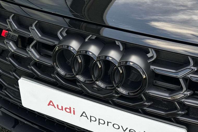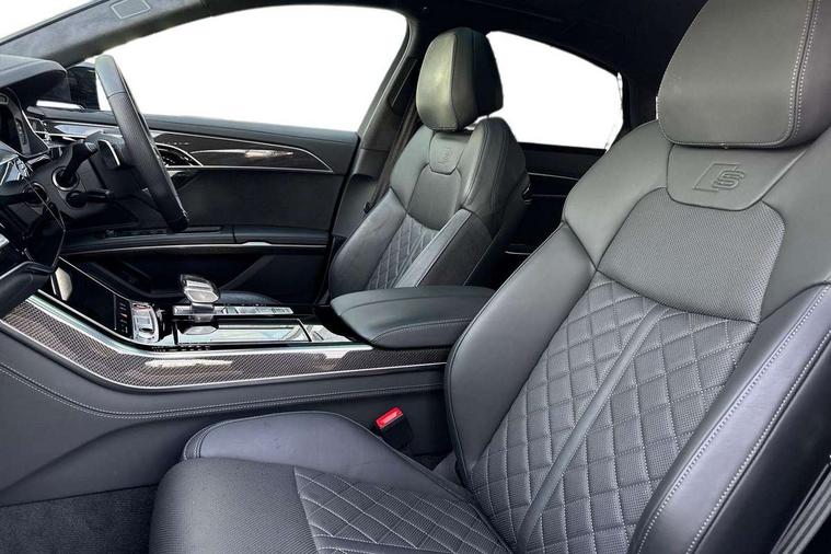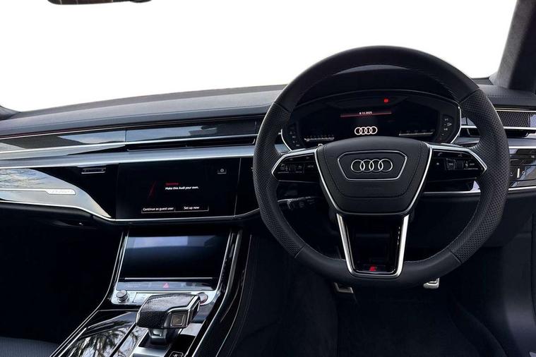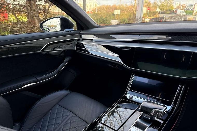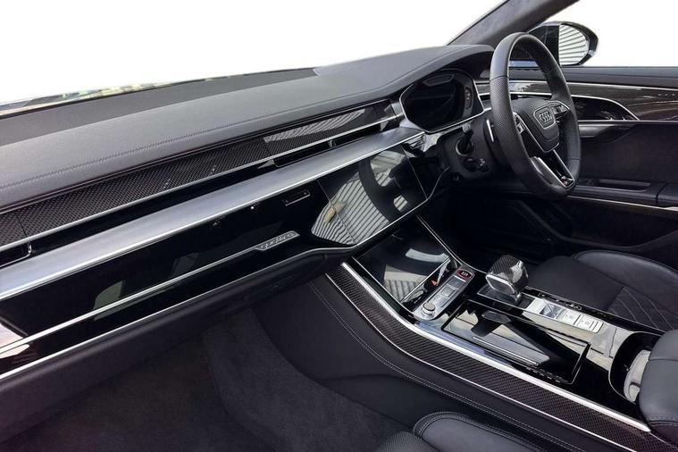 'Lights On' Reminder warning buzzer, 360 degree camera with top view, Active noise cancellation, Adaptive cruise control with cruise assist, emergency assist, efficiency assist, swerve assist, turn assist and speed limiter, Audi connect safety and service (e-call), Audi drive select, Audi smartphone interface with app store includes wireless Apple carplay, Android auto and Amazon alexa integration, Audi virtual cockpit plus, Bluetooth interface, Camera based traffic sign recognition, Convenience key, Dynamic all wheel steering, Head up Display, MMI navigation plus with MMI touch + Twin touch screens with haptic feedback, Operating buttons in black, glass look with haptic feedback including extended aluminium look, Parking assist plus with remote parking, Power door closure, Power operated tailgate, Remote fuel filler release, Service interval indicator, 48V Mild hybrid technology, 8 speed transmission with hill hold assist, 82 litre fuel tank, Predictive active suspension, Quattro all wheel drive with sport differential, Audi music interface, DAB digital radio module, DVD System, MMI radio plus, USB connection, Acoustic double glazing, All-weather, manoeuvring, position, static cornering, turning and motorway lights with automatic dynamic headlight range control, Audi space frame, Auto dimming rear view mirror, Body colour bumpers, Body colour door handles, Body colour side protection with aluminium trim strips, Digital matrix LED headlights with lane light, direction indicator, extended traffic information and extended light sequencing, Dynamic front and rear indicators, e-tron signature in DRL and dipped beam, Electric front windows, Electric rear windows with isolation switch, Electric sunblinds for rear window and rear door windows, Electrically adjustable heated folding + automatically dimming exterior mirrors with memory function and integrated LED indicators, Front wash/wipe with interval delay, Headlight cleaning system, Heat insulating glass in side and rear windows, Heat insulating glass windscreen, Heated rear window, Heated windscreen washer jets, High beam assist, LED brake lights, LED daytime running lights, LED third brake light, OLED rear lights with changeable rear light signature, Privacy glass, Rear boot, Rear side wing doors, Side skirts, Welcome/leaving lighting, 12V socket, 2 zone automatic air conditioning, 3 seat rear bench with centre armrest in 2nd row, 4 way electric lumbar support for driver and front passenger, Audi phone box light, Black dinamica microfiber headlining, Carbon gear selector, Centre console with cupholders, Comfort centre armrest, Door pockets with bottle holder, Driver and front passenger side sunvisors with illuminated vanity mirrors, Dust/pollen filters, Electric front seats with memory function, Front floor mats, Glove compartment cooling, Heated front seats, Height/reach electric steering column with easy exit function, Illuminated door sill trims with aluminium inlays and S diamond emblem, Isofix child seat mounting points on outer rear seats, Leather gearknob, Passenger footwell storage net, Reading lights, Rear floor mats, Rear headrests, Roof mounted sunglasses holder, Single front passenger seat, Stainless steel pedals and footrest, Valcona leather upholstery with front sports seats in diamond quilted with S embossed logo, Black exterior styling pack - A8 Black Edition, Extended LED Interior multi coloured light pack - A8, Exterior style pack - S8, 3 point seatbelts on all rear seats, ABS/EBD, Active front headrest system, ASR traction control, Audi pre sense basic, Audi pre sense front, Driver/Front Passenger airbags, EDL traction control, Electromechanical parking brake, ESP, Extended pedestrian protection measures, Front and rear disc brakes, Front and rear side airbags with head airbag system, Front passenger airbag deactivation, Rear child proof door locks, Seatbelt reminder + electric contact in buckle + advanced safety equipment, Tyre pressure loss indicator, Warning triangle and first aid kit, Anti theft alarm tow away protection, Anti-theft wheel bolts and wheel loosening detection, Remote central locking, Carbon vector upper inlays, Dark matt brushed aluminium lower inlays, Tyre repair kit,
