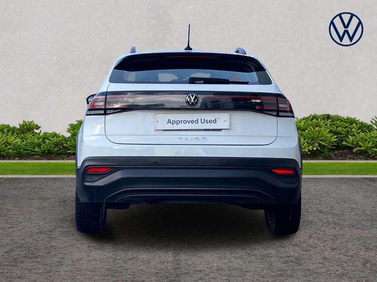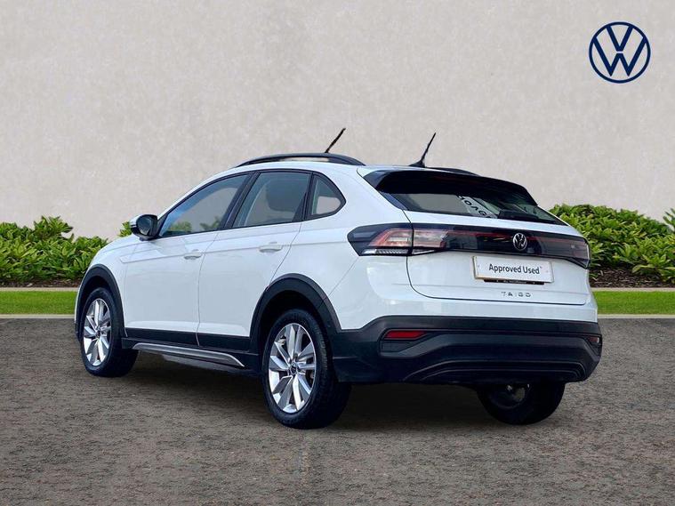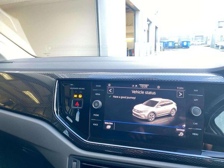 App-Connect including App-Connect Wireless, Driver alert system, e-Call (emergency call), Power Steering, Travel assist including emergency assist, Washer fluid level indicator, Wireless Charging including Bluetooth, Start-stop system with battery regeneration (recuperation - energy recovery during braking), Digital radio reception (DAB+), Diversity antenna for FM reception, WeConnect plus, Aspherical driver's exterior mirror, Auto headlights, Body coloured bumpers, Body coloured exterior mirror housings and door handles, Electric windows, External USB type C socket and charging sockets, Front fog lamps with cornering function, Headlight range control, Heat insulating glass windscreen, LED headlamps, LED rear combination lamp, LED third brake light, Left convex exterior mirror, Power folding adjustable/heated exterior mirrors and front passenger exterior mirror lowering function, Rear fog light on one side, reversing light on both sides, Rear side wing doors, Rear wash/wipe with intermittent wipe setting, 'Slash/ Austin' Cloth upholstery, 12V socket in centre console, 2 front reading lights, 3 rear head restraints, 3 seat bench in 2nd row, Ambient lighting with logo projection, Black carpets, Child seat anchor for child seat system i-Size, 2x top tether, and child seat anchor in front on front passenger side, Door and side trim panels in titan black, Driver and front passenger seat height adjustment, Front centre armrest, Handbrake lever handle in leather, Height and reach adjustable steering wheel, Leather trimmed gear knob, Leather wrapped multifunction steering wheel, Luggage compartment floor, Luggage compartment light, Lumbar support for driver's and front passengers seat, Seat covers in titanium black, Single front passenger seat, Split folding backrest with centre armrest and unsplit rear seat bench, Storage compartment under front seats, Sun visors with illuminated vanity mirrors, Chrome Package - Taigo, Drivers assistance pack - Taigo, Light and Sight pack including High beam assist - Taigo, 2 x 3-point seatbelts/outer rear seats with ECE label, 3-point seat belts in front with pretensioner and height adjustment, 3-point seatbelt for centre rear seat, Driver and front passenger airbags with front passenger airbag de-activation, front side and curtain airbags, Driver and front passenger safety-optimised head restraints, Electronic stability control, Extended and predictive pedestrian/ cyclist protection, Front and rear disc brakes, Front curtain and side airbags with center airbag, Hill start assist, Manual rear child locks, Single tone horn, Tyre pressure loss indicator, Anti-theft alarm system with interior monitoring, backup horn, and towing protection, Anti-theft wheel bolts, Lava stone black gloss/matt decorative inserts in dash and front door panels, Low rolling resistance tyres,